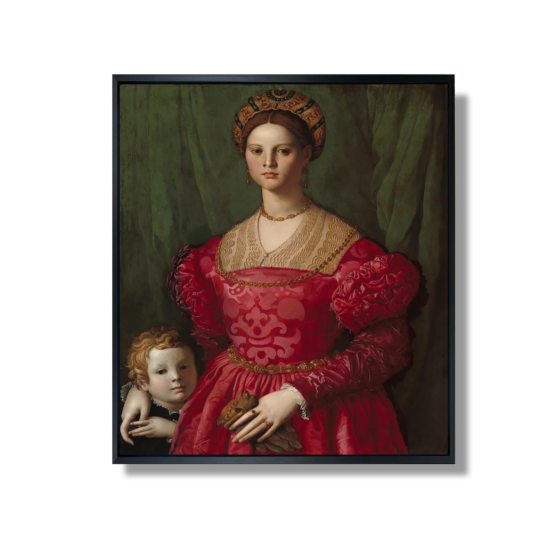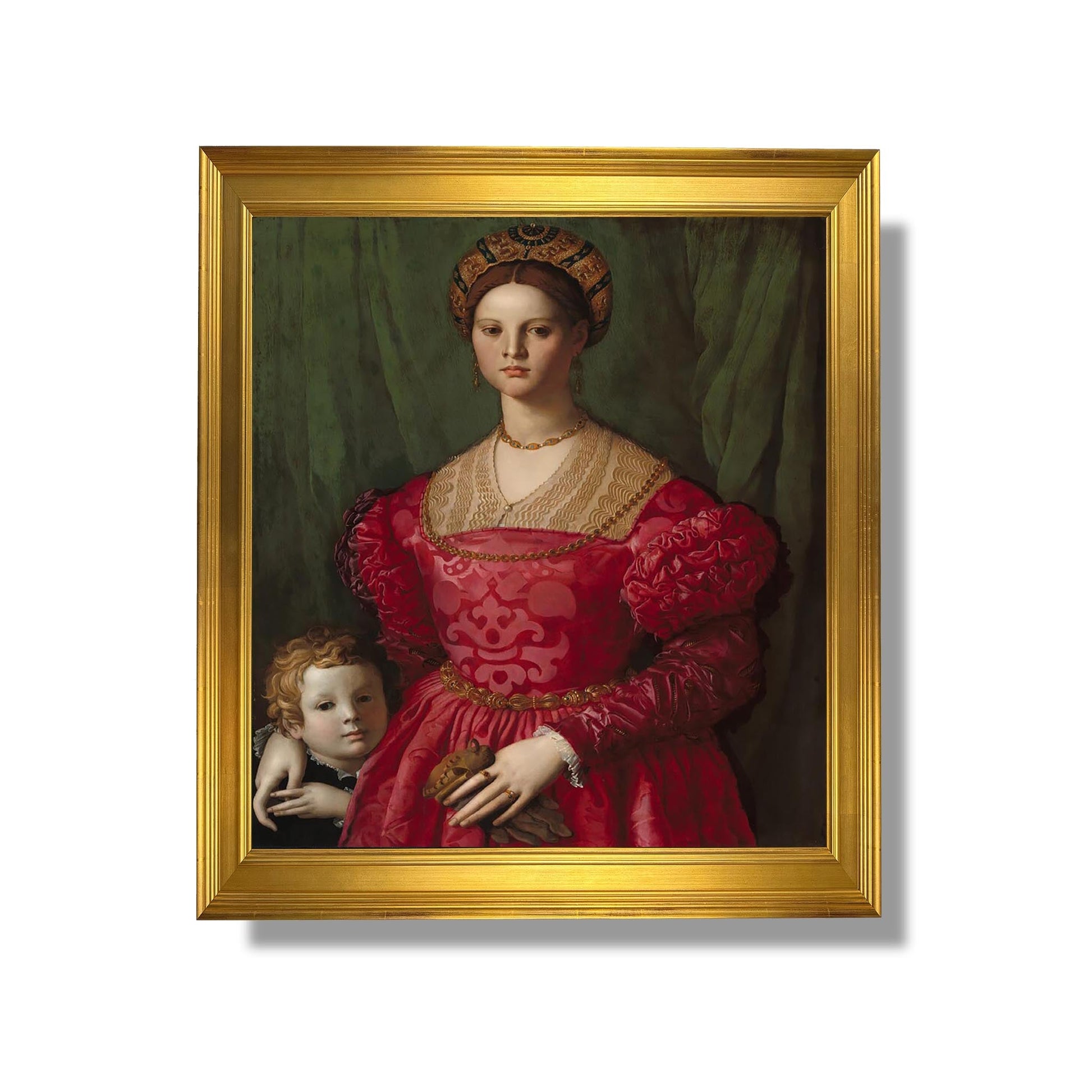 "A Young Woman and Her Little Boy" est une œuvre emblématique du peintre italien Agnolo Bronzino, réalisée au XVIe siècle. Ce tableau, typique de la Renaissance, illustre une mère et son enfant dans une pose intimiste et affectueuse. La femme, vêtue d'une robe richement ornée, dégage une élégance et une sérénité, tandis que l'enfant, blotti contre elle, incarne l'innocence et la tendresse. Bronzino utilise des couleurs vives et des détails minutieux pour accentuer la beauté des personnages. Cette œuvre témoigne de l'importance des liens familiaux et de la représentation de la maternité dans l'art de la Renaissance.