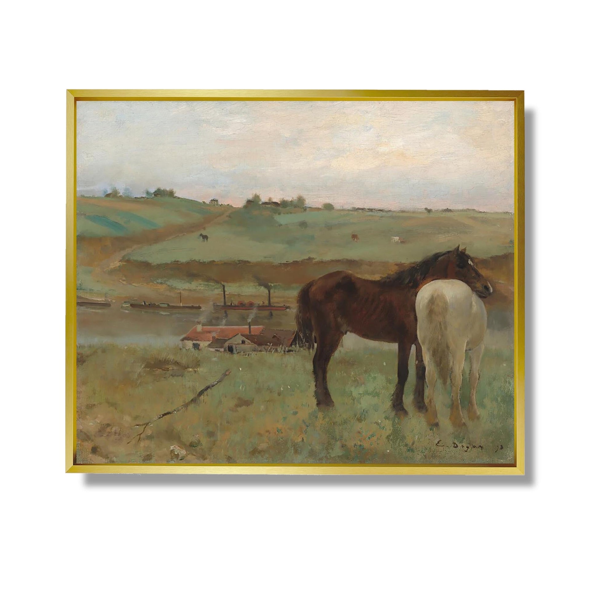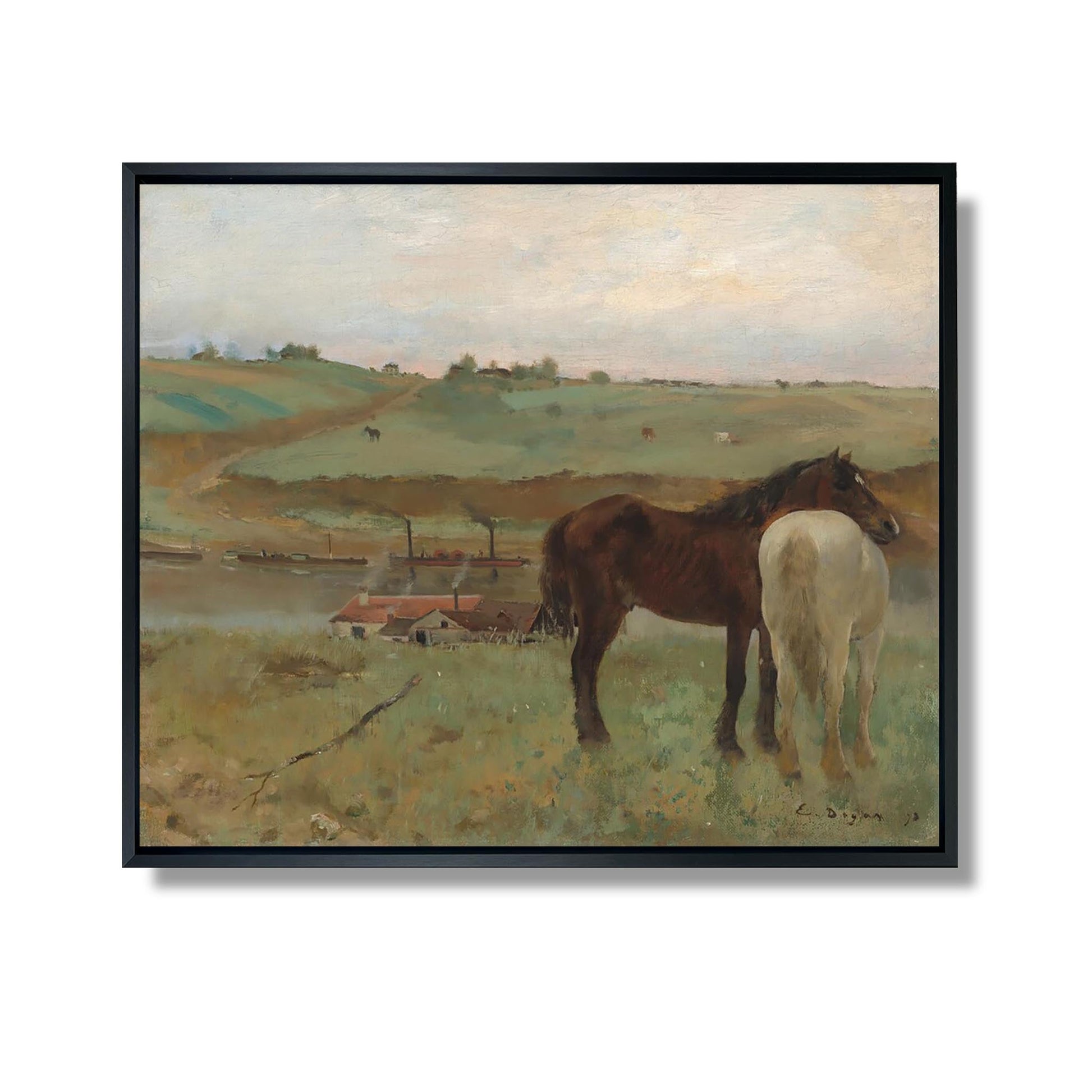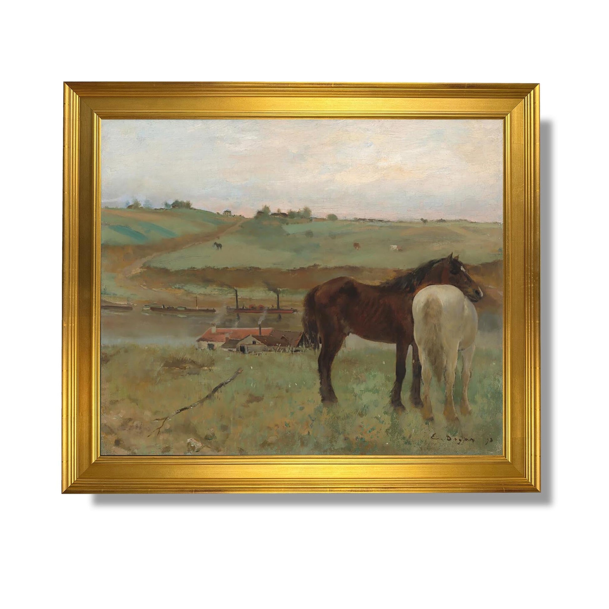 "Chevaux dans un pré" est une œuvre emblématique d'Edgar Degas, réalisée en 1885. Ce tableau illustre la passion de l'artiste pour le mouvement et la vie quotidienne, capturant des chevaux paisiblement rassemblés dans un pré verdoyant. Degas, connu pour son approche innovante de la composition, utilise des couleurs vives et des coups de pinceau dynamiques pour transmettre une sensation de vitalité. L'œuvre reflète son intérêt pour la nature et les animaux, tout en intégrant une touche de réalisme. Ce tableau témoigne de la maîtrise de Degas dans l'observation et la représentation du mouvement, faisant de lui un pionnier de l'impressionnisme.