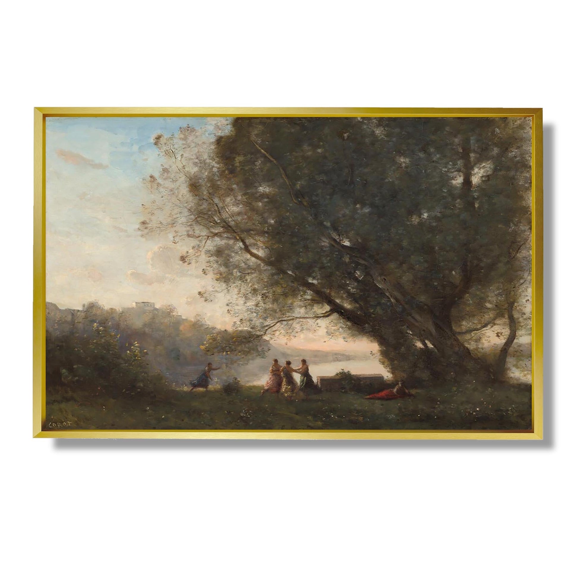 "Danse sous les arbres au bord du lac" est une œuvre emblématique de Jean-Baptiste-Camille Corot, réalisée au XIXe siècle. Ce tableau illustre la beauté de la nature et la légèreté de l'esprit romantique. Au cœur d'un paysage bucolique, des figures féminines dansent gracieusement sous les feuillages, évoquant une atmosphère de rêve et de sérénité. La lumière douce et les couleurs pastel créent une harmonie visuelle, tandis que le lac en arrière-plan reflète le ciel. Corot, maître du paysage, capture ici l'évasion et la joie, célébrant la communion entre l'homme et la nature.