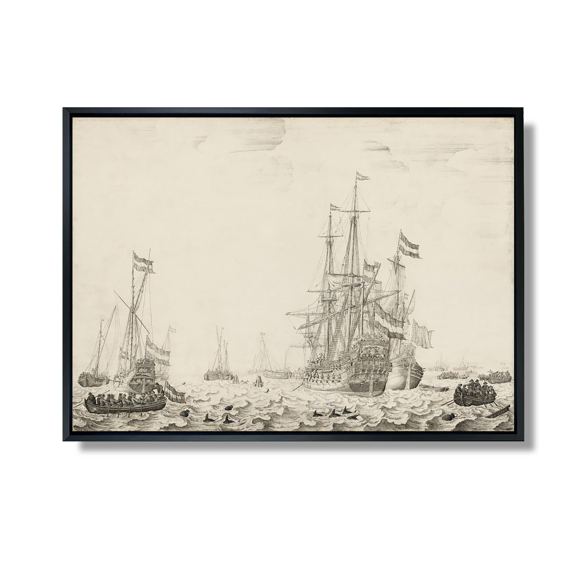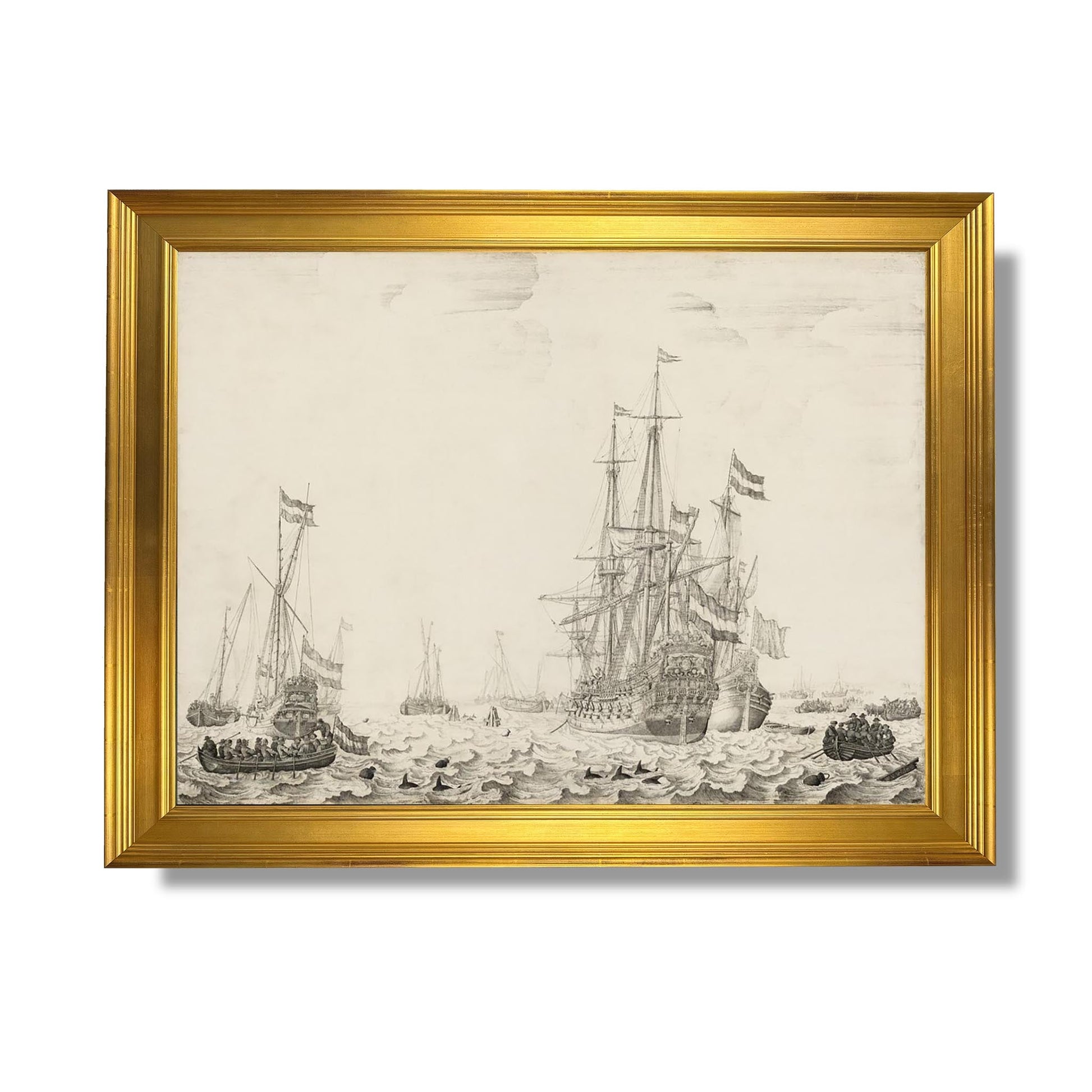 "Dutch Ships near the Coast" est une œuvre emblématique de Willem van de Velde l'Ancien, un maître de la peinture maritime du XVIIe siècle. Réalisée vers 1660, cette toile illustre la maîtrise de l'artiste dans la représentation des navires et des paysages marins. Les voiliers, ancrés près de la côte, sont rendus avec un réalisme saisissant, tandis que le ciel nuageux et les vagues ajoutent une atmosphère dynamique à la scène. Van de Velde capture non seulement la beauté des navires, mais aussi l'importance du commerce maritime pour les Provinces-Unies, témoignant ainsi de l'âge d'or néerlandais.