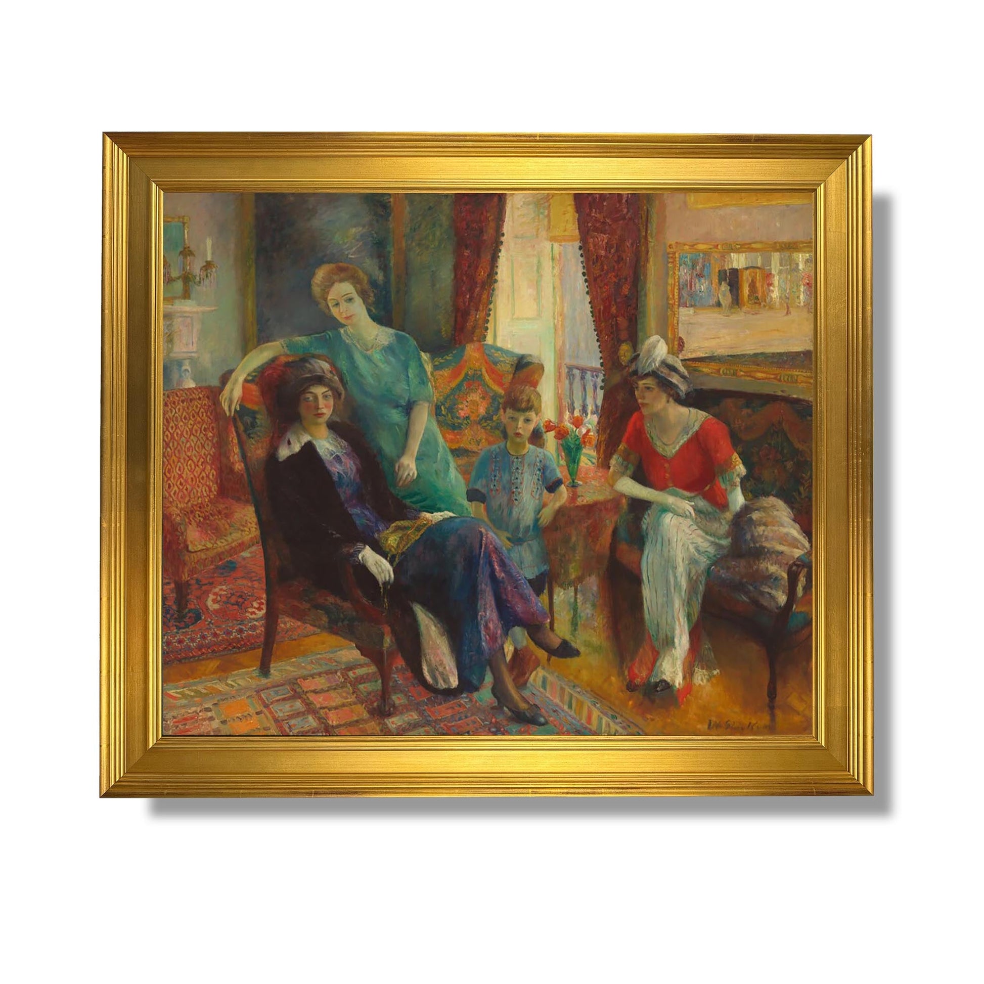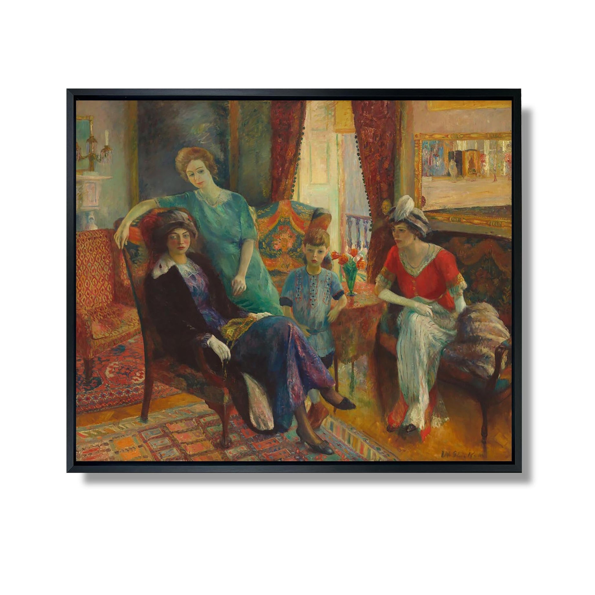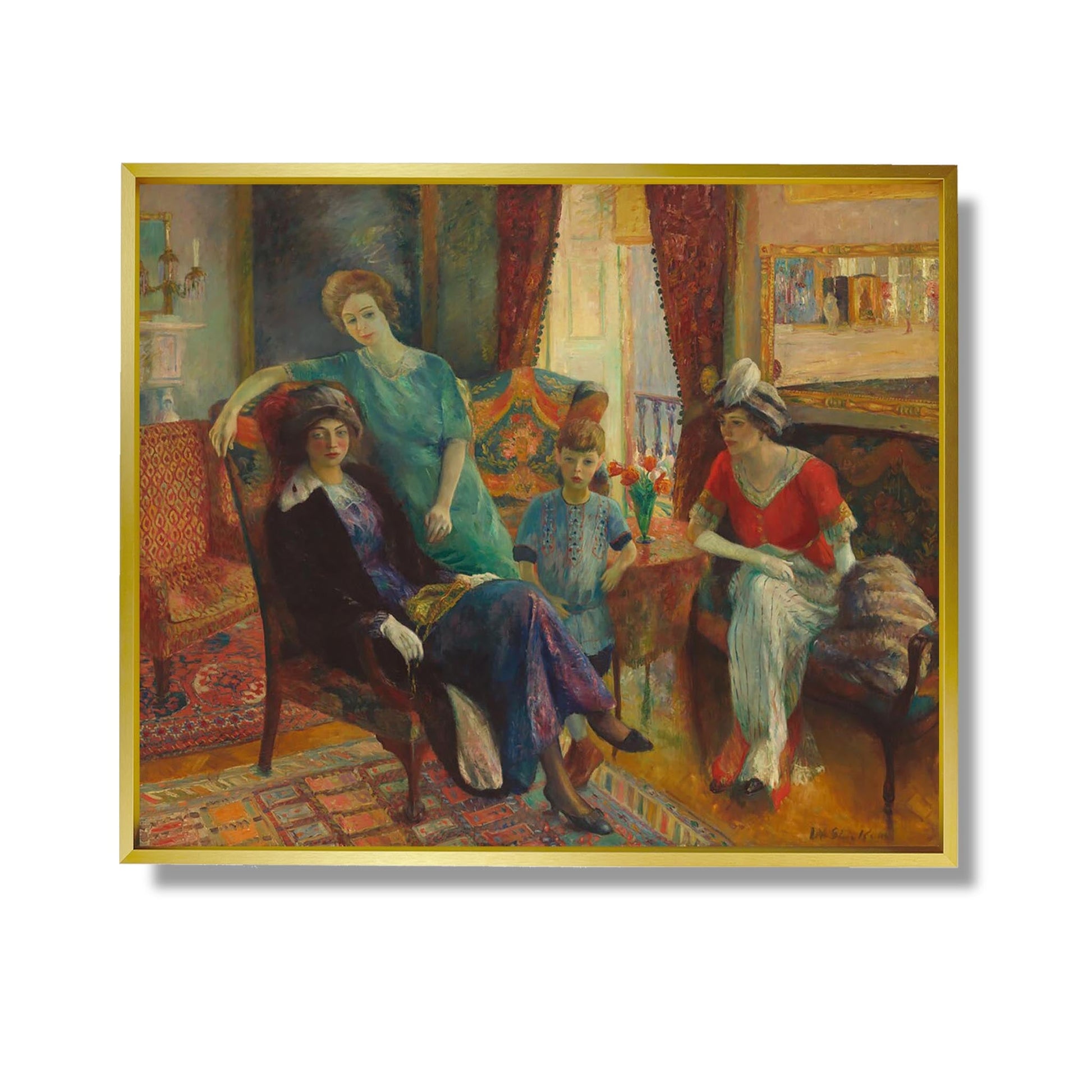 "Family Group" de William Glackens est une œuvre emblématique du début du XXe siècle, illustrant le style impressionniste américain. Peinte en 1918, cette toile représente une scène intime de la vie familiale, capturant la chaleur et la convivialité d'un moment partagé. Les personnages, aux visages expressifs, sont entourés d'un décor vibrant, où la lumière joue un rôle essentiel. Glackens, influencé par les maîtres européens, utilise des couleurs riches et des coups de pinceau dynamiques pour transmettre une atmosphère de joie et de proximité. Cette œuvre témoigne de son engagement envers la vie quotidienne et les relations humaines.