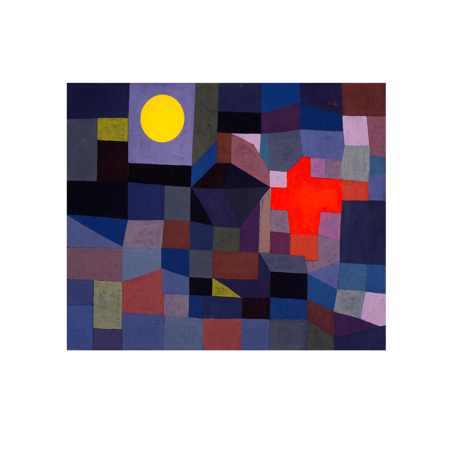 "Fire at Full Moon" de Paul Klee est une œuvre captivante qui illustre l'imagination et l'expression émotionnelle caractéristiques de l'artiste. Peinte en 1933, elle présente une composition dynamique où des formes géométriques et des couleurs vives s'entrelacent, évoquant une atmosphère à la fois mystique et troublante. Les teintes chaudes, notamment les rouges et les oranges, suggèrent une intensité émotionnelle, tandis que les lignes sinueuses et les motifs abstraits créent un sentiment de mouvement. Cette œuvre reflète la fascination de Klee pour la nature et les rêves, invitant le spectateur à explorer les profondeurs de son subconscient.