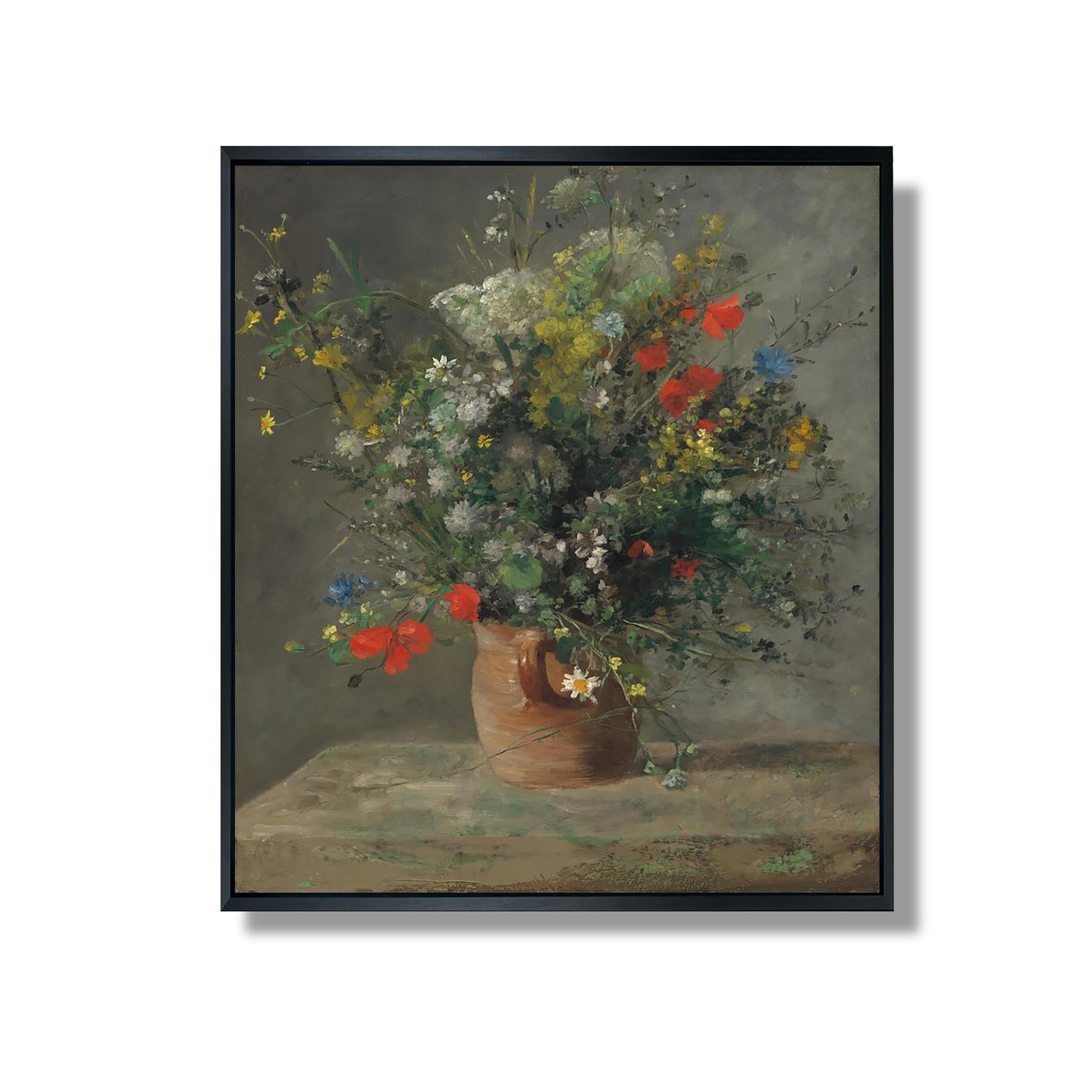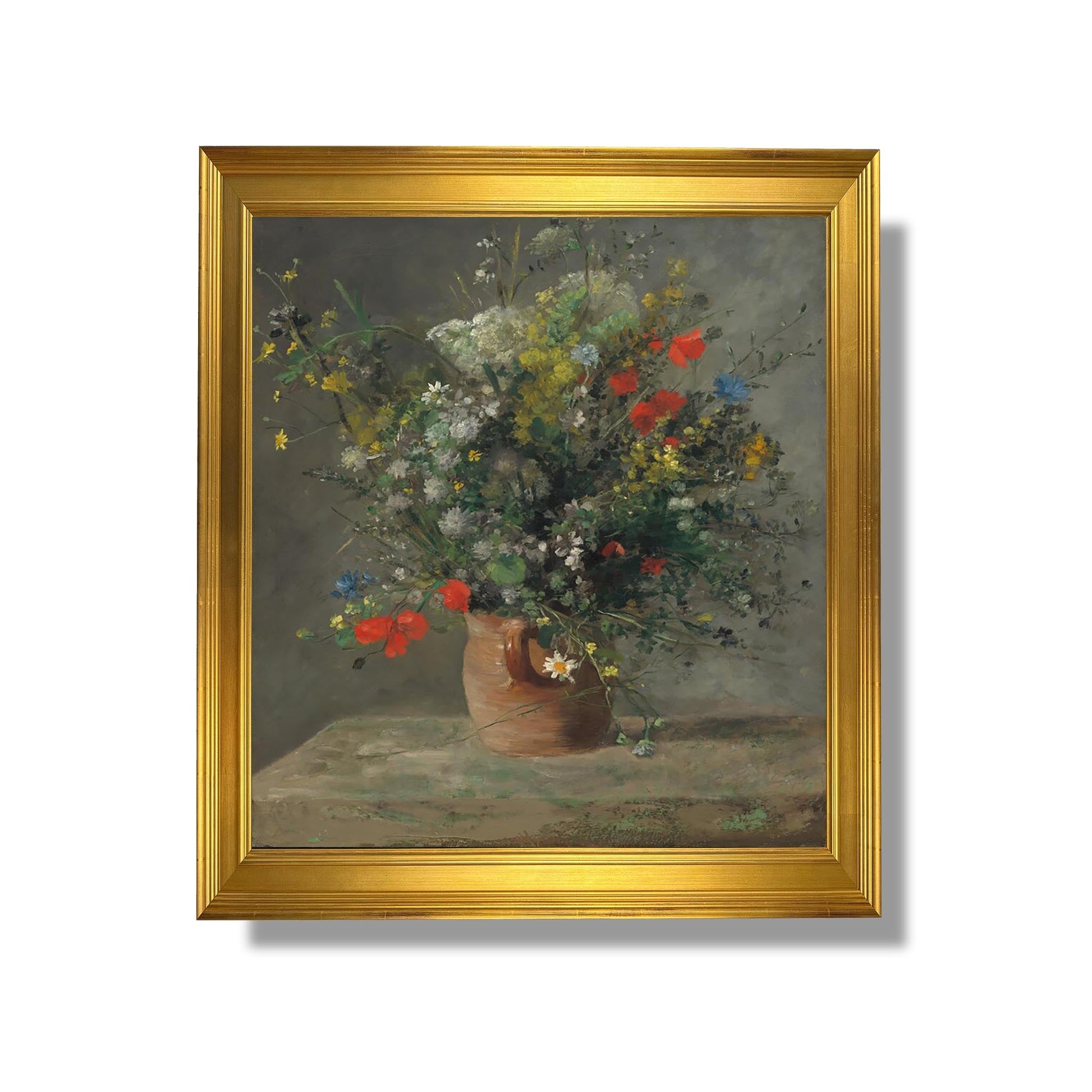 "Fleurs dans un vase" est une œuvre emblématique d'Auguste Renoir, réalisée en 1880. Ce tableau illustre la maîtrise de l'artiste dans la représentation des fleurs, capturant leur éclat et leur délicatesse. Les couleurs vives et les touches de pinceau fluides témoignent de son style impressionniste, où la lumière joue un rôle central. Renoir parvient à transmettre une atmosphère de fraîcheur et de vie, rendant hommage à la beauté éphémère de la nature. Cette œuvre, à la fois simple et raffinée, reflète l'amour de l'artiste pour les scènes de la vie quotidienne et son talent pour immortaliser des instants fugaces.