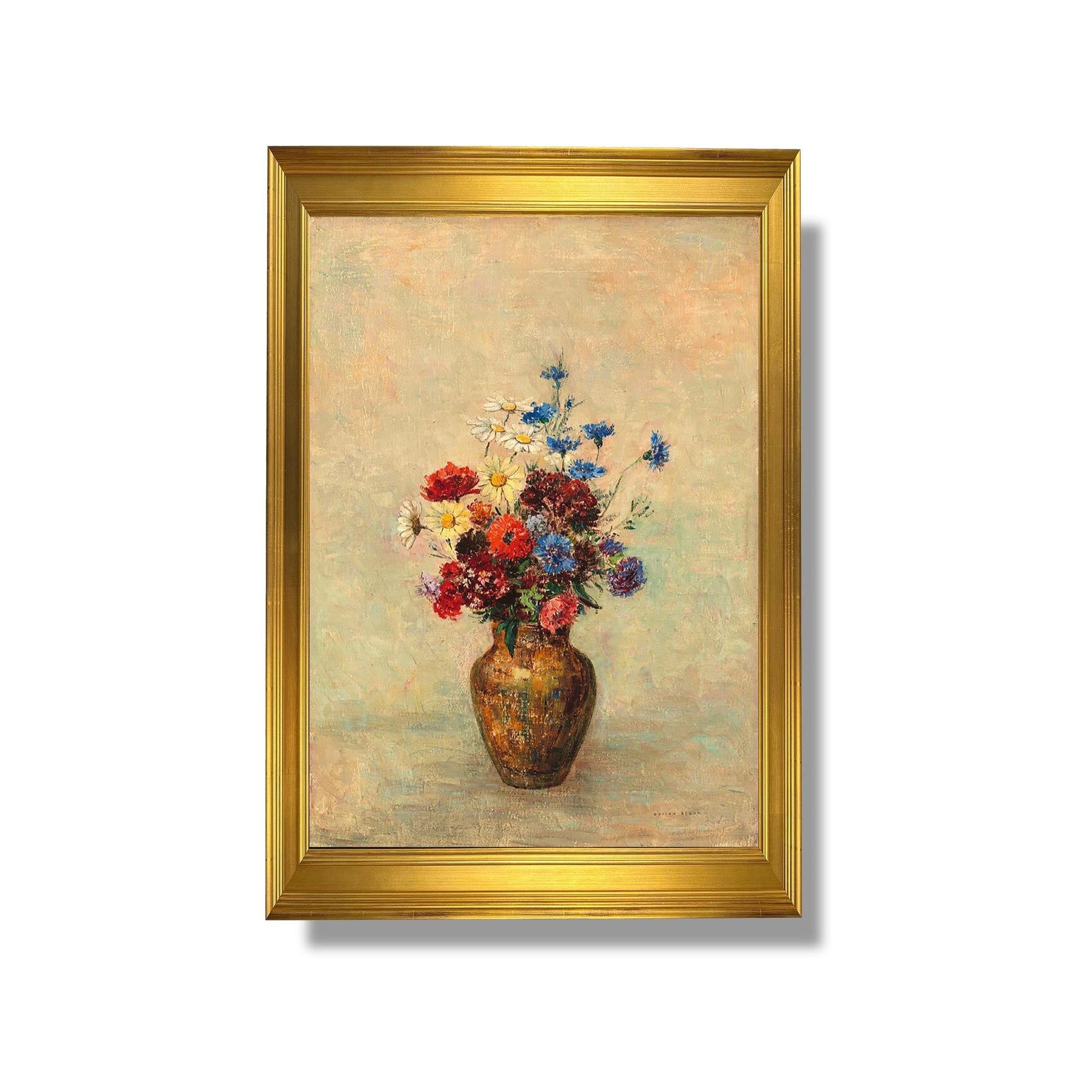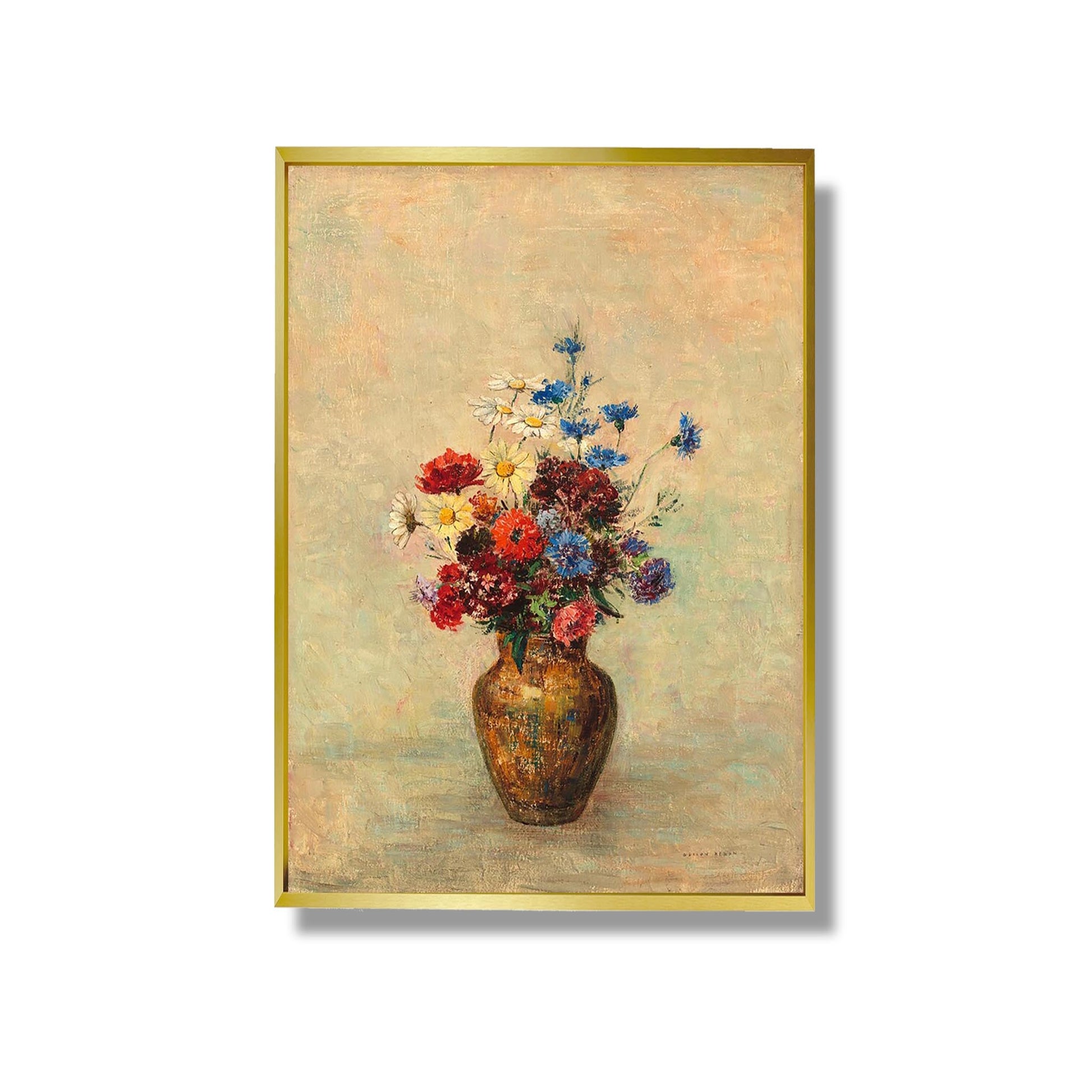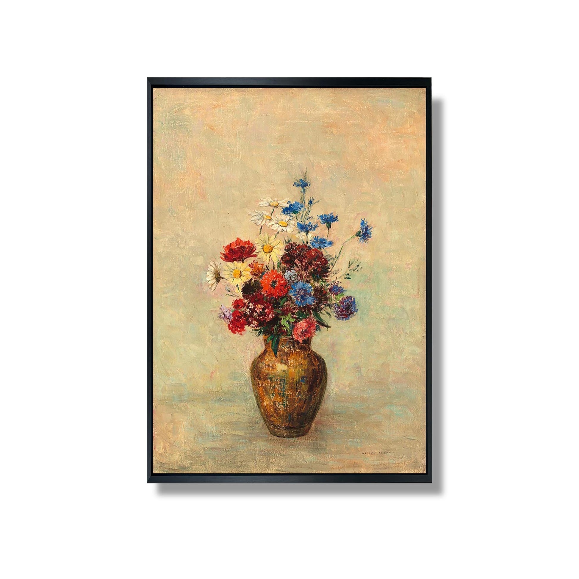 "Fleurs dans un vase" est une œuvre emblématique d'Odilon Redon, un artiste français du mouvement symboliste. Peinte vers la fin du XIXe siècle, cette composition florale transcende la simple représentation. Redon utilise des couleurs vibrantes et des formes délicates pour évoquer une atmosphère onirique et mystérieuse. Les fleurs, souvent interprétées comme des symboles de beauté éphémère, sont disposées dans un vase qui semble presque flotter dans un espace indéfini. L'œuvre invite à une contemplation introspective, révélant les émotions et les pensées cachées de l'artiste, tout en célébrant la nature et l'imagination.