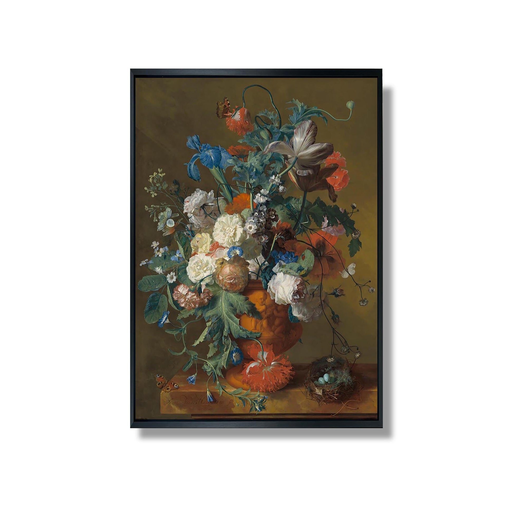"Flowers in an Urn" est une œuvre emblématique de Jan van Huysum, un maître néerlandais du XVIIIe siècle, célèbre pour ses natures mortes florales. Peinte vers 1720, cette composition met en avant un vase richement décoré, débordant de fleurs éclatantes et variées, telles que des roses, des pivoines et des tulipes. La maîtrise de la lumière et des couleurs crée une illusion de profondeur et de réalisme, capturant la beauté éphémère de la nature. Van Huysum, par son attention aux détails et son habileté technique, invite le spectateur à apprécier la fragilité et la splendeur des fleurs, tout en évoquant des thèmes de transience et de luxe.