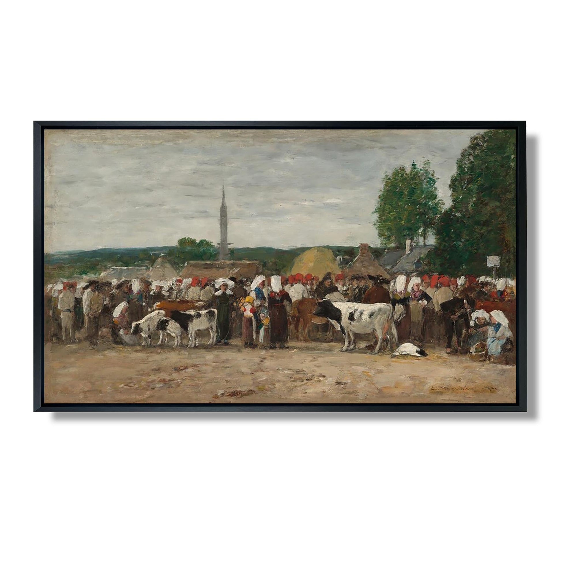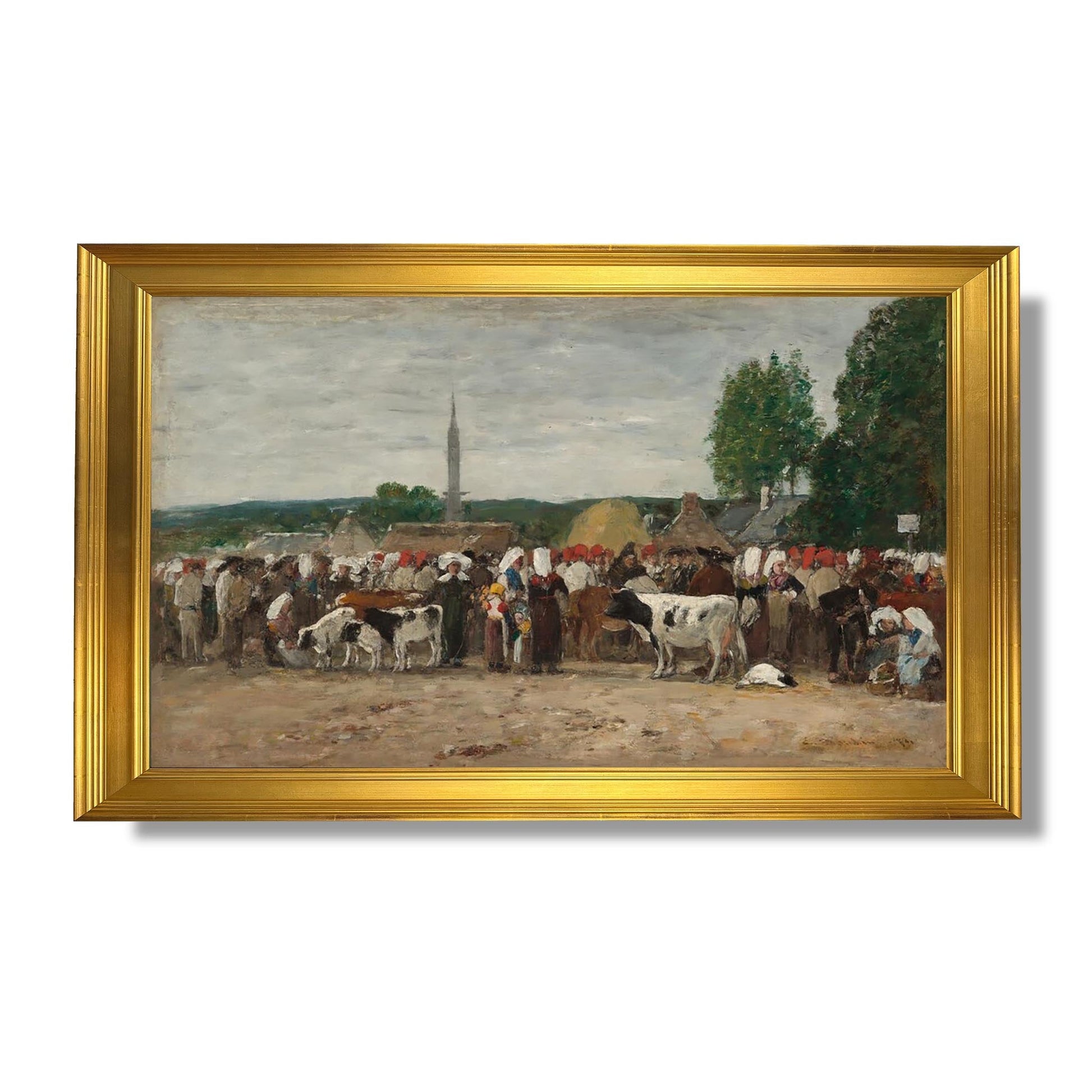 Eugène Boudin, peintre français du XIXe siècle, est reconnu pour ses paysages marins et ses scènes de la vie quotidienne. Dans son œuvre "Foire en Bretagne", il capture l'animation d'une foire locale, mettant en avant la richesse des traditions bretonnes. Les personnages, vêtus de costumes colorés, s'animent autour des étals, tandis que le ciel nuageux et la lumière douce créent une atmosphère vivante. Boudin, pionnier de l'impressionnisme, utilise des touches de pinceau légères pour rendre la texture et le mouvement, témoignant de son amour pour la nature et la vie populaire. Cette œuvre illustre son talent à immortaliser des moments simples mais chargés d'émotion.