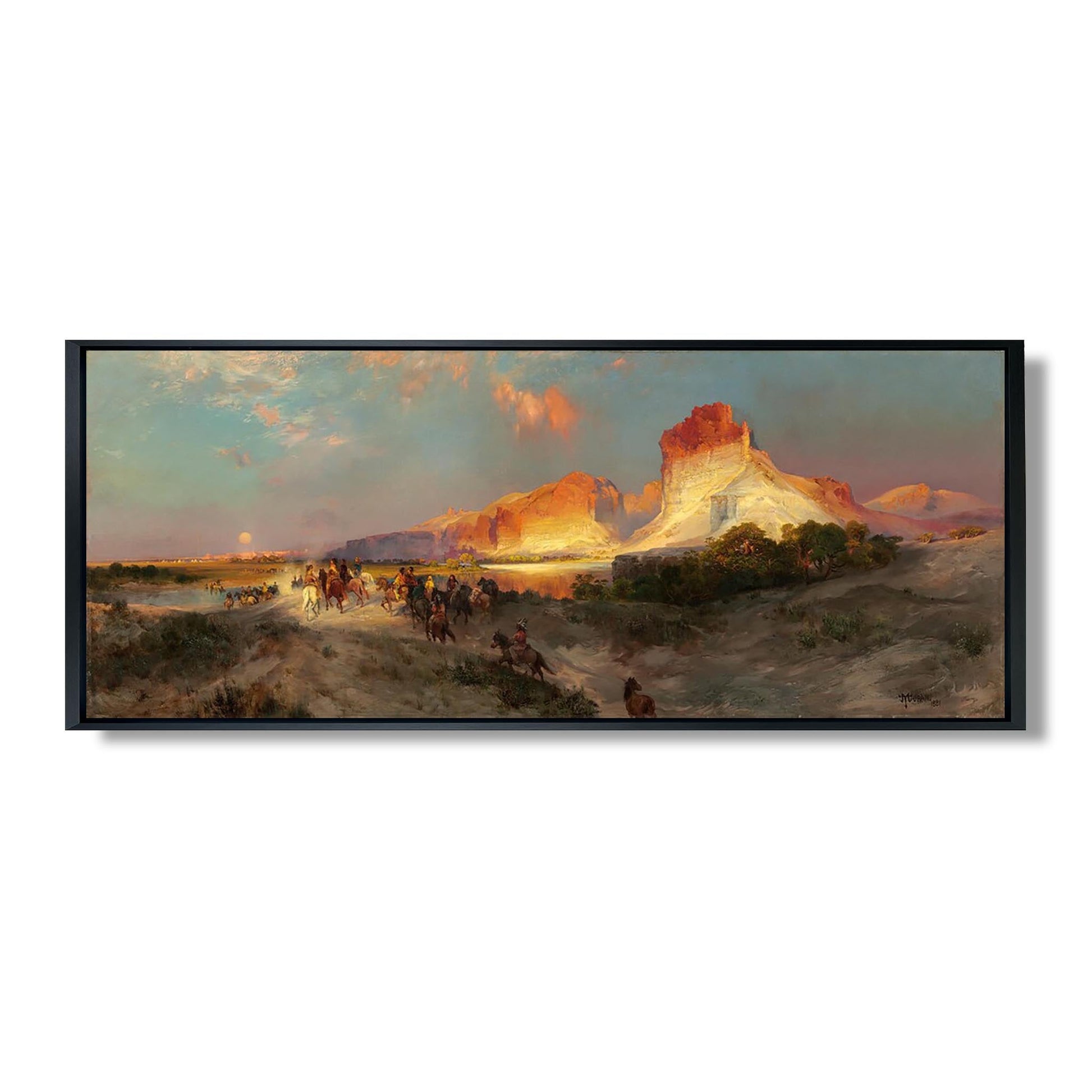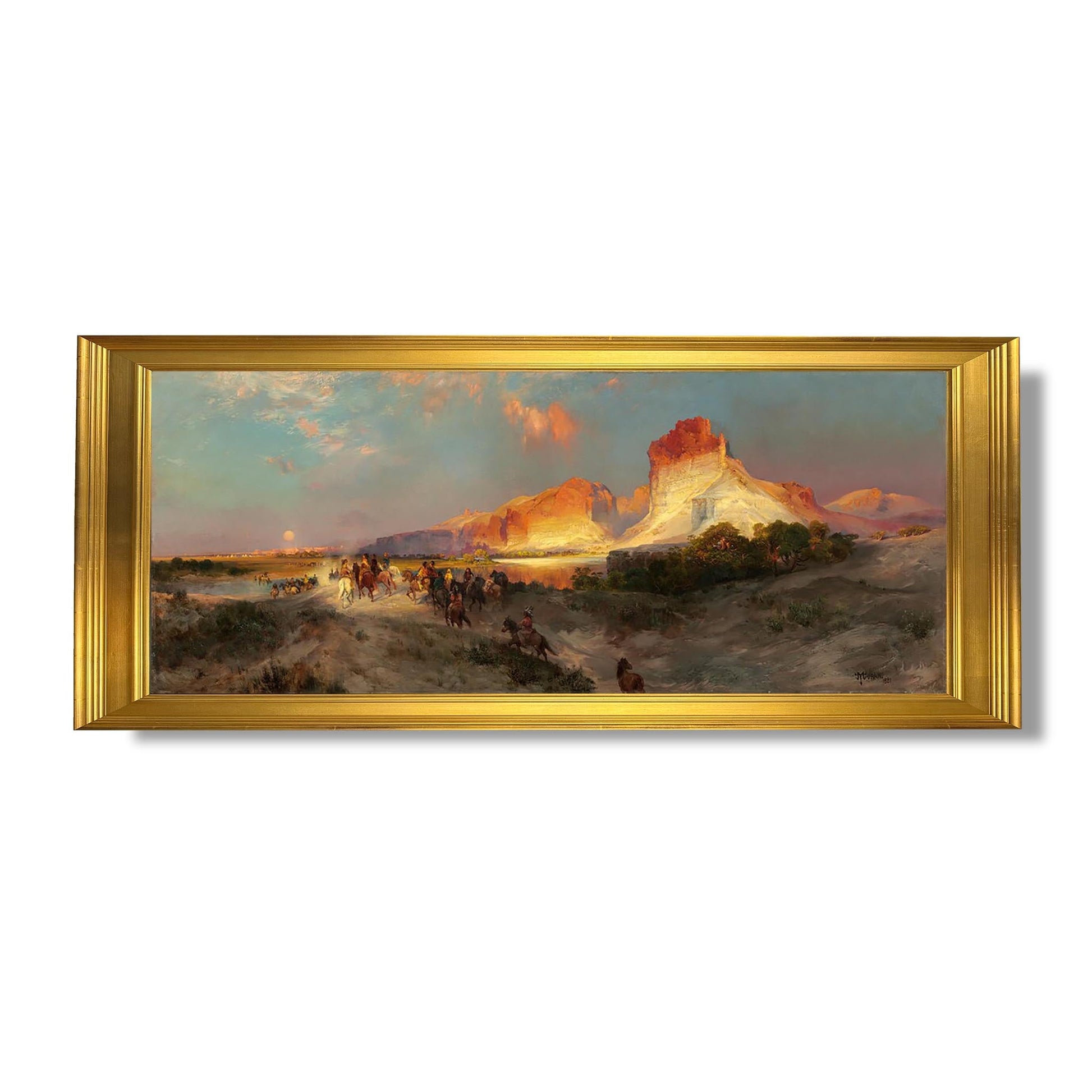 "Green River Cliffs, Wyoming" est une œuvre emblématique de Thomas Moran, un peintre américain du XIXe siècle, célèbre pour ses paysages grandioses. Réalisée en 1871, cette toile capture la majesté des formations rocheuses et des vallées du Wyoming, révélant la beauté sauvage de l'Ouest américain. Moran, en utilisant des couleurs vibrantes et des jeux de lumière, évoque une atmosphère romantique et sublime. Son travail a joué un rôle crucial dans la promotion des parcs nationaux, notamment Yellowstone, en sensibilisant le public à la préservation de ces paysages naturels. Cette œuvre incarne l'esprit d'exploration et d'émerveillement de son époque.
