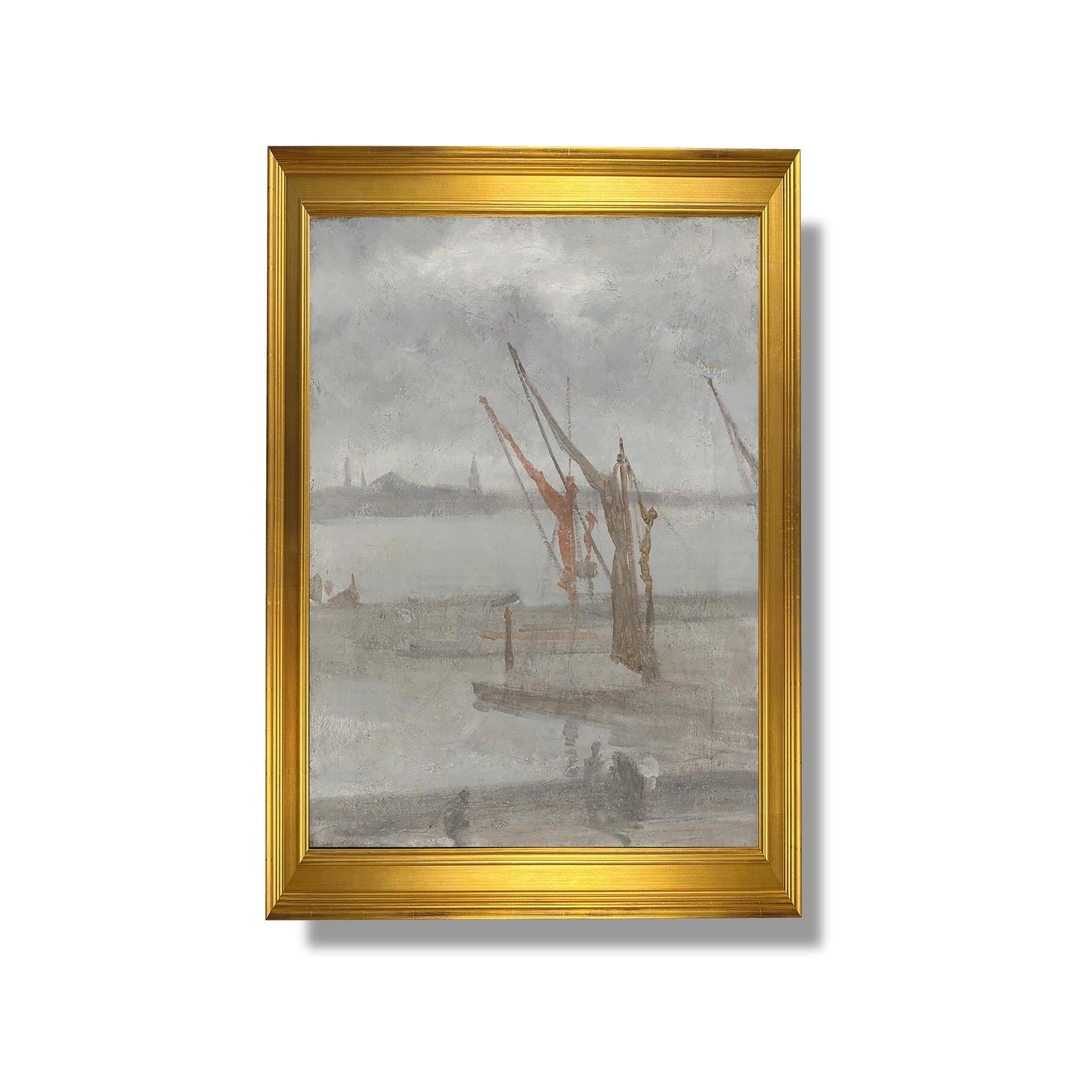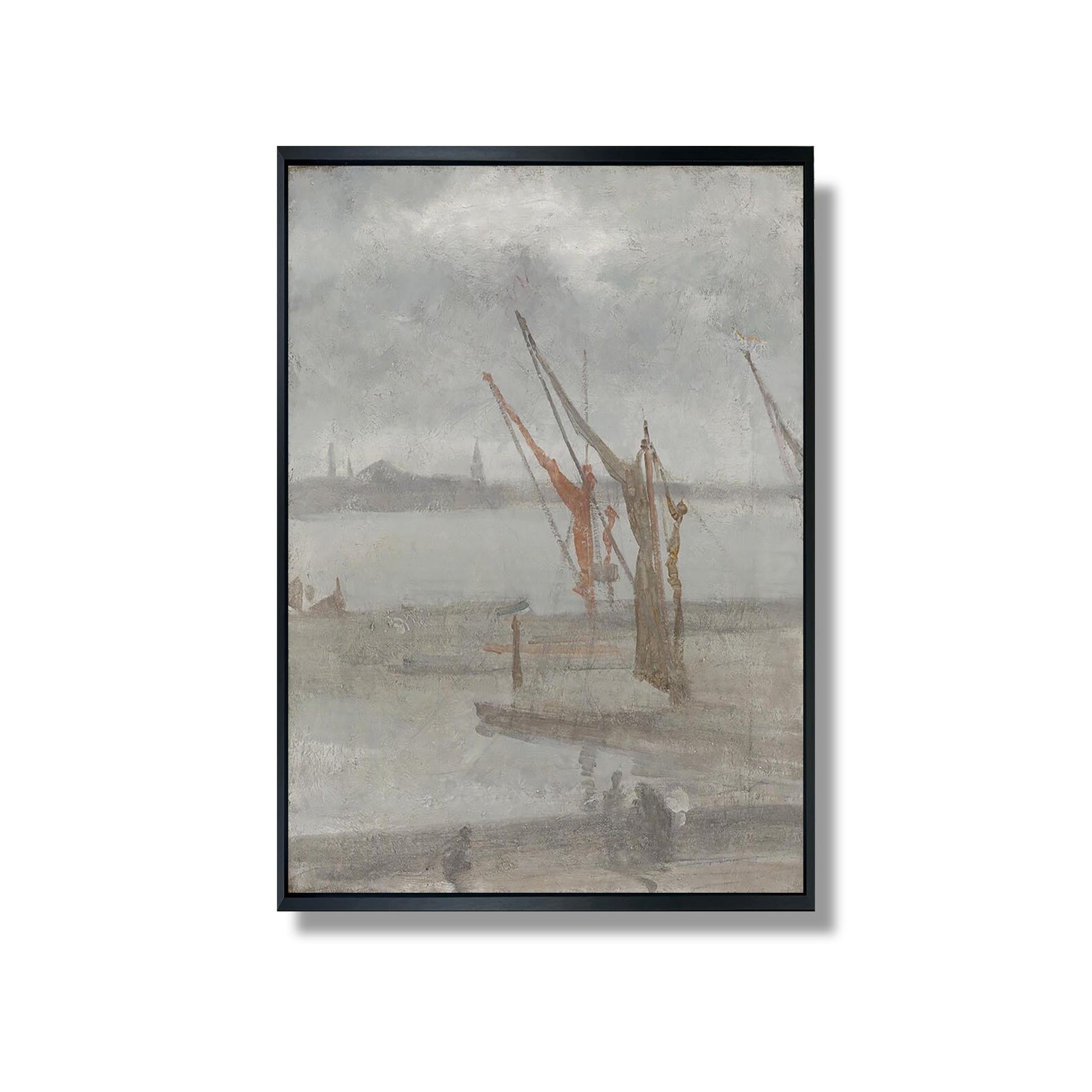 "Grey and Silver: Chelsea Wharf" est une œuvre emblématique de James McNeill Whistler, réalisée en 1871. Ce tableau, qui illustre le port de Chelsea à Londres, se distingue par sa palette de gris et d'argent, créant une atmosphère mélancolique et poétique. Whistler, maître du ton et de la lumière, capture l'essence d'un moment fugace, où l'eau et le ciel se fondent dans une harmonie subtile. L'œuvre reflète l'influence du mouvement impressionniste, tout en affirmant le style unique de l'artiste, qui privilégie l'émotion et l'impression visuelle sur la représentation réaliste.