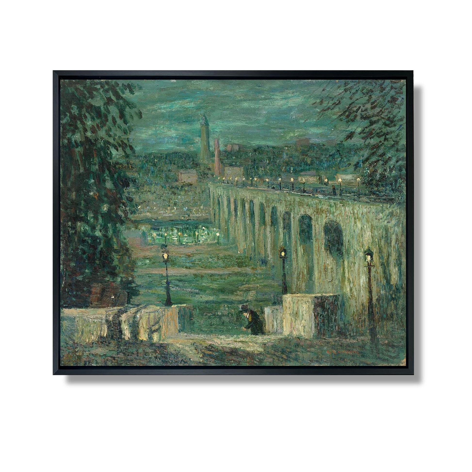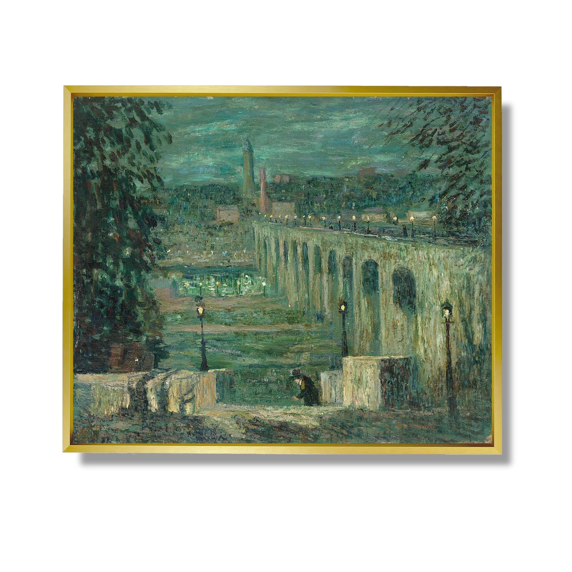 "High Bridge at Night, New York City" est une œuvre emblématique de l'artiste américain Ernest Lawson, réalisée en 1900. Lawson, membre du mouvement impressionniste américain, capture la magie nocturne de New York à travers une palette de couleurs vibrantes et des coups de pinceau dynamiques. Le tableau représente le célèbre High Bridge, illuminé par des lumières scintillantes, créant une atmosphère à la fois romantique et mélancolique. Lawson parvient à transmettre une sensation de mouvement et de vie, tout en explorant les thèmes de l'urbanité et de la nature. Cette œuvre témoigne de son talent à immortaliser des moments fugaces dans un paysage en constante évolution.