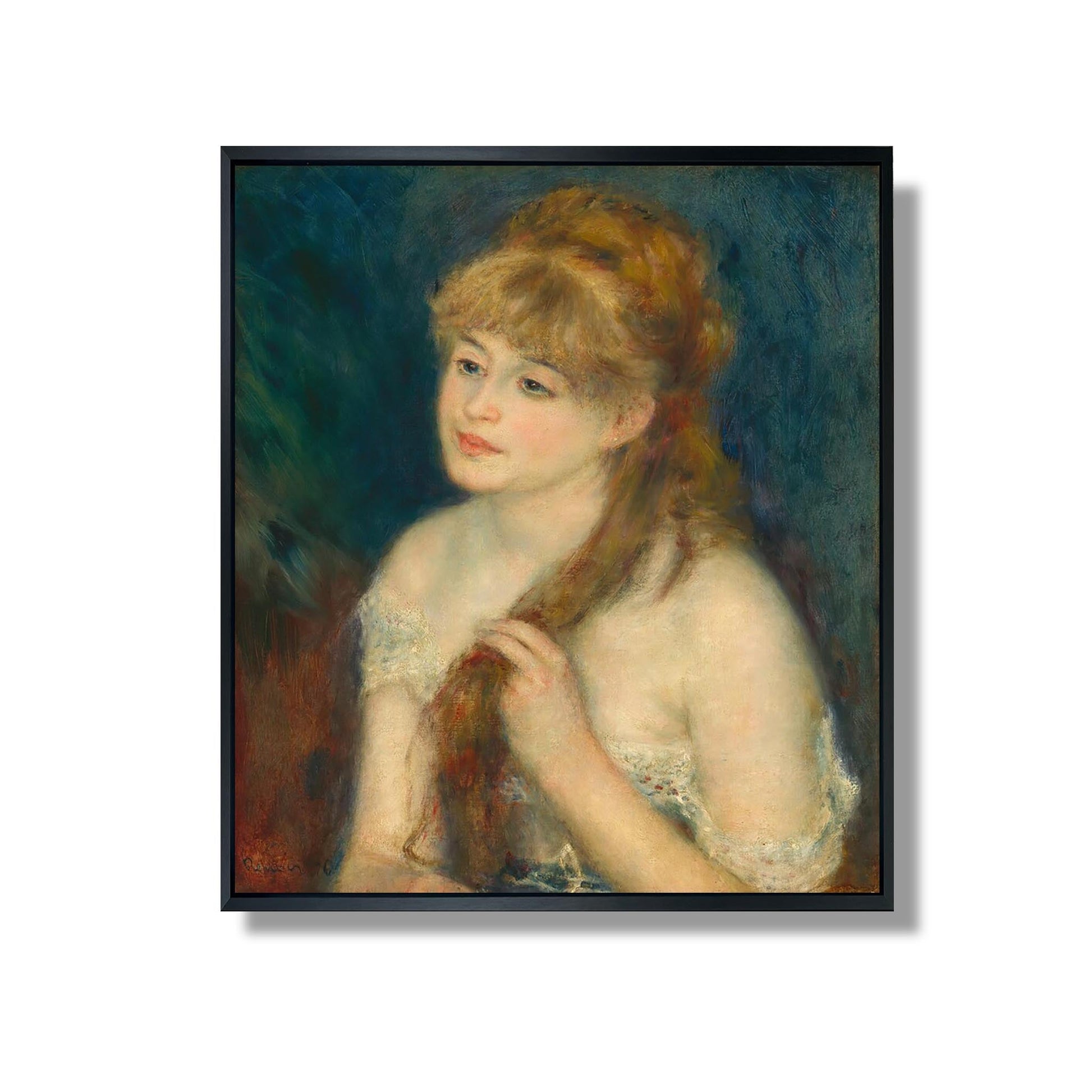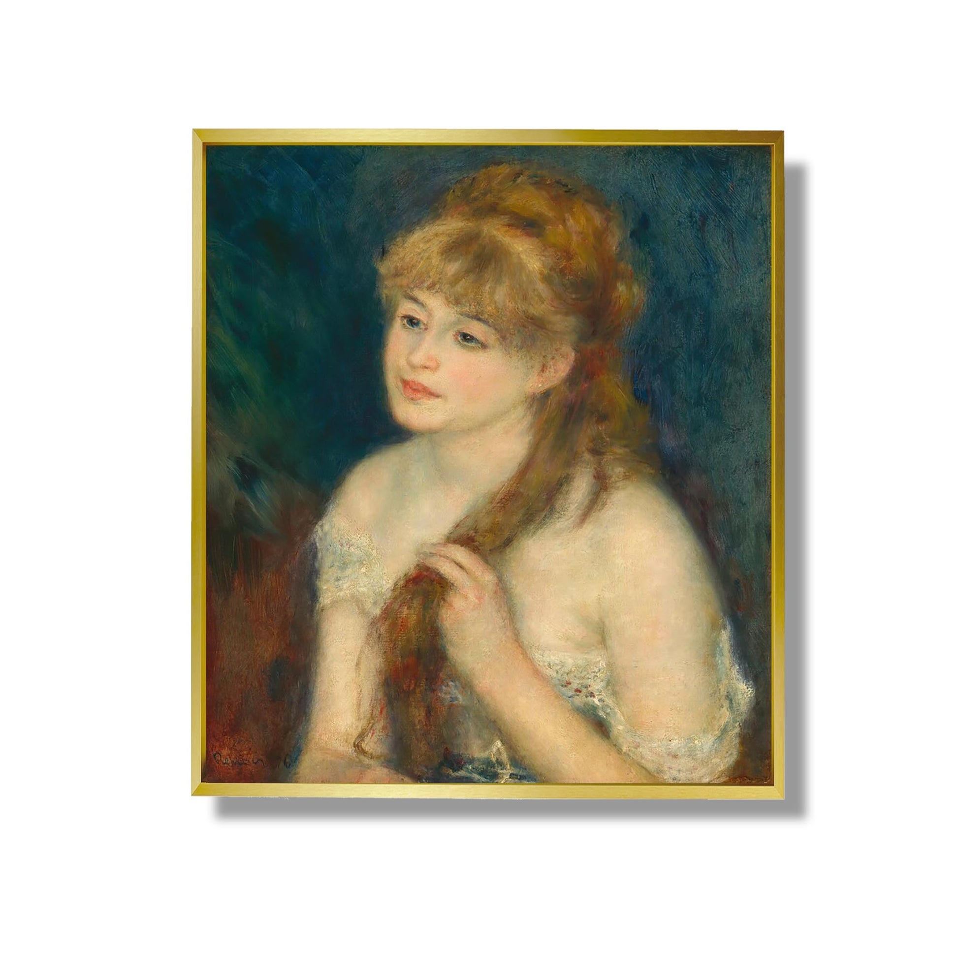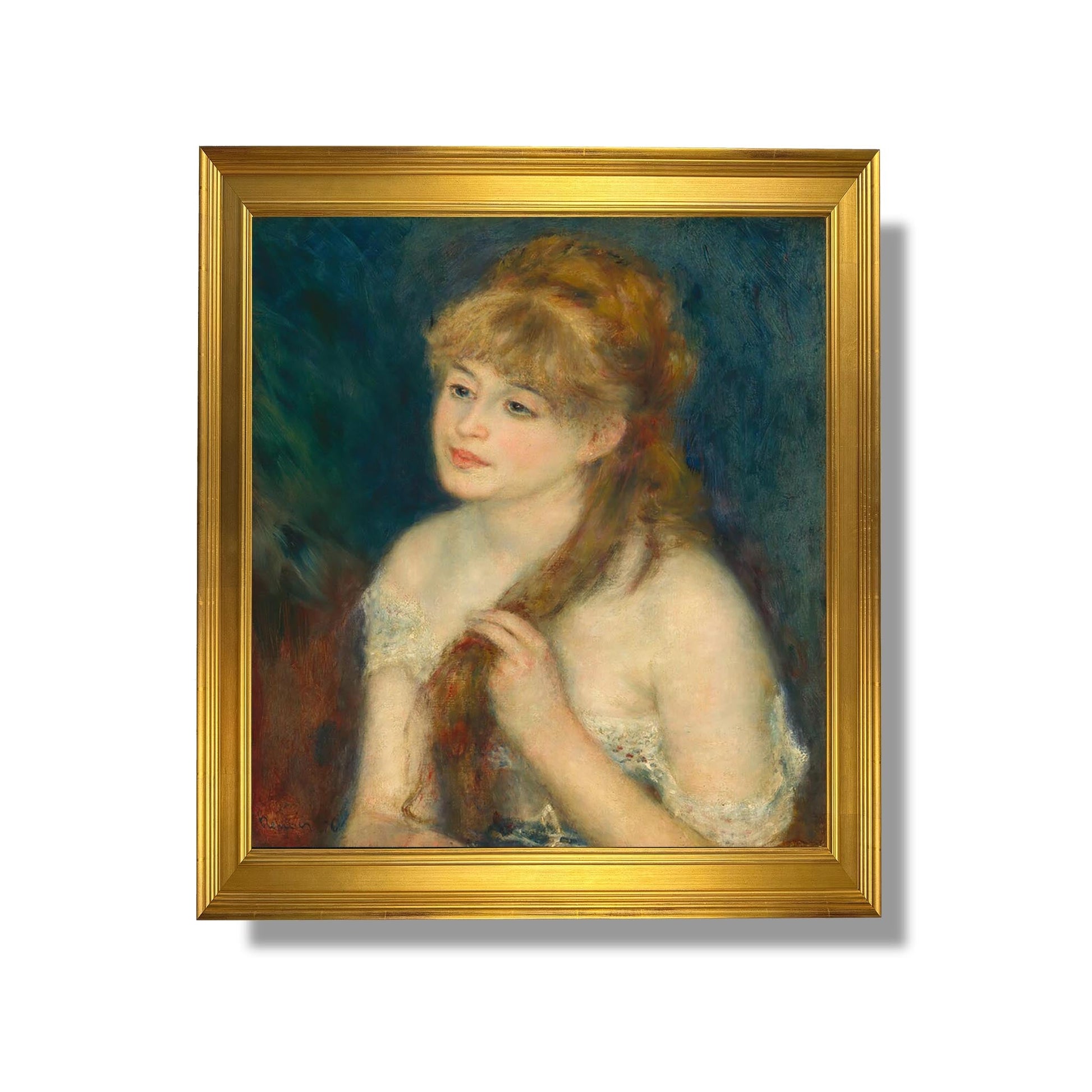 "Jeune femme tressant ses cheveux" est une œuvre emblématique d'Auguste Renoir, peinte en 1885. Ce tableau illustre la beauté et la délicatesse féminine, caractéristiques du style impressionniste. La jeune femme, concentrée sur sa tâche, incarne la grâce et la simplicité de la vie quotidienne. Les couleurs vives et les touches de pinceau fluides créent une atmosphère lumineuse, typique de Renoir. L'œuvre met en avant l'intimité du moment, tout en célébrant la beauté naturelle. À travers ce tableau, l'artiste capture l'essence de la féminité et la joie des instants simples, faisant de cette œuvre un véritable chef-d'œuvre.