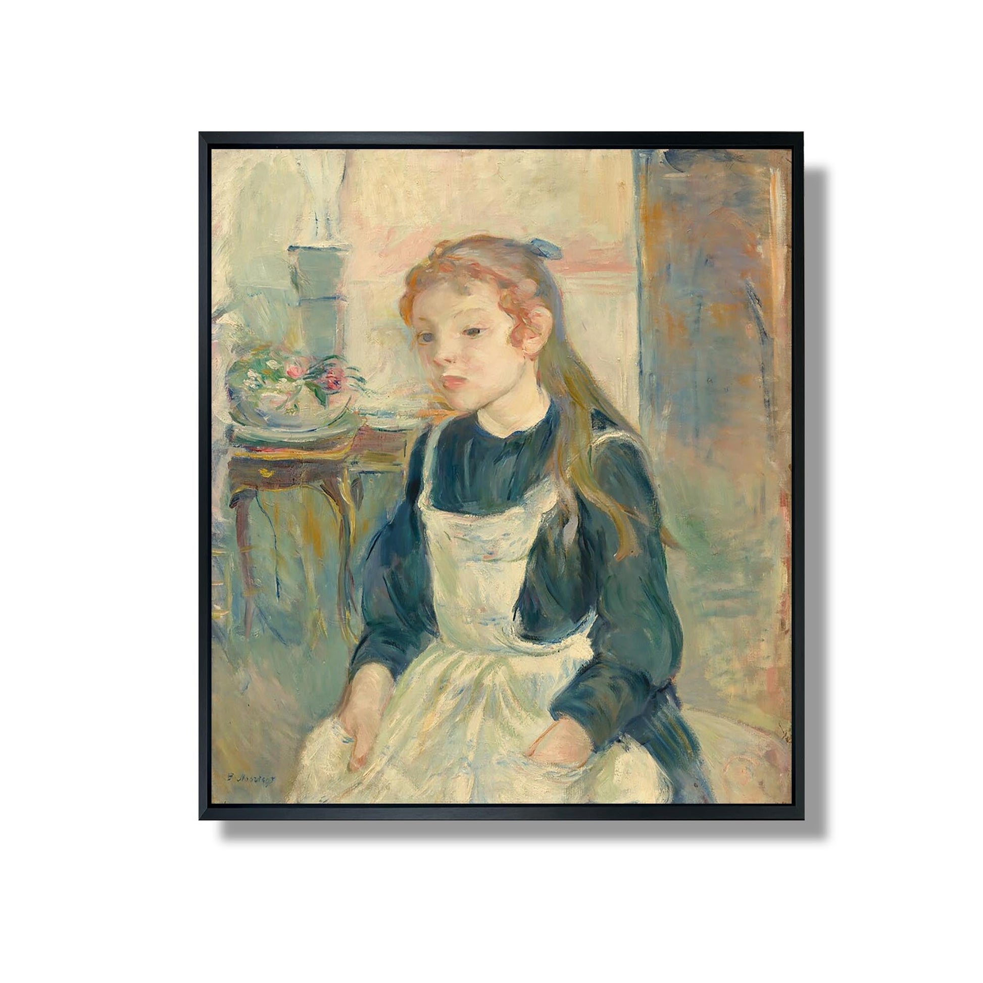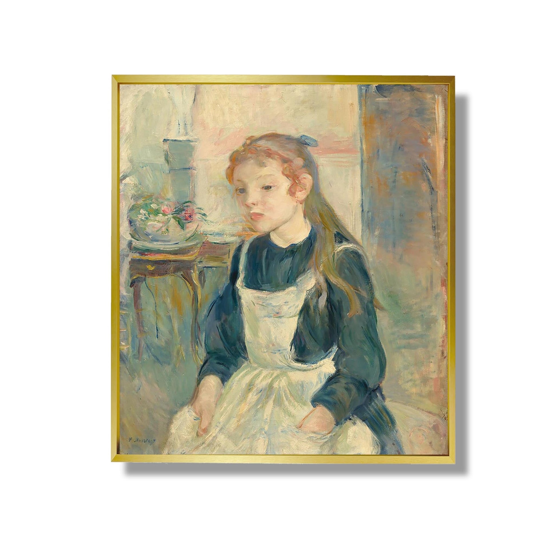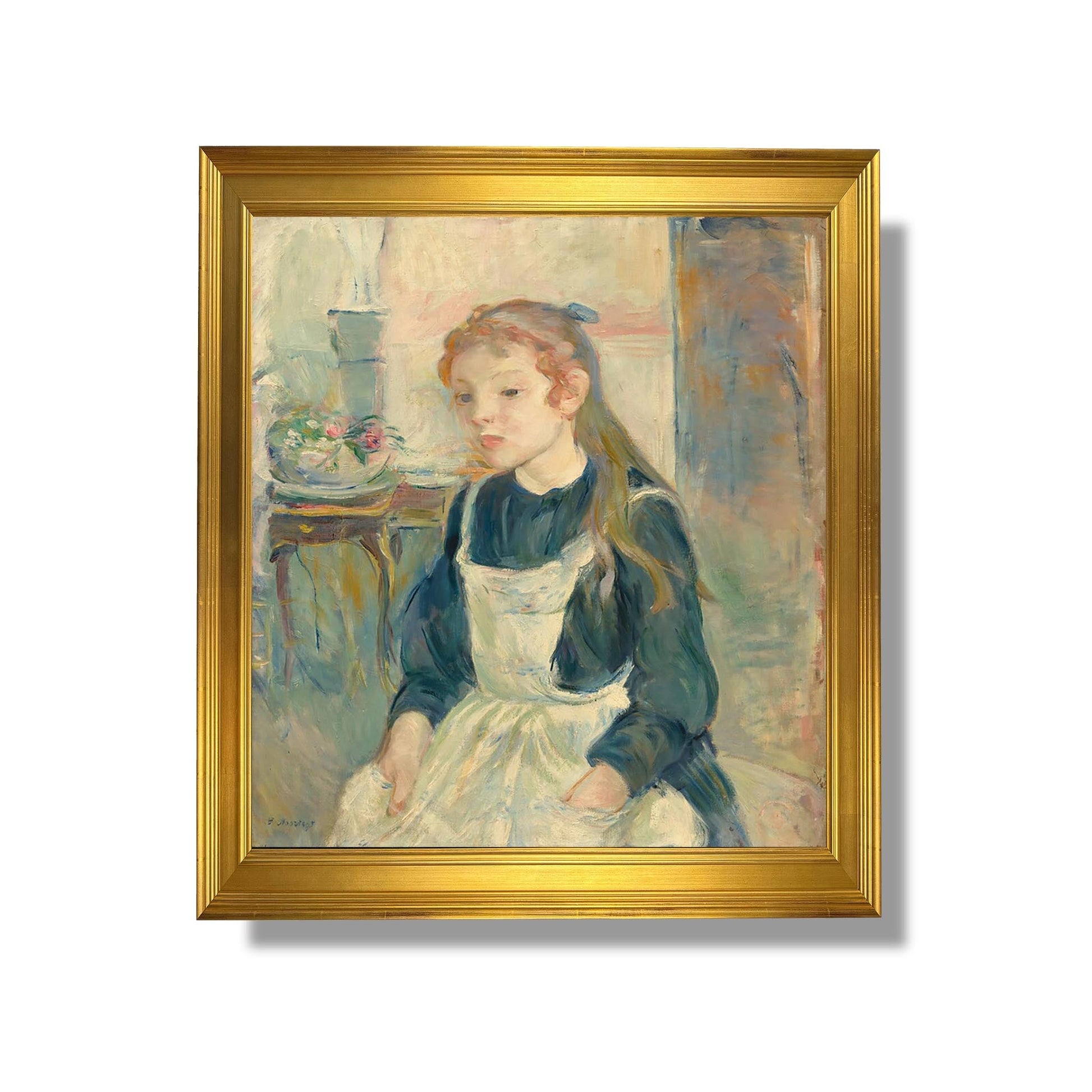 "Jeune fille avec un tablier" est une œuvre emblématique de Berthe Morisot, une figure majeure du mouvement impressionniste. Peinte en 1879, cette toile met en lumière la délicatesse et la sensibilité de l'artiste envers la vie quotidienne. Le tableau représente une jeune femme, vêtue d'un tablier, qui incarne la grâce et la simplicité. Morisot utilise des touches de pinceau légères et des couleurs douces pour créer une atmosphère intimiste. À travers ce portrait, elle explore le rôle des femmes dans la société de son époque, tout en célébrant leur beauté et leur dignité. Cette œuvre témoigne de son talent unique et de son regard novateur sur le monde.