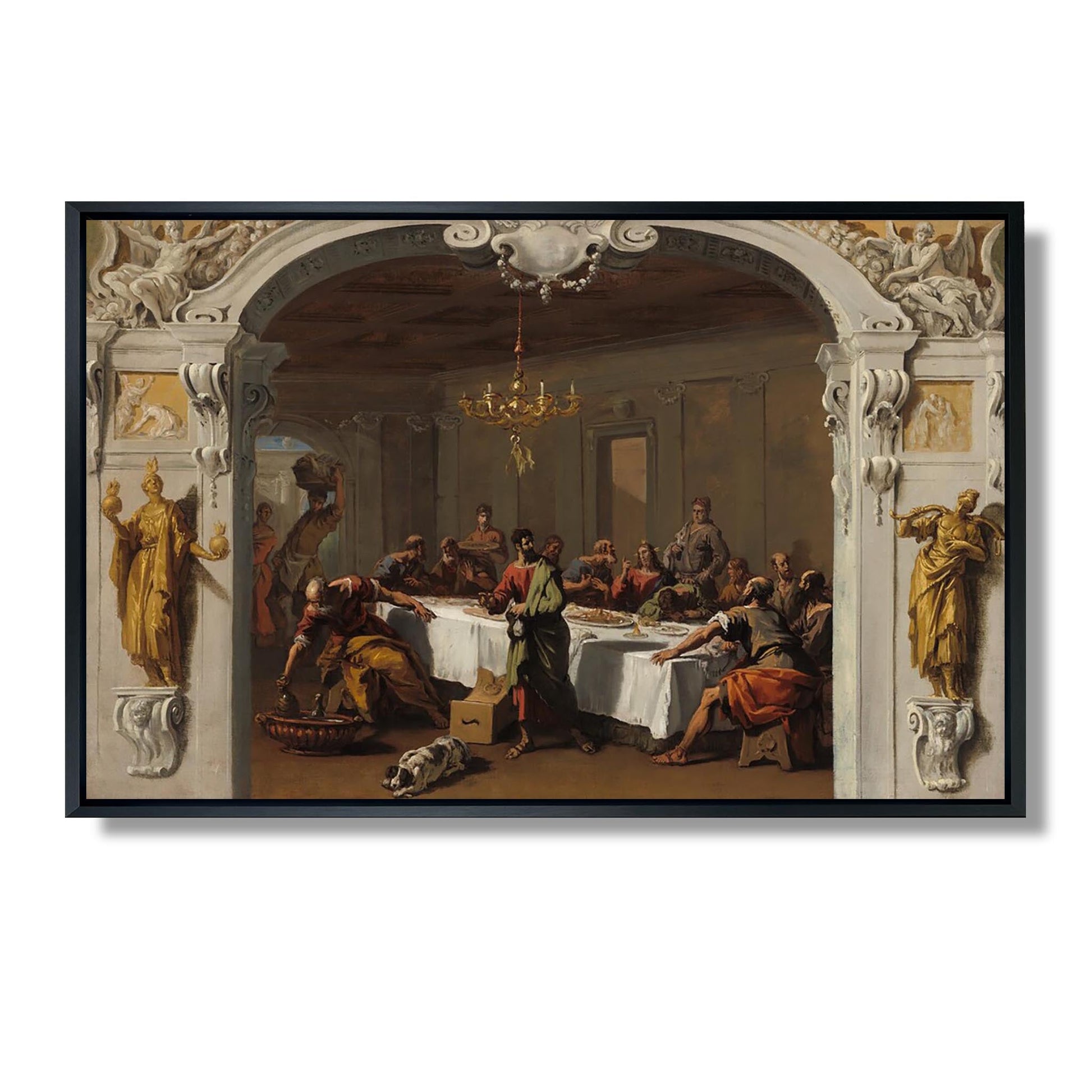 La Cène, réalisée par Sebastiano Ricci au début du XVIIIe siècle, est une œuvre emblématique du baroque vénitien. Ce tableau représente le dernier repas de Jésus avec ses apôtres, un moment chargé d'émotion et de symbolisme. Ricci, connu pour son utilisation audacieuse de la couleur et de la lumière, crée une atmosphère dynamique et spirituelle. Les figures sont disposées de manière à guider le regard vers le Christ, qui se distingue par sa posture et son expression. La composition, riche en détails, évoque à la fois la convivialité et la tension de ce moment sacré, témoignant du génie de Ricci dans la représentation des émotions humaines.
