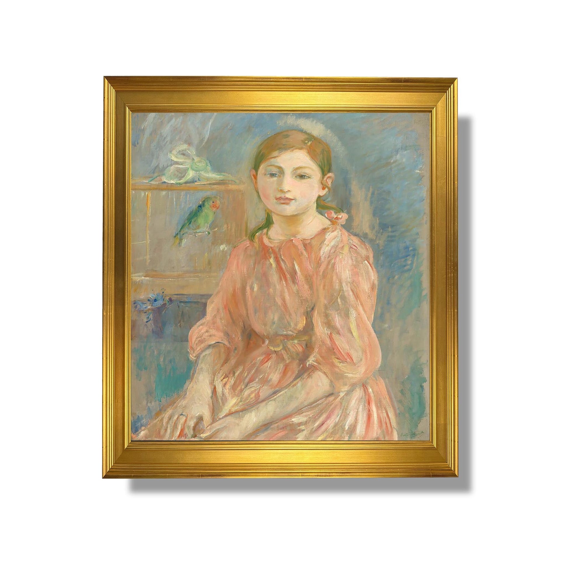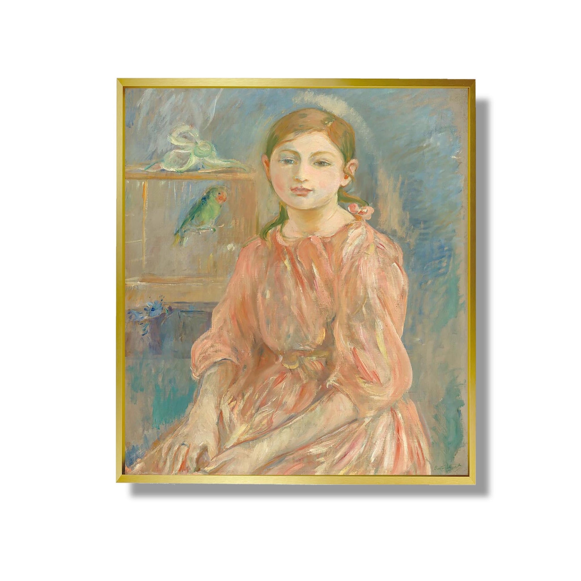 "La Fille de l'artiste avec une perruche" est une œuvre emblématique de Berthe Morisot, figure majeure du mouvement impressionniste. Peinte en 1879, cette toile met en lumière la délicatesse et la sensibilité de l'artiste. Elle représente sa fille, Julie, entourée d'une atmosphère intimiste, tenant une perruche. Les coups de pinceau légers et les couleurs pastel évoquent la douceur de l'enfance et la complicité entre mère et fille. Morisot, en tant que femme artiste, défie les conventions de son époque, capturant la vie quotidienne avec une touche poétique et une profondeur émotionnelle qui font de cette œuvre un véritable chef-d'œuvre.