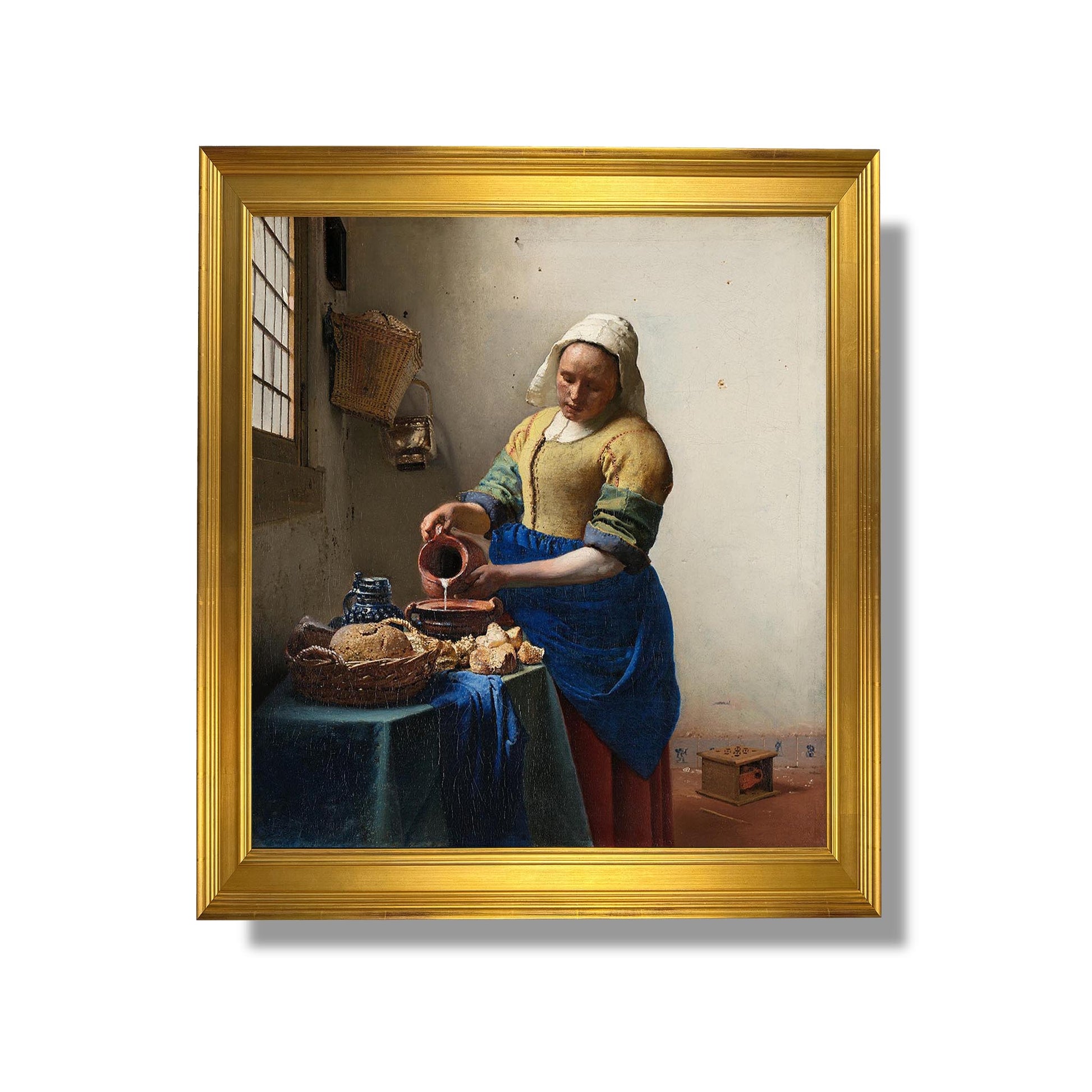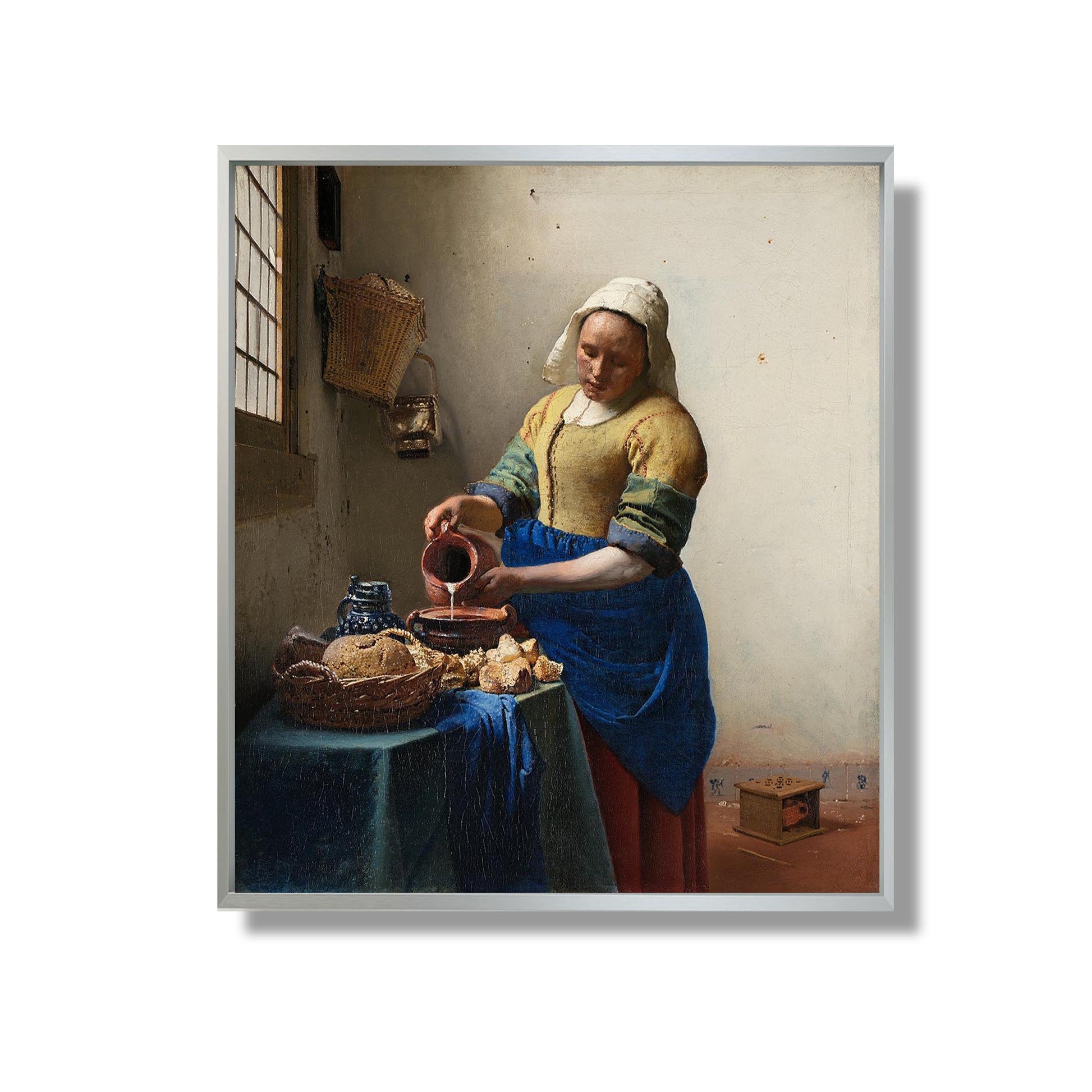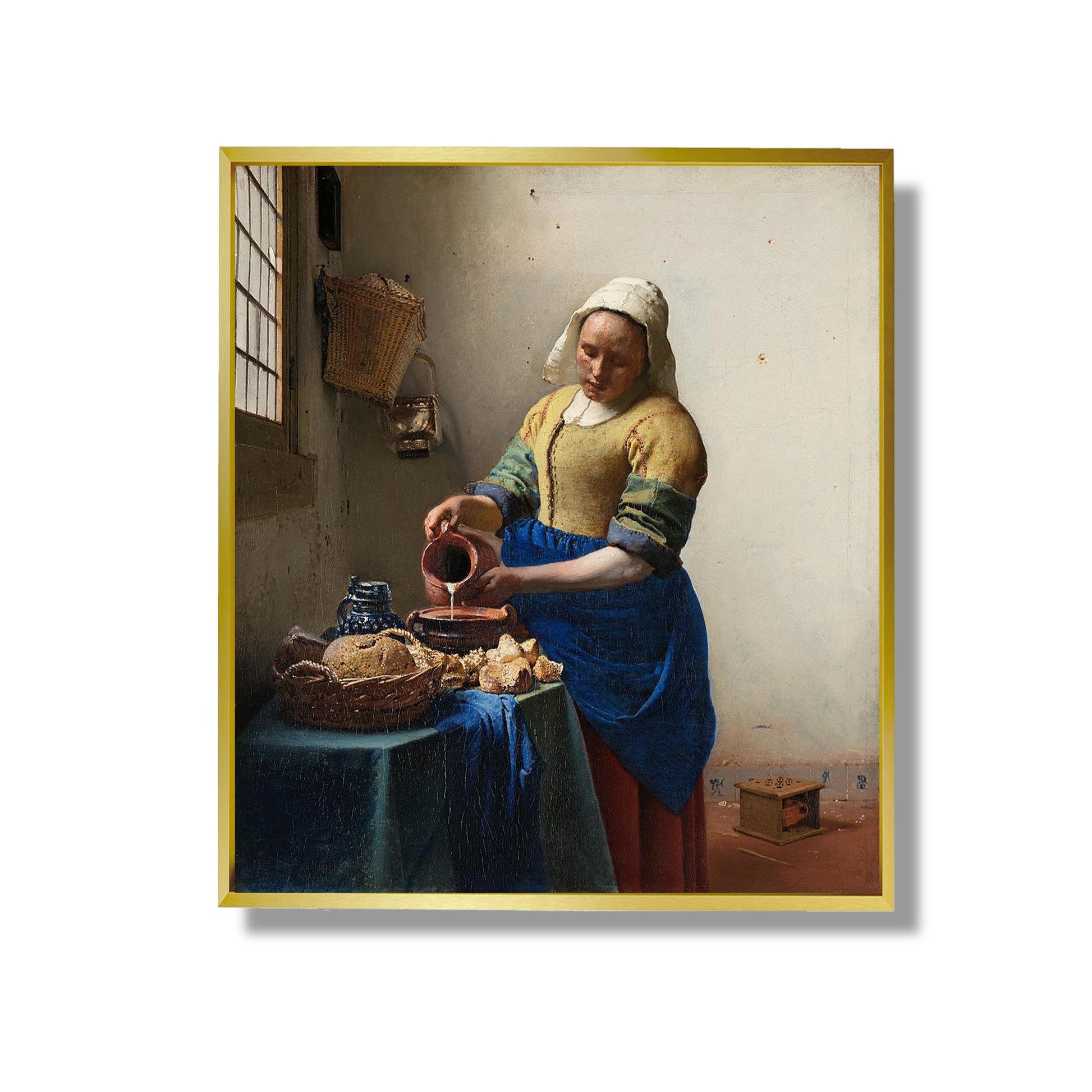 La Laitière de Johannes Vermeer (vers 1658) représente une femme versant du lait dans un bol, absorbée dans sa tâche. La lumière douce venant d'une fenêtre illumine la scène, mettant en valeur les textures et les couleurs vibrantes. Le tableau capture un moment simple du quotidien avec une précision quasi photographique, caractéristique du style de Vermeer. L'attention aux détails et le jeu de lumière créent une atmosphère intime et paisible.