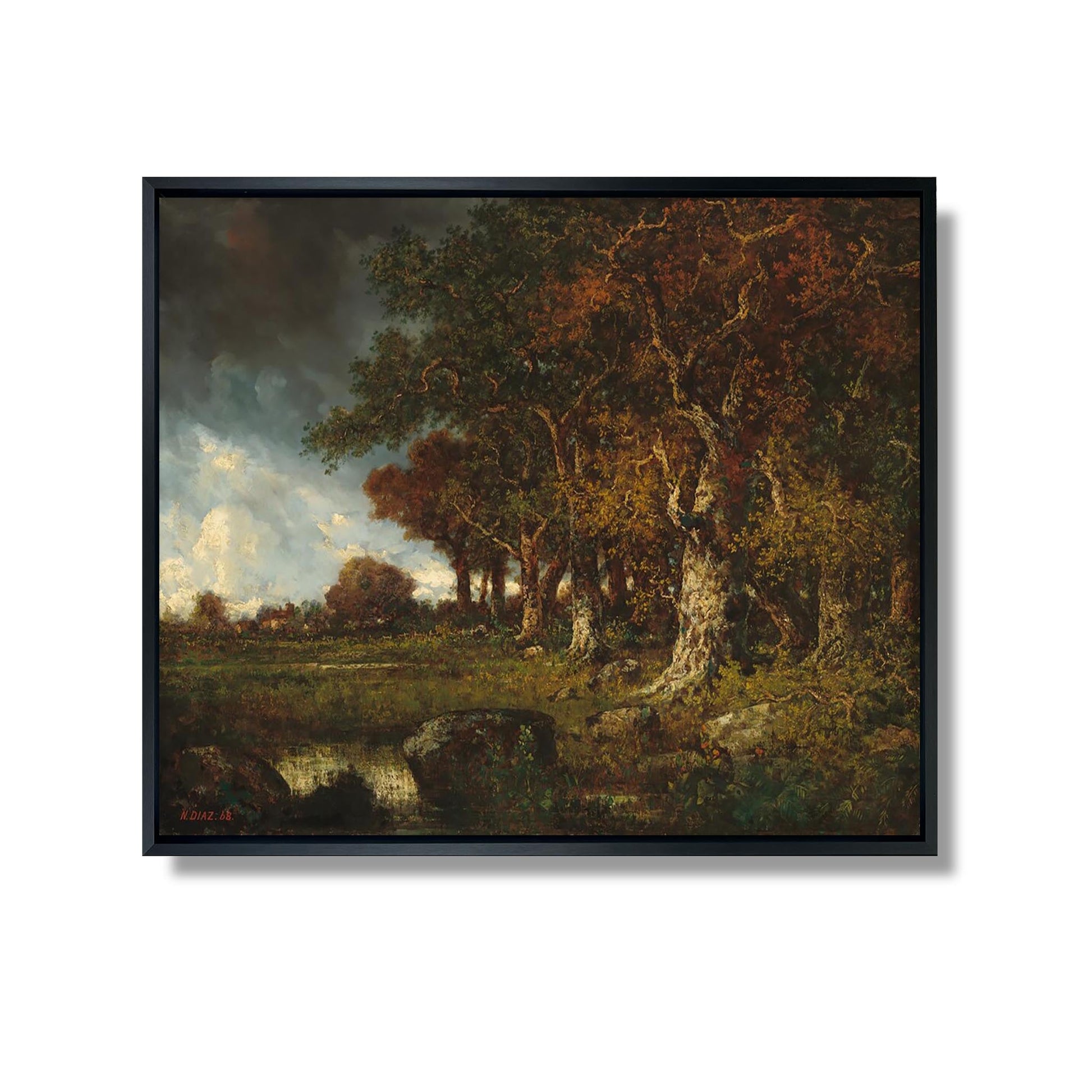 "La lisière de la forêt des Monts-Girard, Fontainebleau" est une œuvre emblématique de Narcisse Diaz de la Peña, un peintre français du XIXe siècle, connu pour son affiliation à l'école de Barbizon. Dans ce tableau, Diaz capture la beauté sauvage de la nature, représentant une scène paisible à la lisière d'une forêt. Les jeux de lumière et d'ombre, ainsi que la palette de couleurs riches, évoquent une atmosphère romantique et mélancolique. L'artiste, en s'inspirant de la forêt de Fontainebleau, célèbre la beauté du paysage français tout en explorant les thèmes de la solitude et de l'harmonie entre l'homme et la nature.