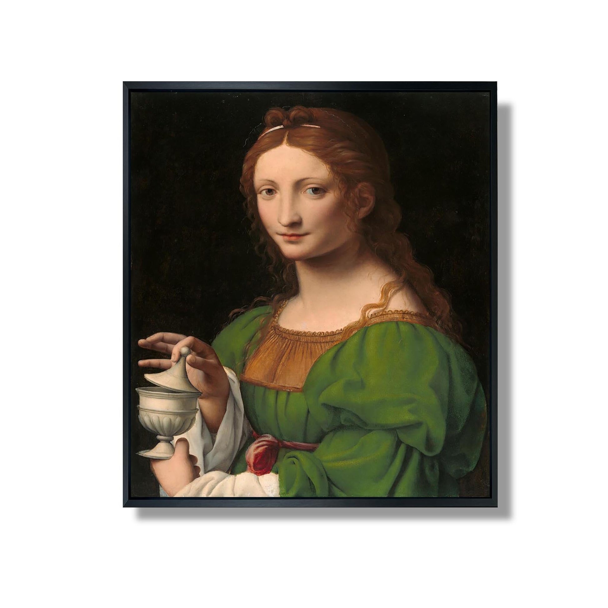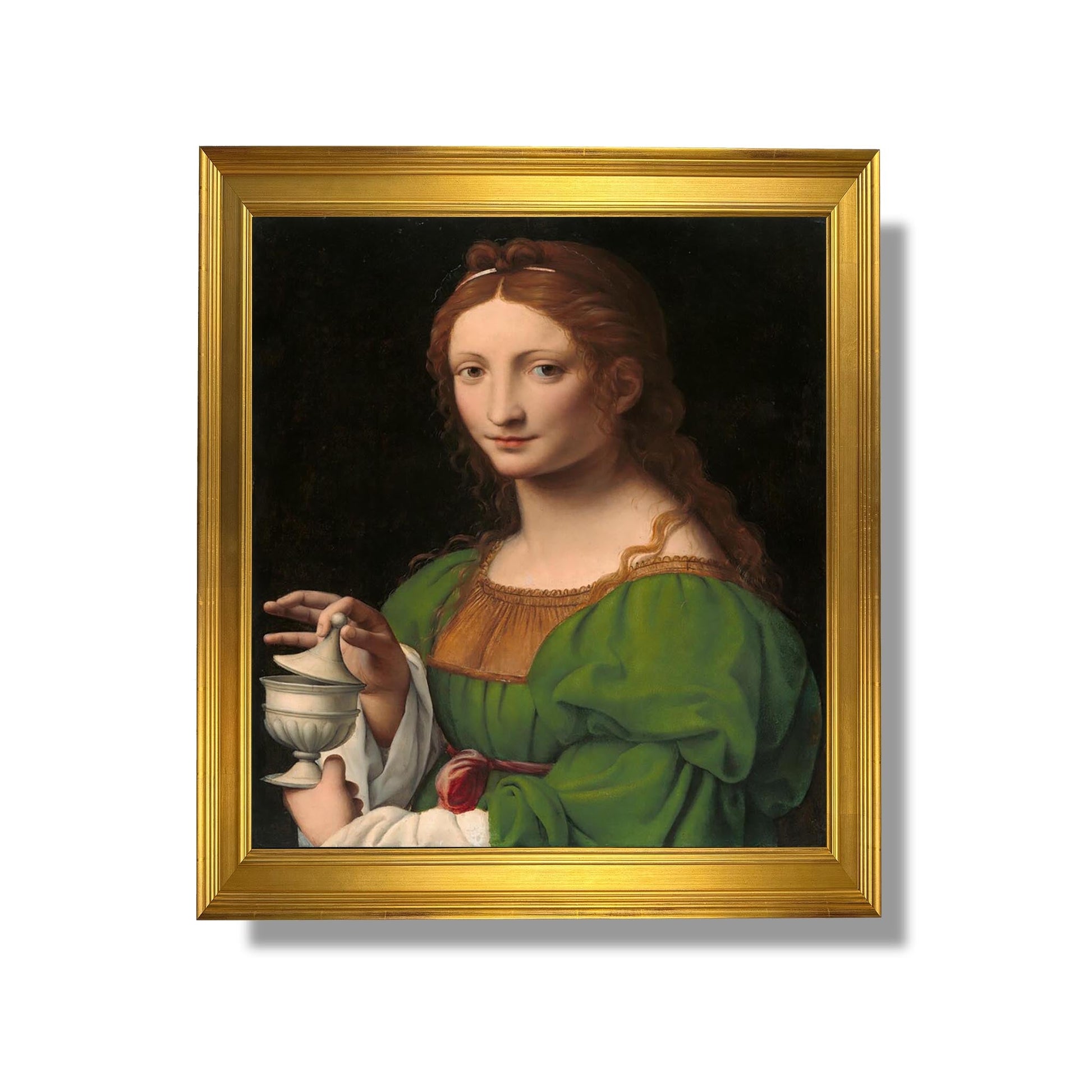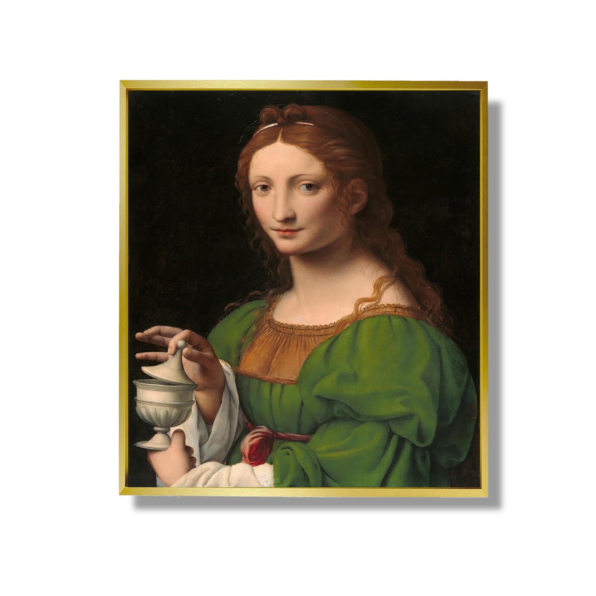 "La Madeleine" de Bernardino Luini est une œuvre emblématique de la Renaissance italienne, réalisée au début du XVIe siècle. Ce tableau représente Marie Madeleine, souvent associée à la pénitence et à la spiritualité. Luini, disciple de Léonard de Vinci, utilise une palette douce et des détails délicats pour capturer l'émotion et la beauté de son sujet. La figure de Madeleine, vêtue d'une robe richement colorée, est mise en valeur par un fond sombre qui accentue son expression contemplative. L'œuvre illustre la maîtrise de Luini dans l'art du portrait et sa capacité à transmettre des sentiments profonds à travers la peinture.