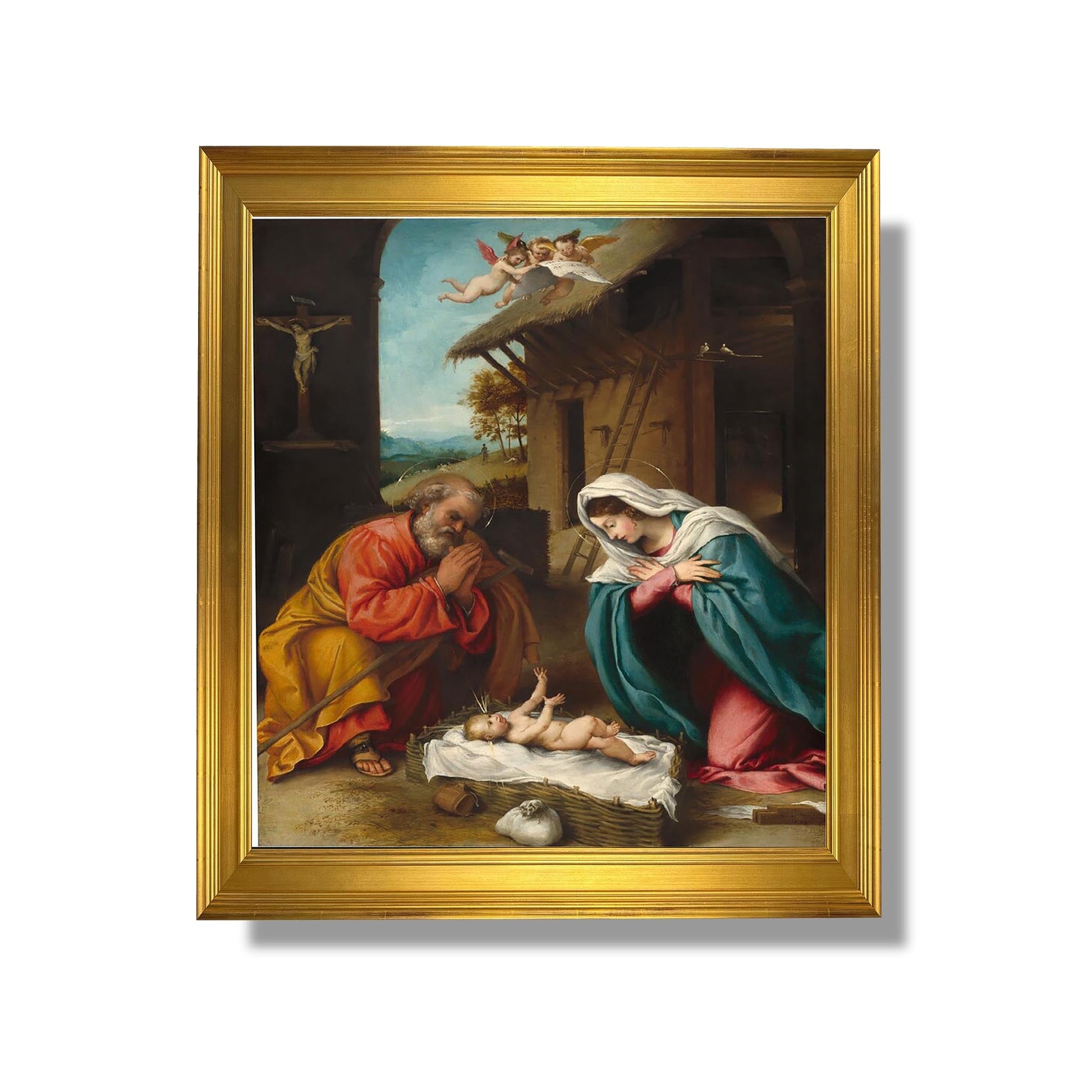 "La Nativité" de Lorenzo Lotto, réalisée au début du XVIe siècle, est une œuvre emblématique de la Renaissance italienne. Ce tableau représente la scène de la naissance de Jésus, mettant en avant une composition riche en émotions et en détails. Lotto utilise des couleurs vives et des jeux de lumière pour créer une atmosphère à la fois sacrée et intime. Les personnages, dont la Vierge Marie et Saint Joseph, sont dépeints avec une grande expressivité, tandis que les anges et les bergers ajoutent une dimension humaine à l'événement divin. Cette œuvre illustre la capacité de Lotto à fusionner spiritualité et réalisme, capturant l'essence de la foi chrétienne.