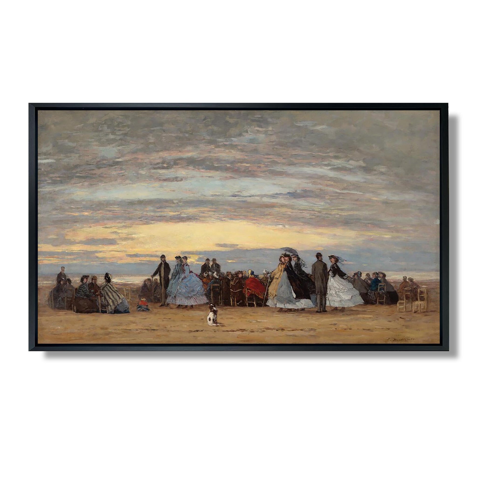 "La Plage à Villerville" est une œuvre emblématique d'Eugène Boudin, un maître du paysage maritime et précurseur de l'impressionnisme. Peinte en 1868, cette toile capture la beauté d'une plage normande, où le ciel nuageux se reflète dans les eaux calmes de la mer. Les personnages, souvent des baigneurs ou des promeneurs, ajoutent une dimension humaine à ce tableau. Boudin, avec sa technique de pinceau fluide et ses couleurs lumineuses, parvient à transmettre l'atmosphère vivante et changeante de la côte. Cette œuvre illustre son amour pour la nature et son talent à immortaliser des moments fugaces.