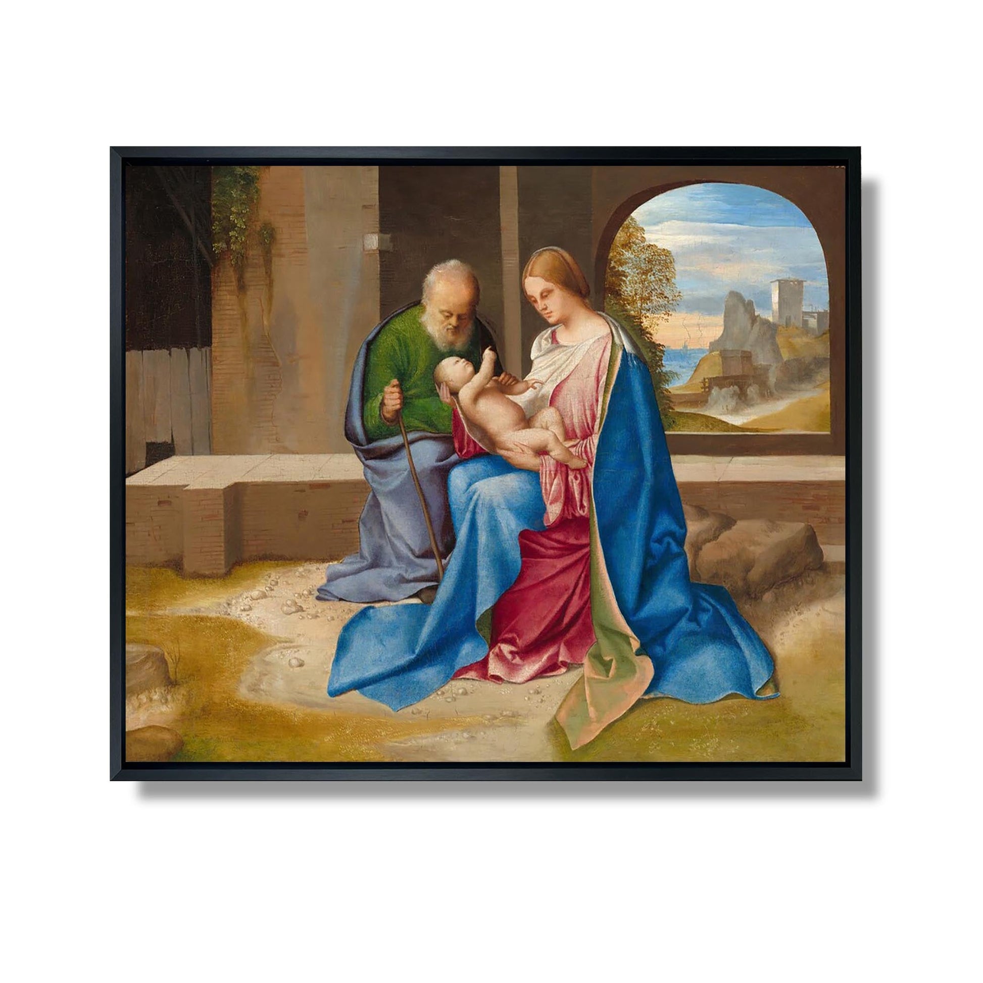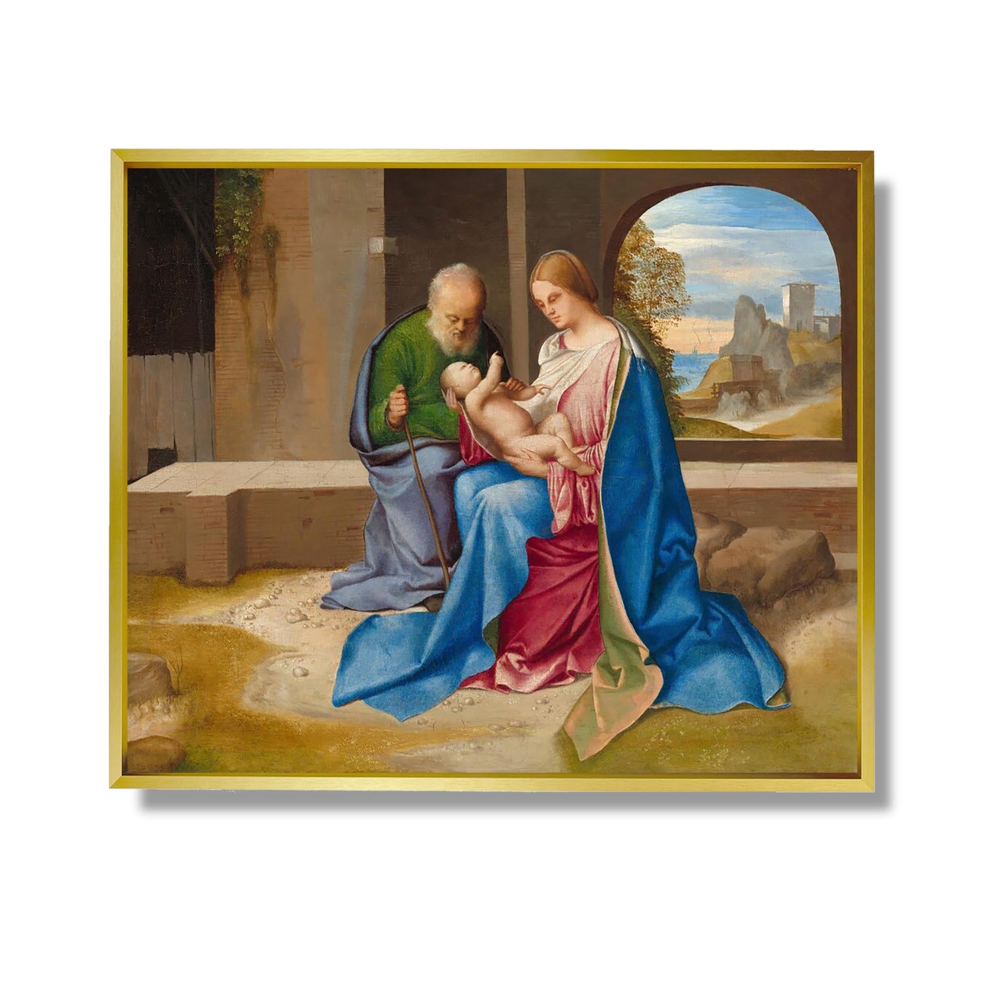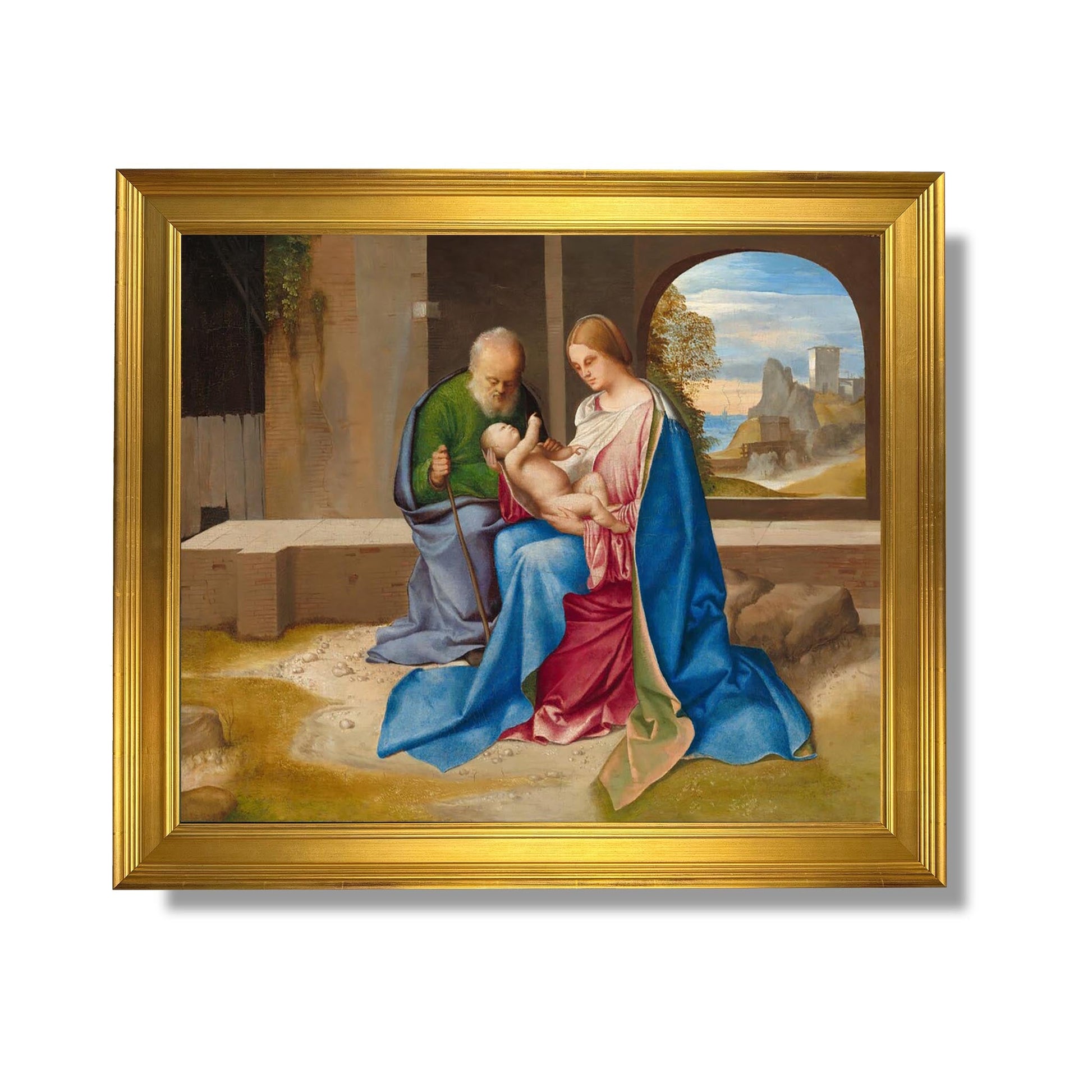 "La Sainte Famille" de Giorgione est une œuvre emblématique de la Renaissance vénitienne, réalisée vers 1500. Ce tableau représente la Vierge Marie, l'Enfant Jésus et Saint Joseph dans un cadre pastoral, symbolisant l'harmonie entre la nature et la spiritualité. Giorgione se distingue par son utilisation subtile de la lumière et des couleurs, créant une atmosphère douce et contemplative. Les figures sont disposées de manière à évoquer une intimité familiale, tandis que le paysage en arrière-plan renforce le sentiment de sérénité. Cette œuvre illustre parfaitement le passage vers un art plus humaniste, où l'émotion et la beauté naturelle prennent le pas sur la rigueur religieuse.