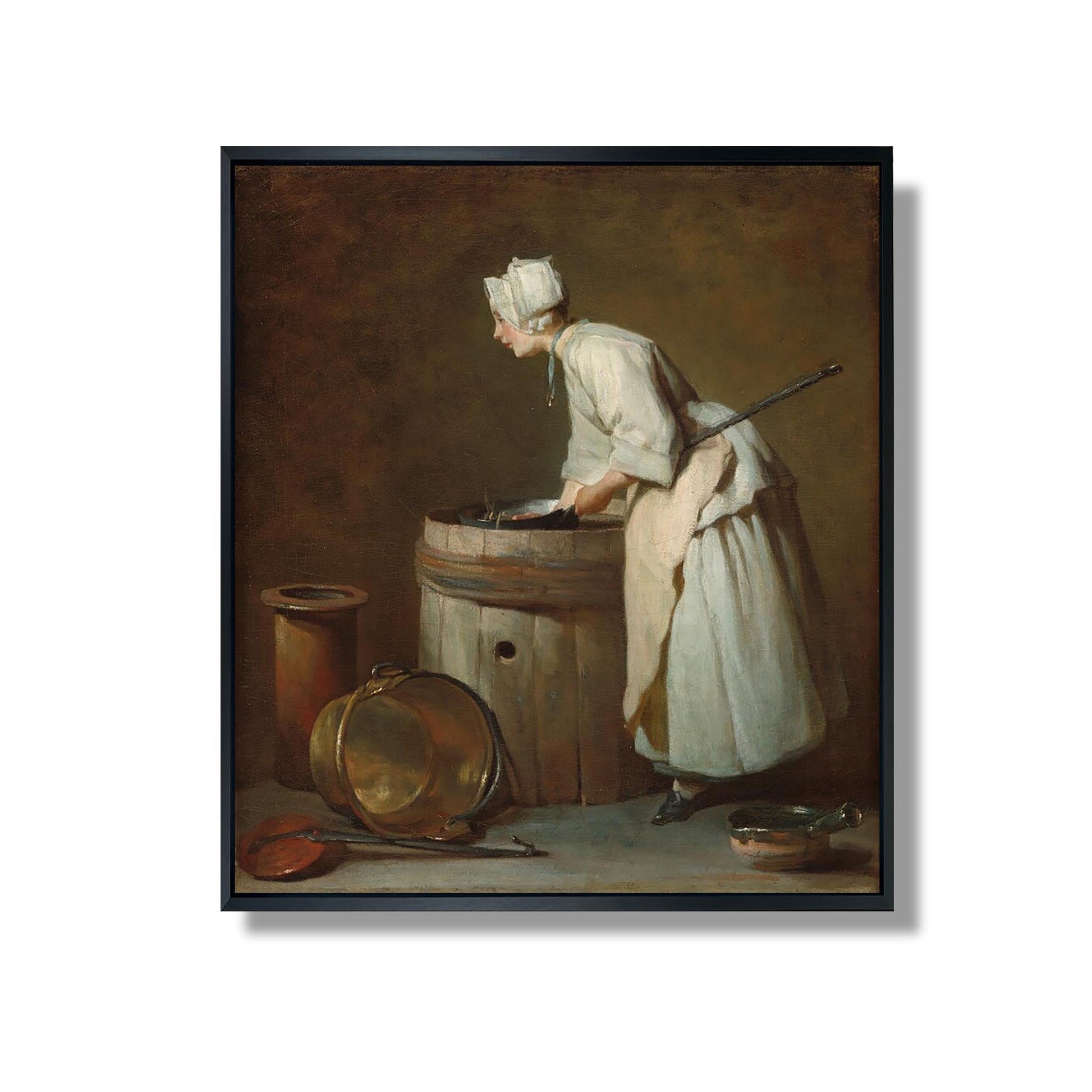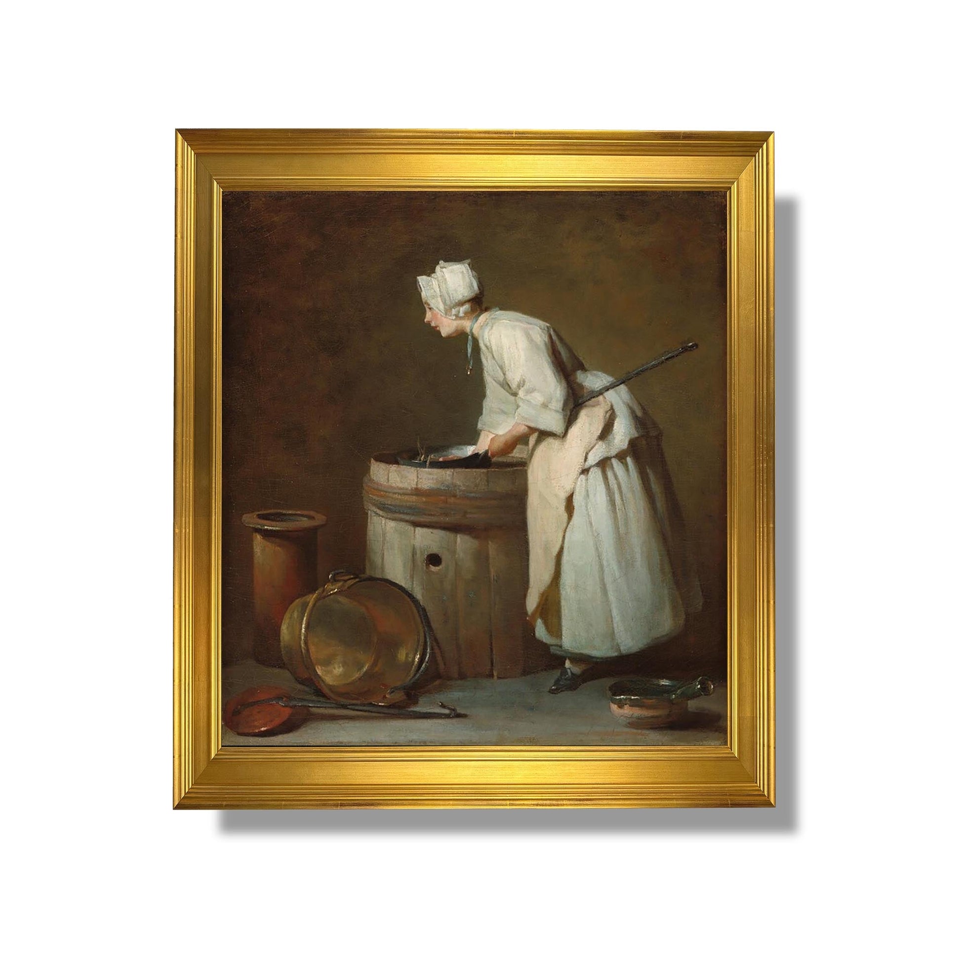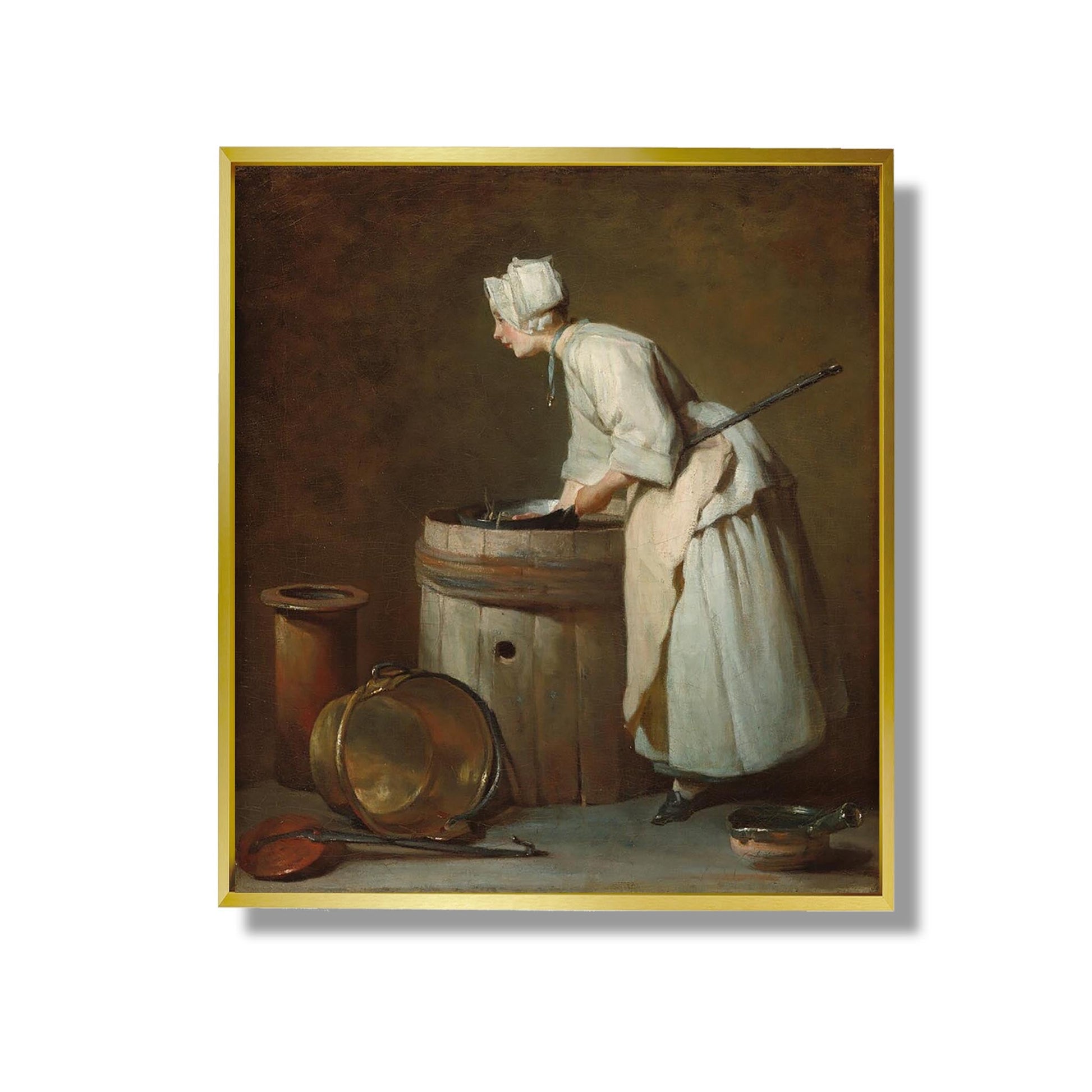 "La Servante de cuisine" de Jean Siméon Chardin, réalisée en 1735, est une œuvre emblématique du mouvement rococo français. Ce tableau met en scène une jeune servante, concentrée sur sa tâche, qui prépare un repas dans une cuisine modeste. La lumière douce et les couleurs chaudes créent une atmosphère intimiste, tandis que les détails minutieux des ustensiles et des aliments témoignent du réalisme cher à Chardin. L'œuvre souligne la dignité du travail quotidien et la beauté des scènes de la vie ordinaire, révélant ainsi la sensibilité de l'artiste pour les moments simples et authentiques.