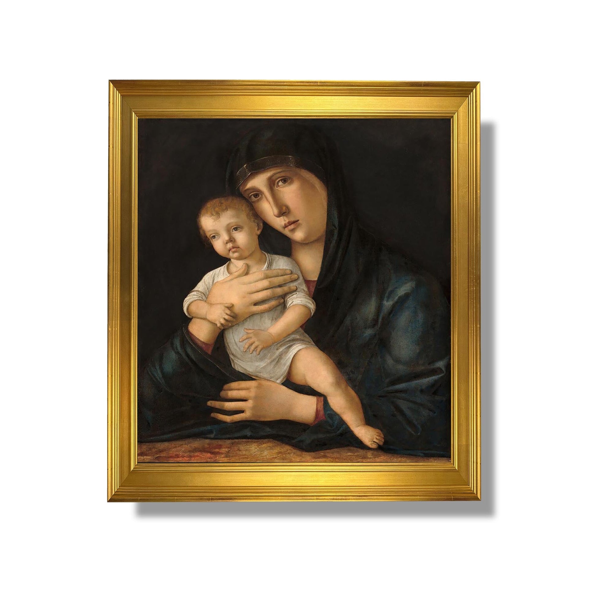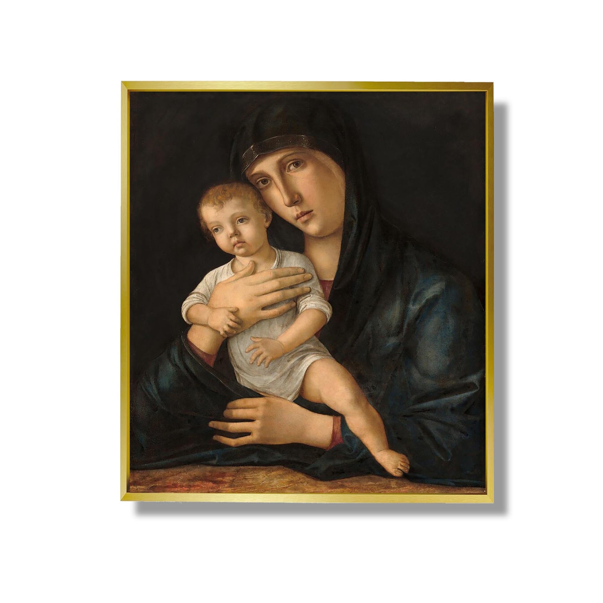 "La Vierge à l'Enfant" de Giovanni Bellini est une œuvre emblématique de la Renaissance vénitienne, réalisée vers 1480. Ce tableau représente la Vierge Marie tenant l'Enfant Jésus dans un cadre intime et sacré. La douceur des visages et la luminosité des couleurs témoignent du style unique de Bellini, qui allie réalisme et spiritualité. La composition est harmonieuse, avec des éléments naturels en arrière-plan, symbolisant la connexion entre le divin et le monde terrestre. Cette œuvre illustre la maîtrise de Bellini dans l'utilisation de la lumière et des textures, faisant de lui un pionnier de la peinture italienne.
