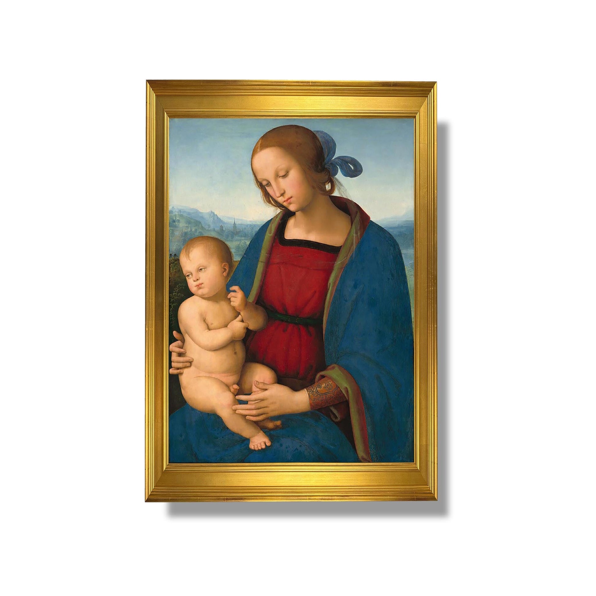 "La Vierge à l'Enfant" de Pietro Perugino est une œuvre emblématique de la Renaissance italienne, réalisée vers la fin du XVe siècle. Ce tableau représente la Vierge Marie tenant l'Enfant Jésus dans un cadre serein et harmonieux. La composition se distingue par son équilibre et sa douceur, caractéristiques du style de Perugino. Les couleurs délicates et la lumière douce créent une atmosphère de paix et de spiritualité. L'artiste utilise des lignes fluides et des détails minutieux pour accentuer l'humanité des personnages. Cette œuvre illustre parfaitement la quête de beauté et de divinité propre à la Renaissance.
