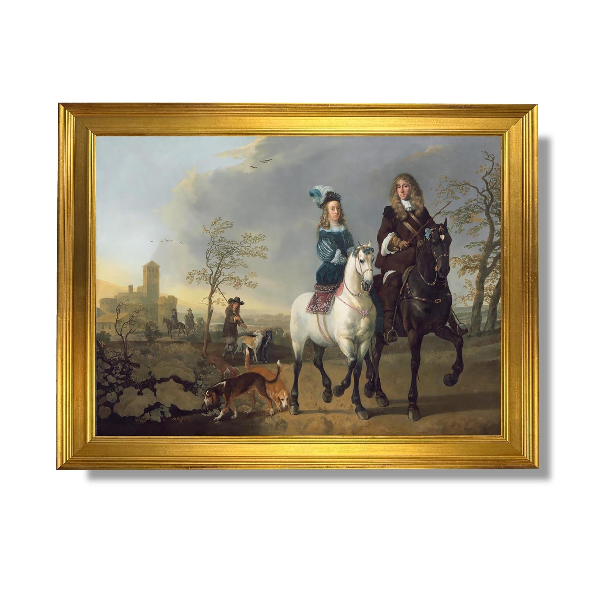 "Lady and Gentleman on Horseback" est une œuvre emblématique du peintre néerlandais Aelbert Cuyp, réalisée au XVIIe siècle. Ce tableau illustre un couple aristocratique monté à cheval, symbolisant la noblesse et la richesse de l'époque. Cuyp, connu pour sa maîtrise de la lumière et des paysages, crée une atmosphère sereine grâce à des couleurs douces et des détails raffinés. Le fond pastoral, avec ses collines verdoyantes et un ciel lumineux, renforce l'harmonie entre l'homme, la nature et la société. Cette œuvre témoigne de l'idéal de vie rurale et de l'élégance de la haute société hollandaise.