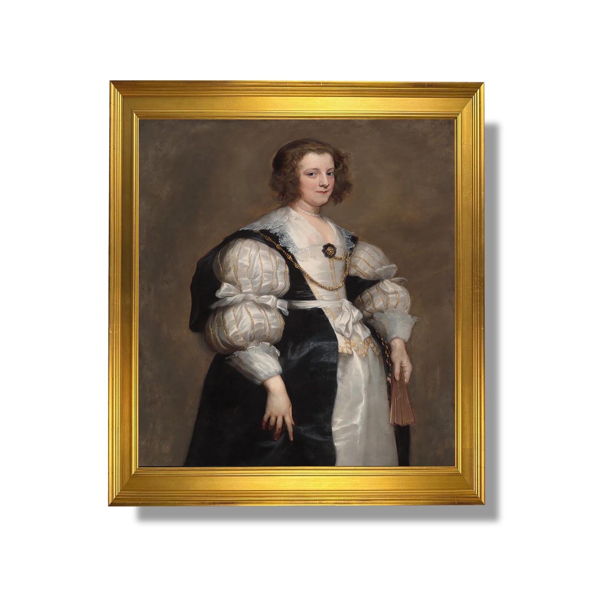 "Lady with a Fan" est une œuvre emblématique de Sir Anthony van Dyck, réalisée vers 1635. Ce portrait représente une noble femme, souvent identifiée comme la comtesse de Southampton, tenant un éventail délicat. Van Dyck, maître du portrait baroque, capture avec finesse la grâce et l'élégance de son modèle, utilisant des couleurs riches et des jeux de lumière pour accentuer la texture des vêtements et la douceur du visage. L'œuvre illustre non seulement le talent technique de l'artiste, mais aussi son habileté à transmettre la personnalité et le statut social de ses sujets, faisant de ce tableau un chef-d'œuvre intemporel.
