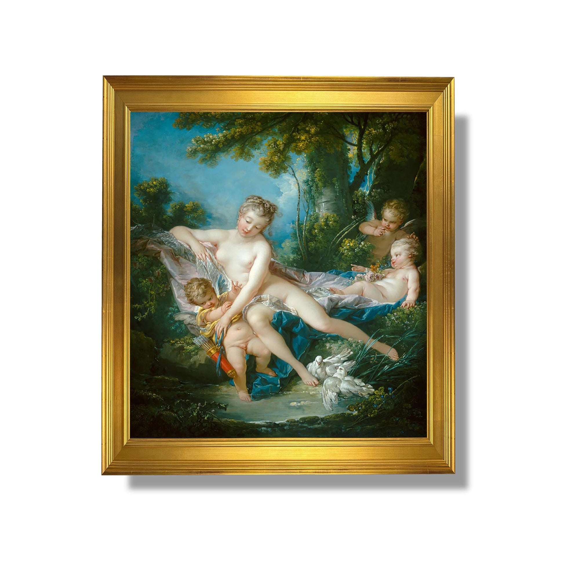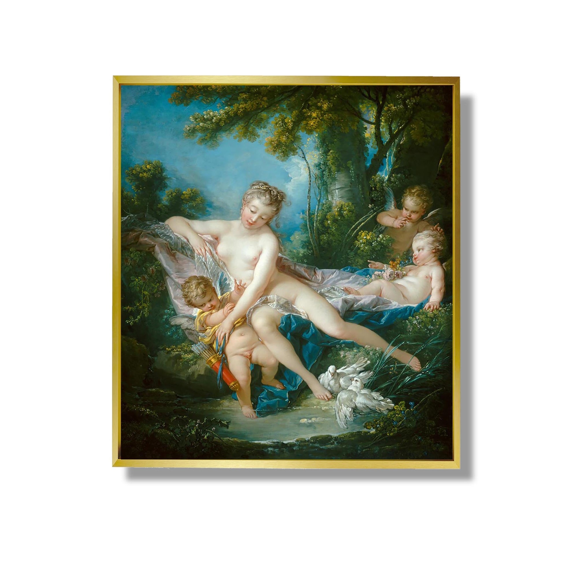 "Le Bain de Vénus" est une œuvre emblématique de François Boucher, peinte en 1751. Ce tableau illustre la mythologie classique, représentant Vénus, déesse de l'amour, entourée de nymphes dans un cadre bucolique. La composition est caractérisée par des couleurs pastel délicates et une lumière douce, créant une atmosphère de sensualité et de rêve. Boucher, maître du rococo, utilise des formes courbes et des détails raffinés pour accentuer la beauté des figures féminines. Cette œuvre incarne l'idéal de la beauté et de l'amour au XVIIIe siècle, tout en reflétant le goût de l'époque pour la légèreté et l'élégance.