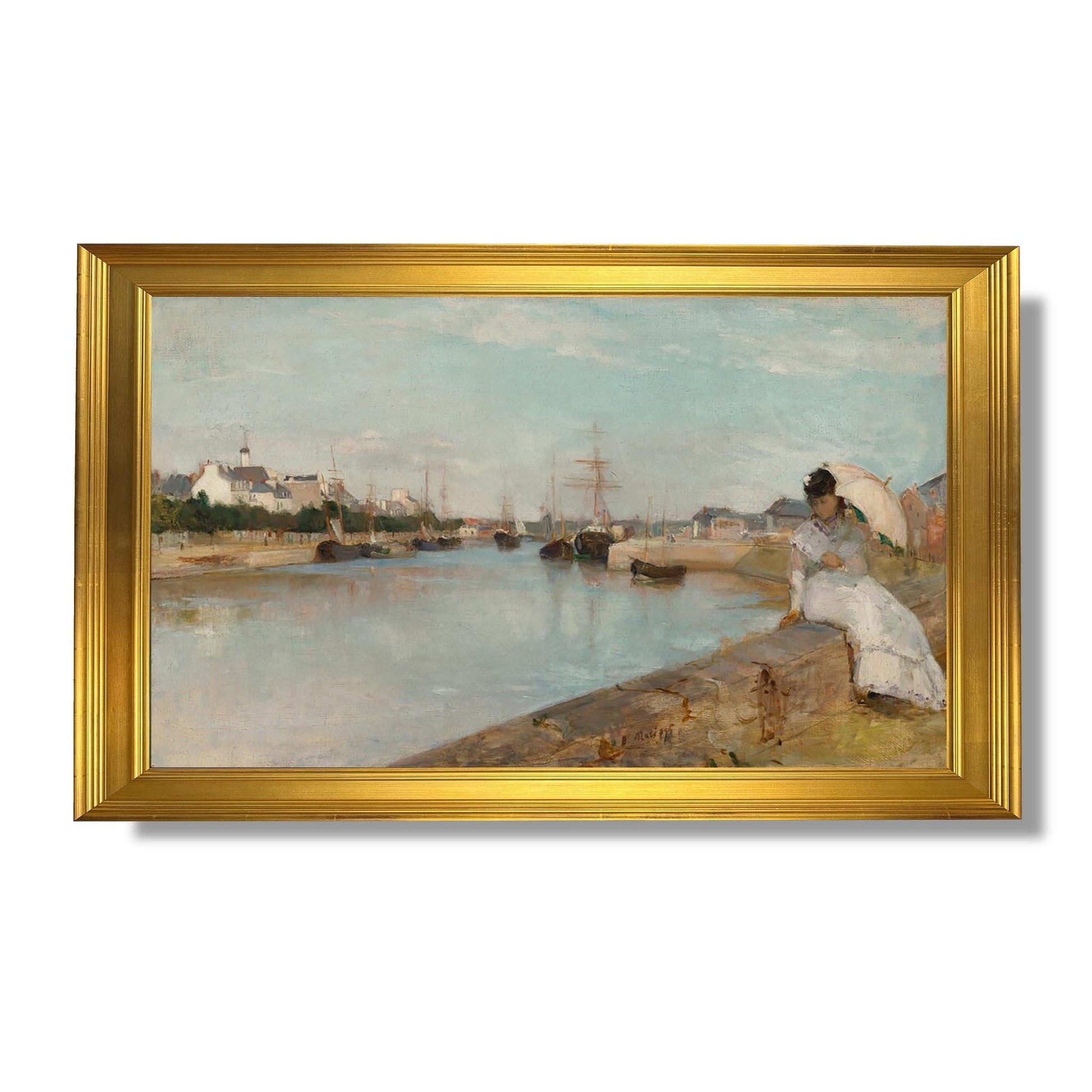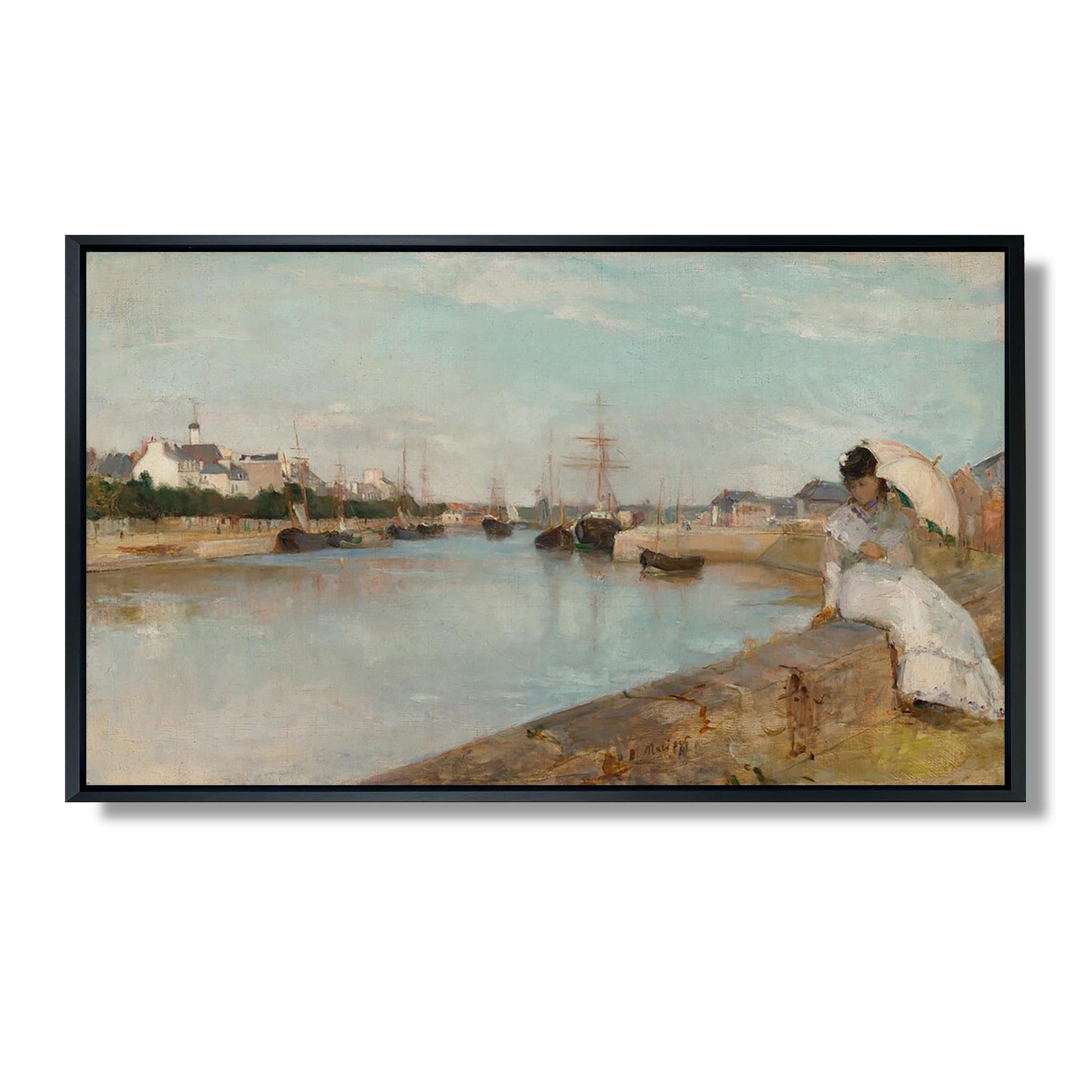 "Le Port de Lorient" est une œuvre emblématique de Berthe Morisot, une figure majeure du mouvement impressionniste. Peinte en 1869, cette toile capture la beauté éphémère d'un port breton, où la lumière joue sur les voiles des bateaux et les reflets dans l'eau. Morisot, connue pour sa sensibilité et son regard unique sur la vie quotidienne, utilise des touches de pinceau délicates et des couleurs pastel pour évoquer une atmosphère de sérénité. Cette œuvre illustre son talent à saisir des moments fugaces, tout en mettant en avant la place des femmes dans l'art, tant par son sujet que par son approche novatrice.