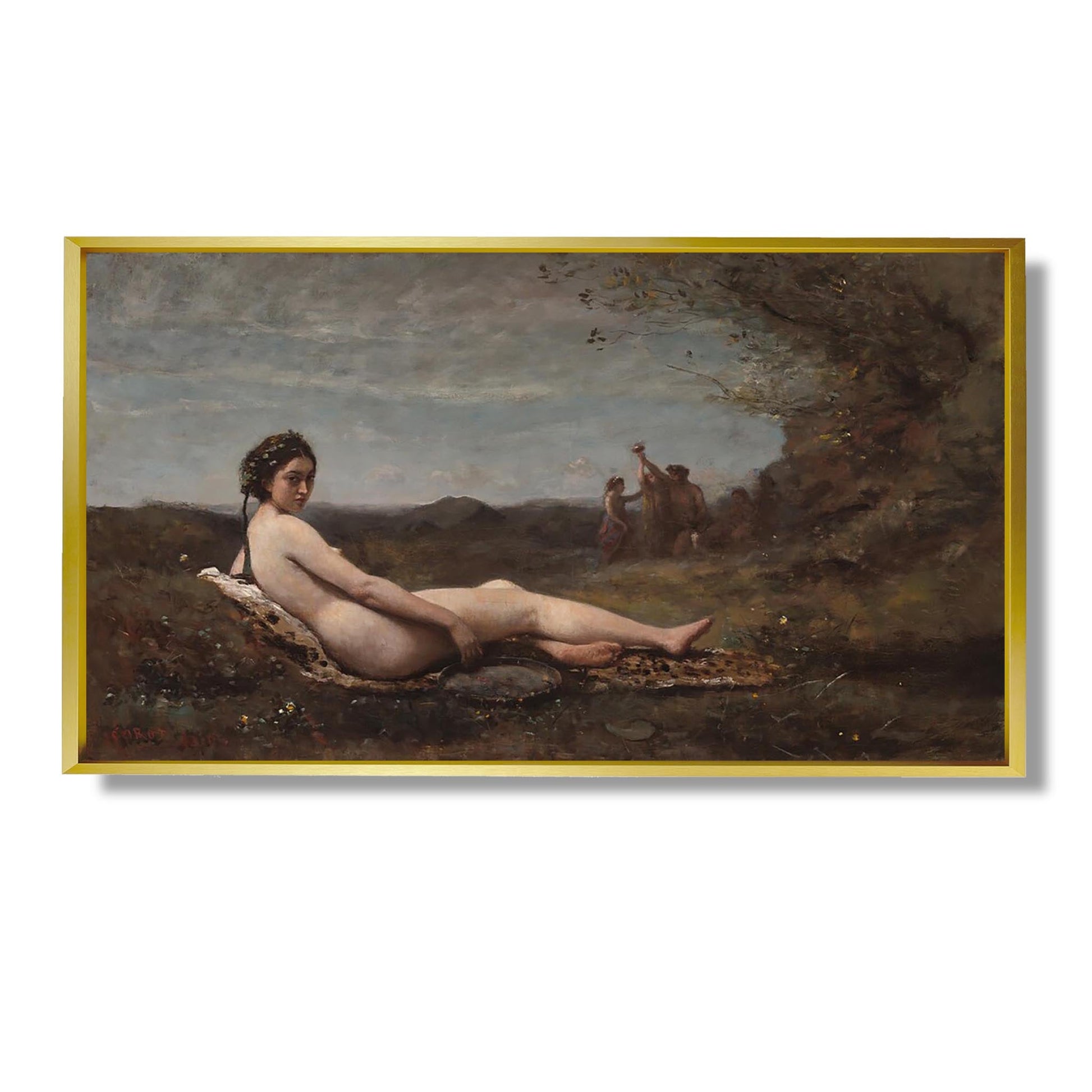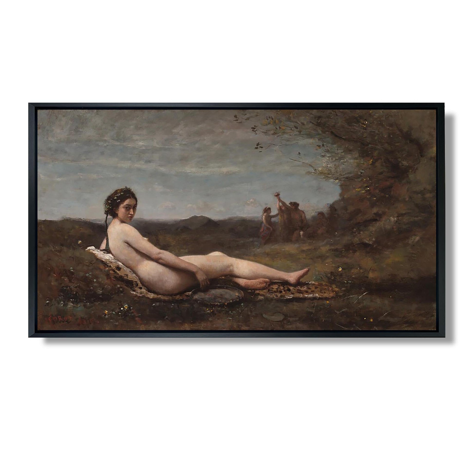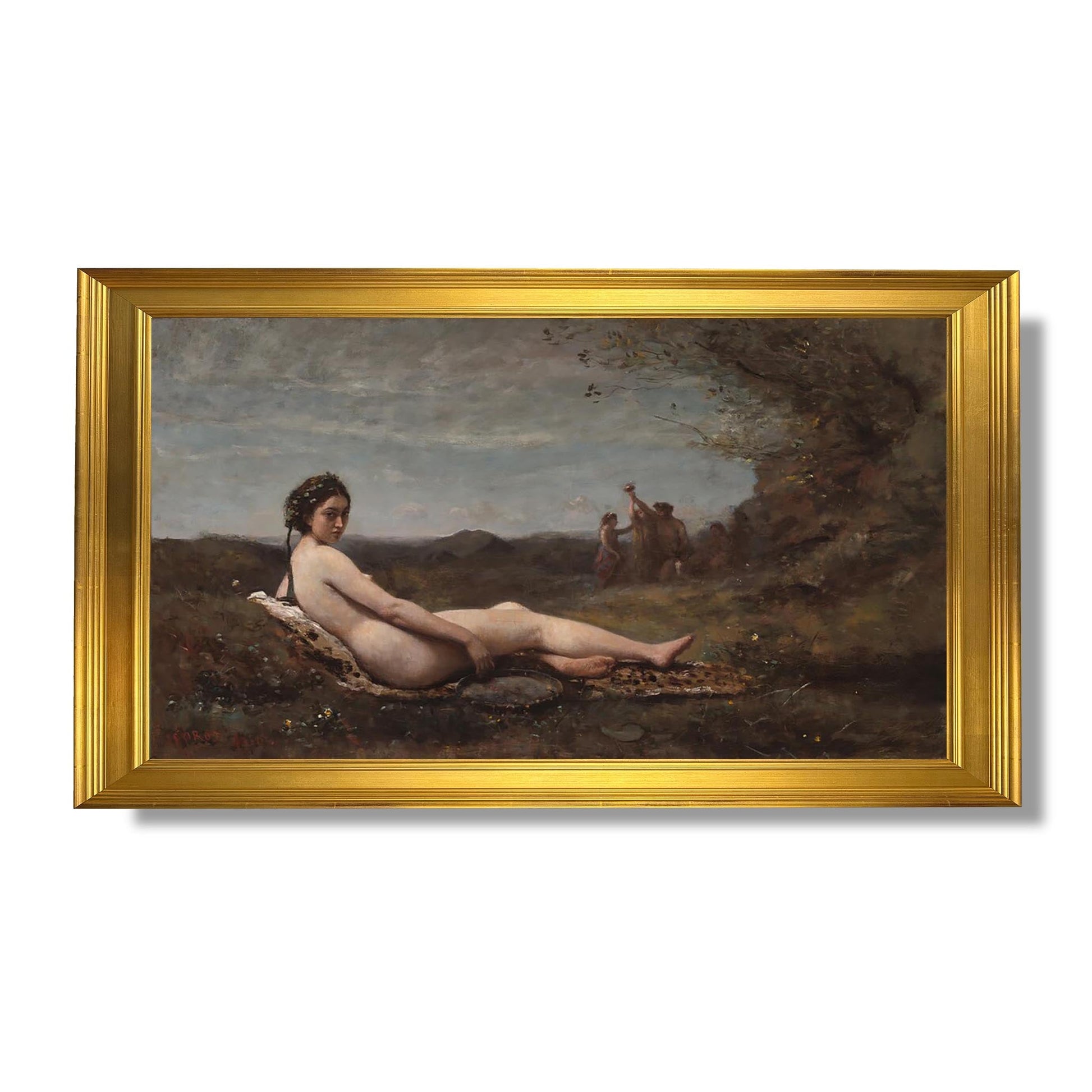 "Le Repos" de Jean-Baptiste-Camille Corot, peint en 1868, est une œuvre emblématique du mouvement romantique et du paysage impressionniste. Ce tableau représente une scène bucolique où une jeune femme repose paisiblement sous un arbre, entourée d'une nature luxuriante. La lumière douce et diffuse crée une atmosphère sereine, invitant à la contemplation. Corot, maître du paysage, utilise des touches de couleur délicates pour capturer la beauté éphémère de la nature. Cette œuvre illustre son talent à harmoniser l'humain et le naturel, tout en évoquant un sentiment de tranquillité et de rêve.