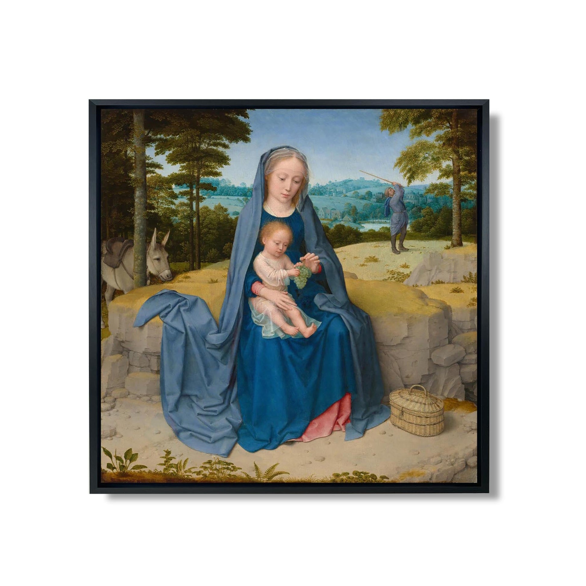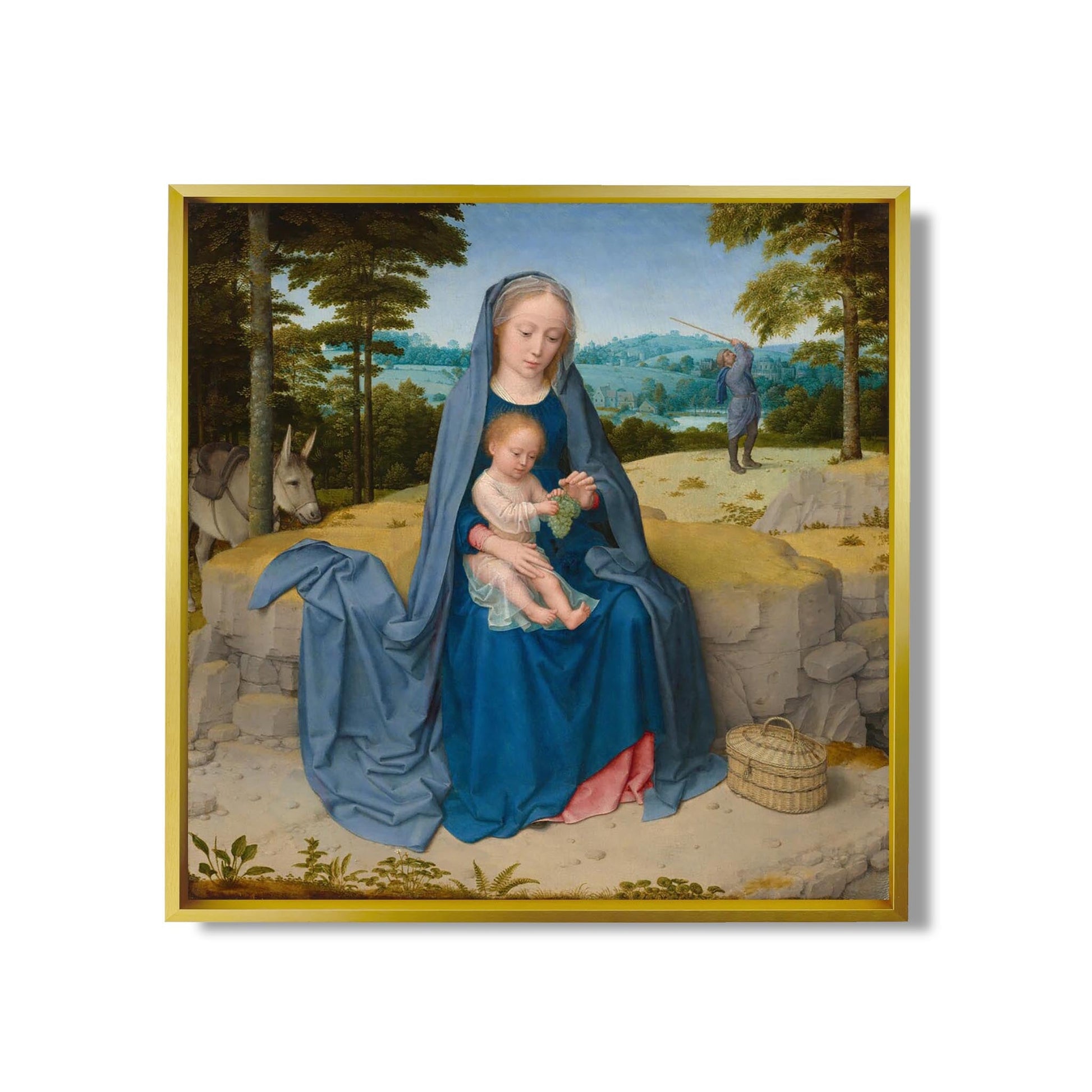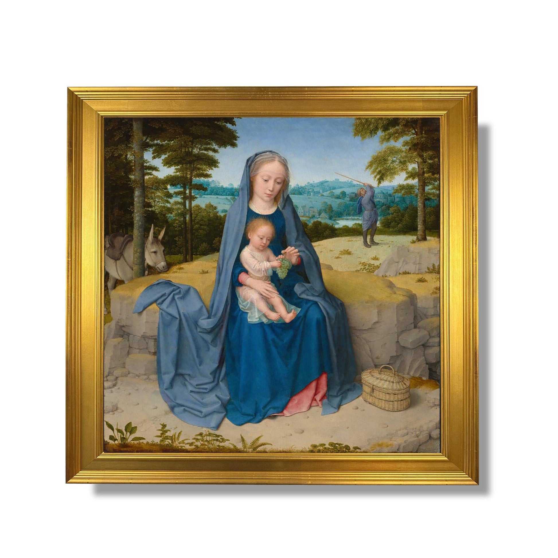 "Le Repos pendant la fuite en Égypte" de Gérard David est une œuvre emblématique de la peinture flamande du début du XVIe siècle. Réalisée vers 1500, elle illustre un moment de pause de la Sainte Famille lors de leur fuite en Égypte, fuyant la persécution d'Hérode. La composition met en avant la tendresse entre Marie, Joseph et l'Enfant Jésus, entourés d'une nature luxuriante. Les détails minutieux et les couleurs vives témoignent du talent de David pour capturer la lumière et l'émotion. Cette œuvre allie spiritualité et humanité, reflétant la profondeur de la foi chrétienne tout en célébrant la beauté du quotidien.