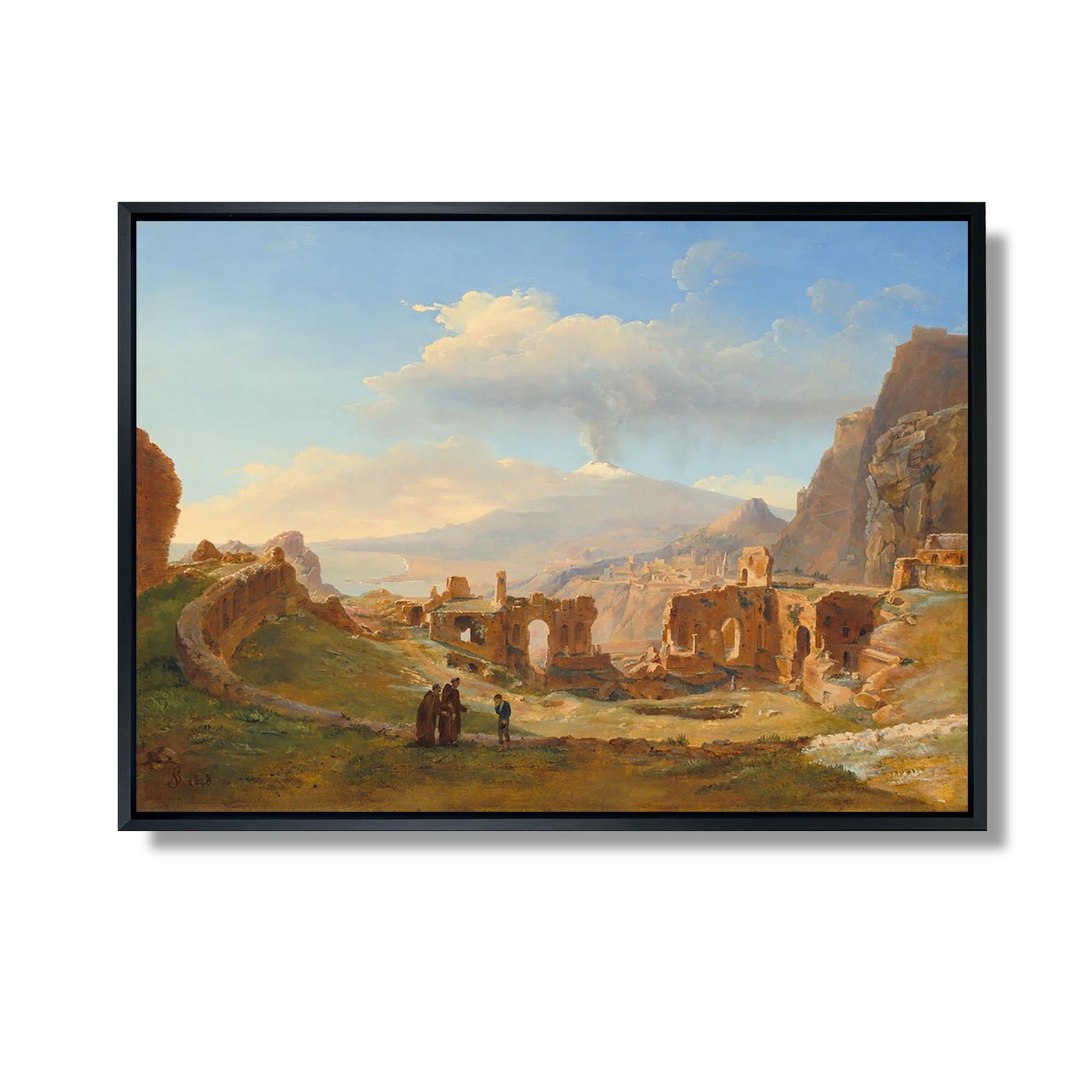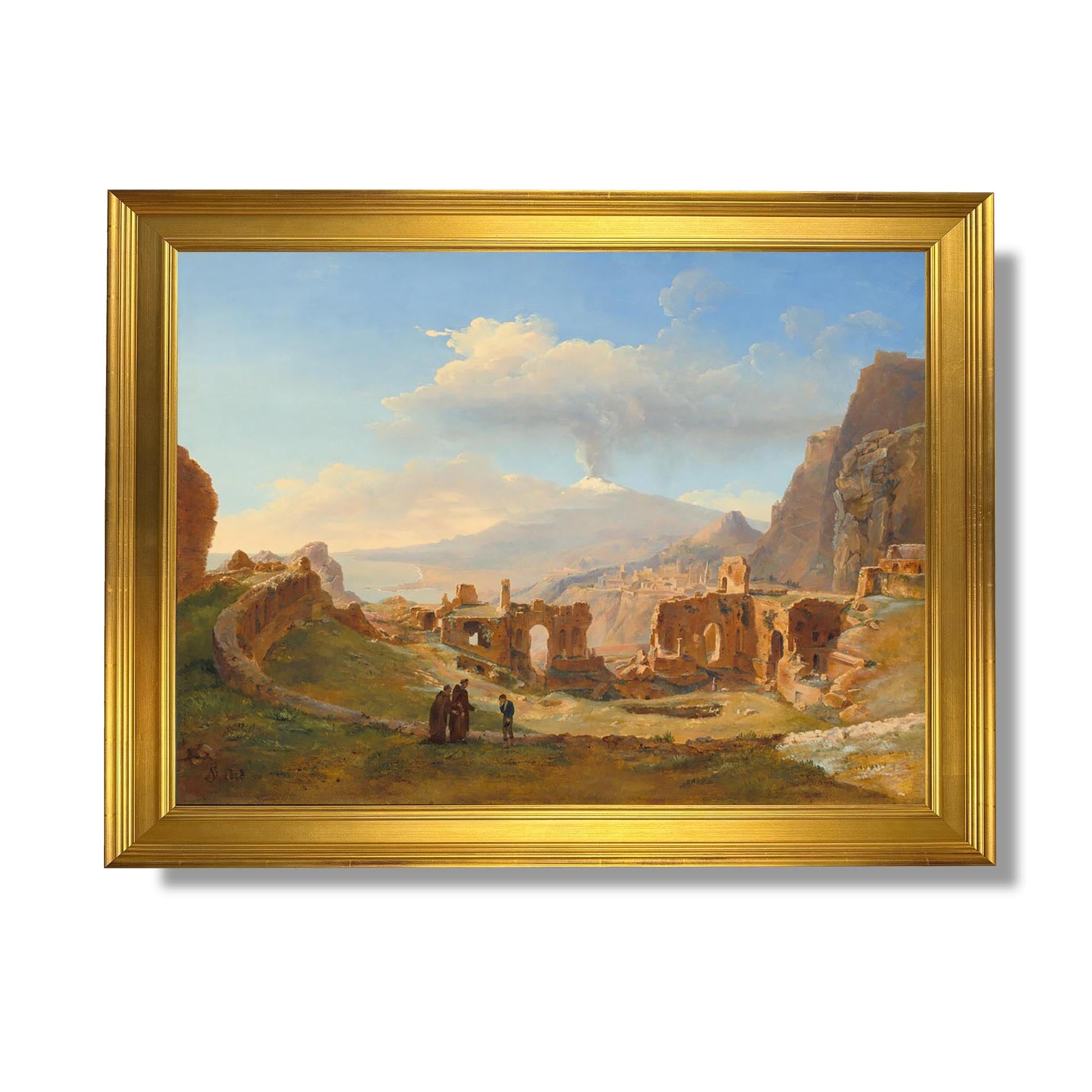Le théâtre romain de Taormine, œuvre de Louise-Joséphine Sarazin de Belmont, est une représentation fascinante de l'architecture antique et de la beauté naturelle de la Sicile. Réalisée au XIXe siècle, cette peinture capture l'harmonie entre les vestiges historiques et le paysage environnant. L'artiste, pionnière dans le domaine du paysage, utilise des couleurs vives et des détails minutieux pour évoquer l'atmosphère méditerranéenne. Son œuvre témoigne d'un profond respect pour l'héritage culturel tout en célébrant la lumière et la nature, offrant ainsi une vision romantique et nostalgique de ce site emblématique.