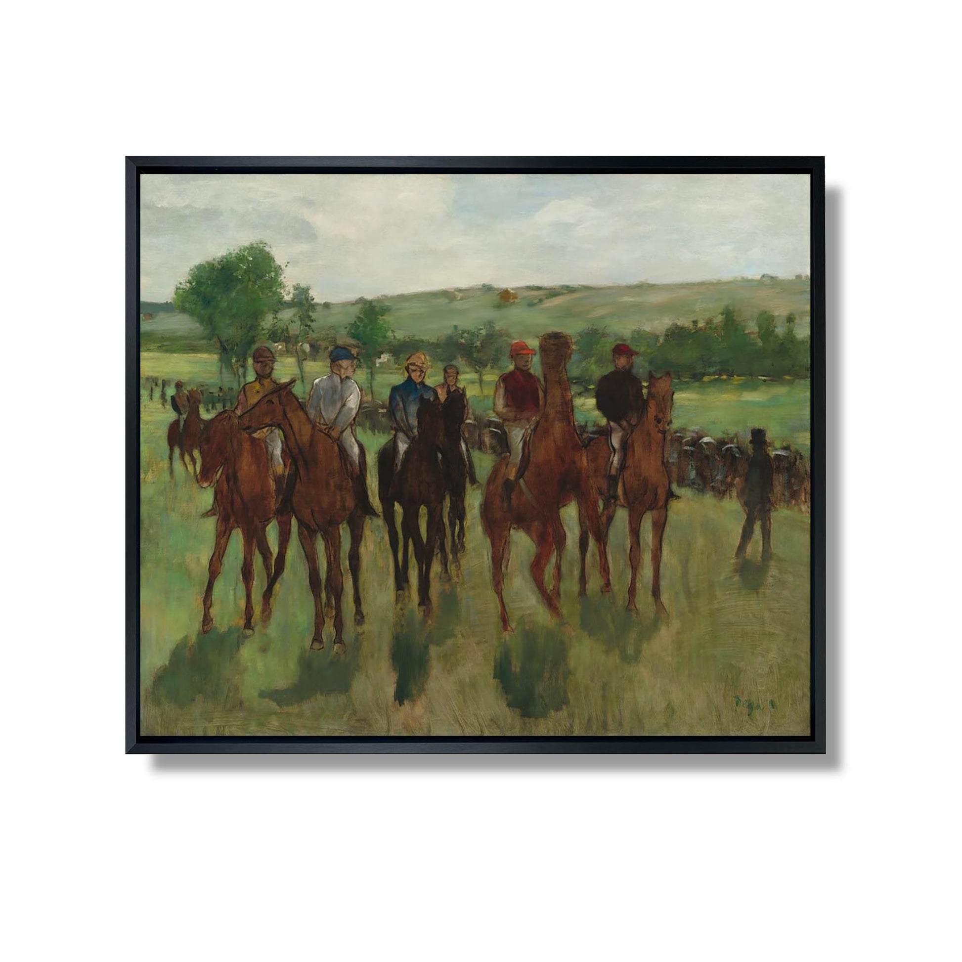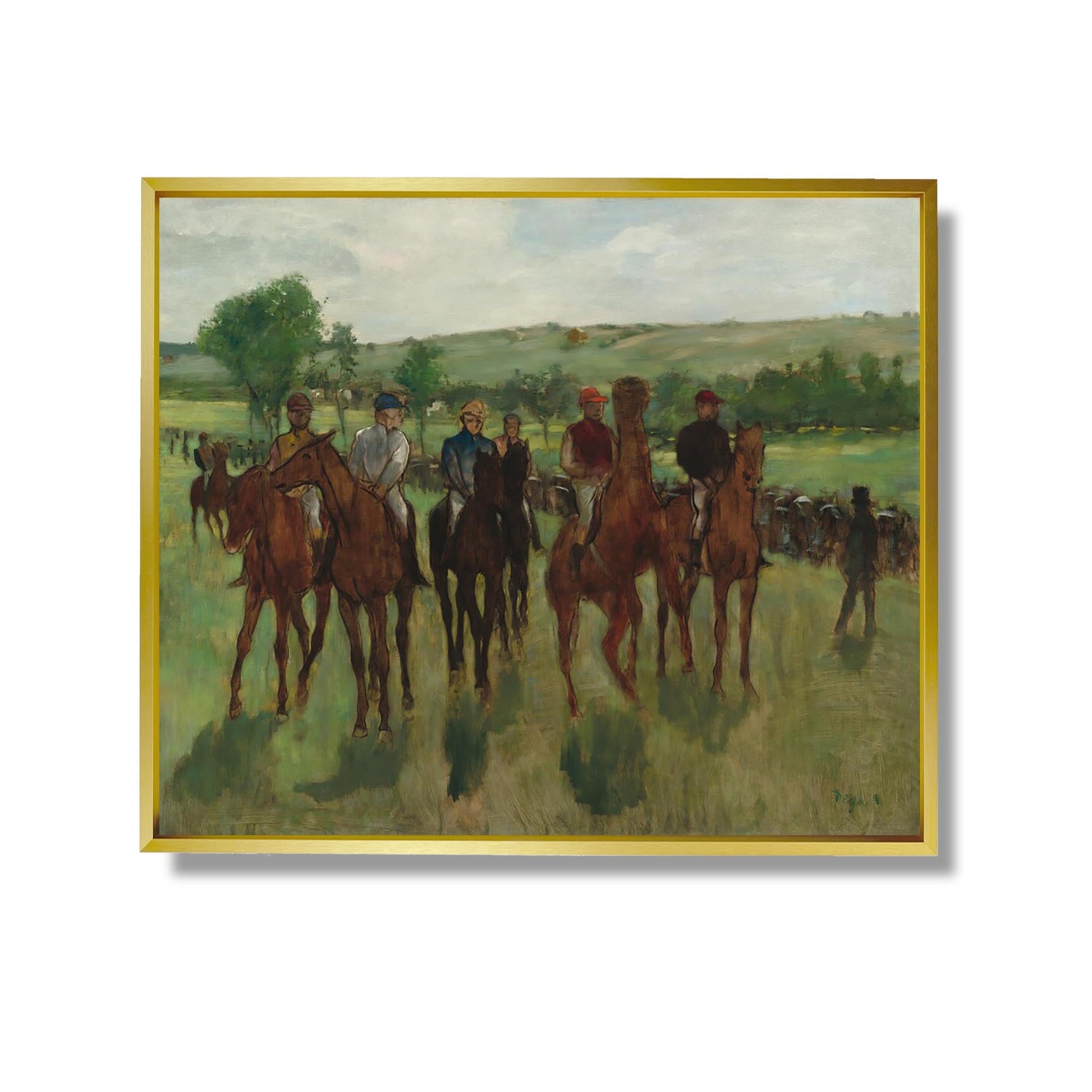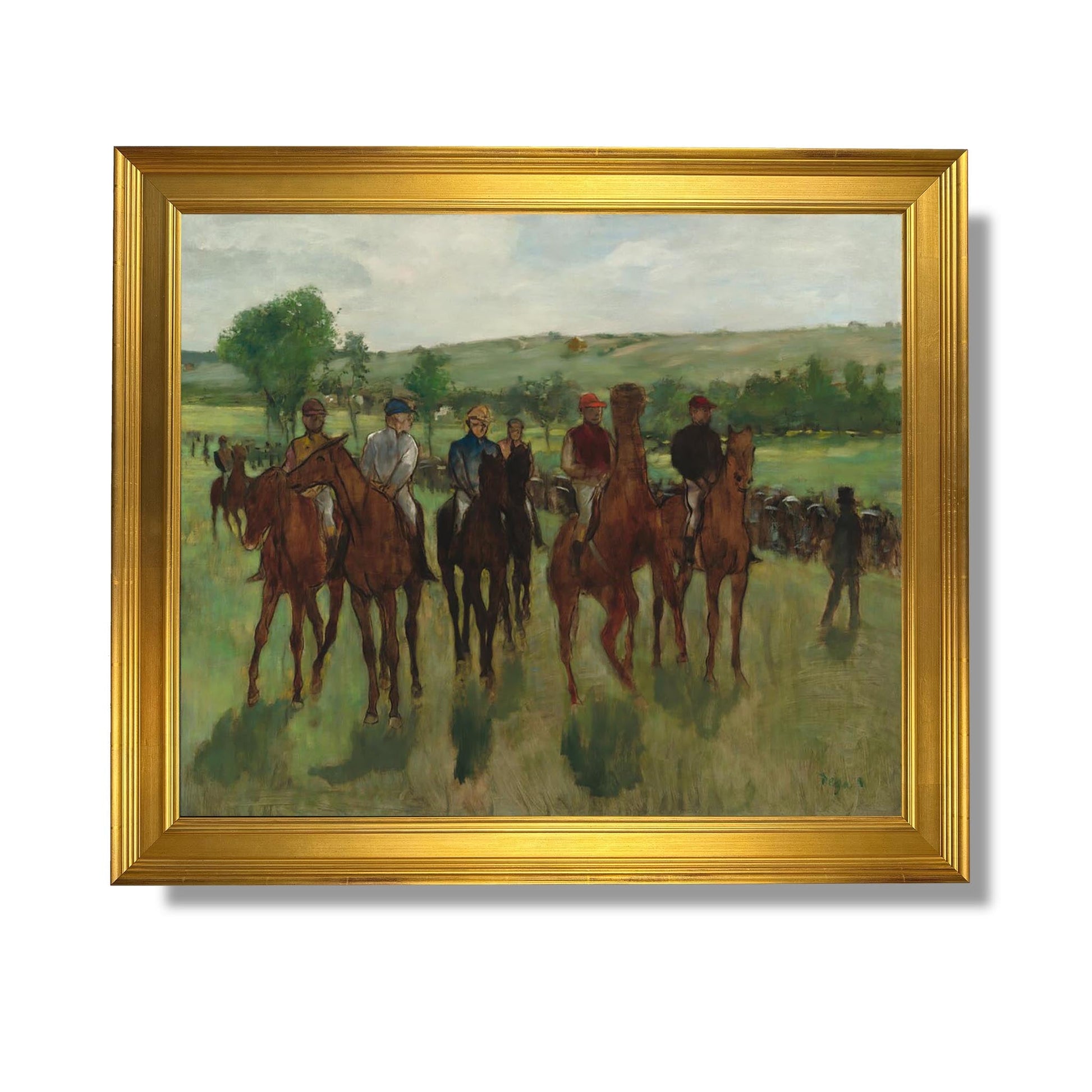 "Les Cavaliers" est une œuvre emblématique d'Edgar Degas, réalisée en 1868. Ce tableau illustre la passion de l'artiste pour le mouvement et la vie quotidienne, capturant une scène dynamique de cavaliers en action. Degas, connu pour son approche innovante, utilise des angles audacieux et des compositions asymétriques pour transmettre une impression de mouvement. Les couleurs vives et les détails minutieux des chevaux et des cavaliers révèlent son habileté à représenter la lumière et l'ombre. Cette œuvre témoigne de l'intérêt de Degas pour le sport et la modernité, tout en préfigurant son exploration ultérieure de la danse et de la vie urbaine.