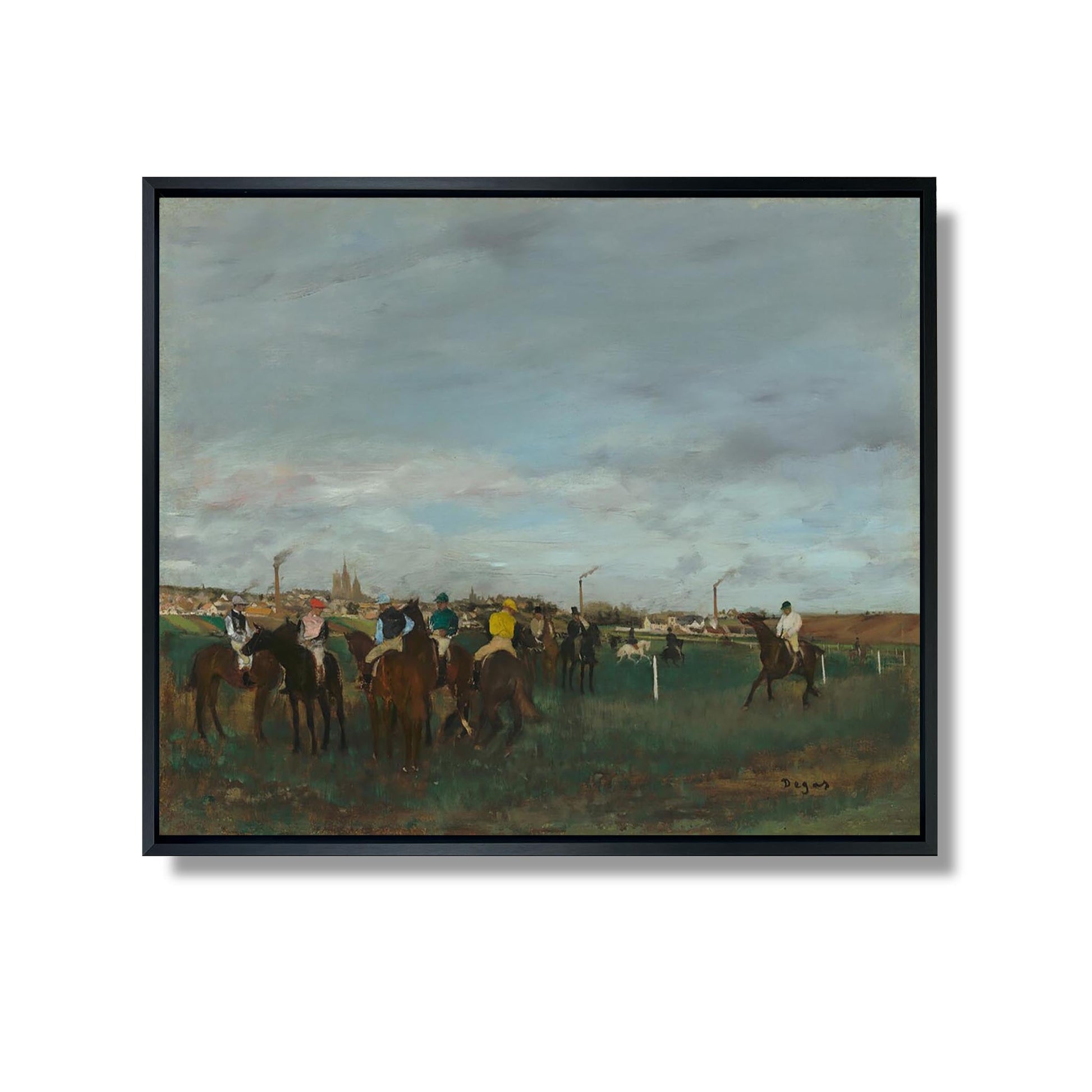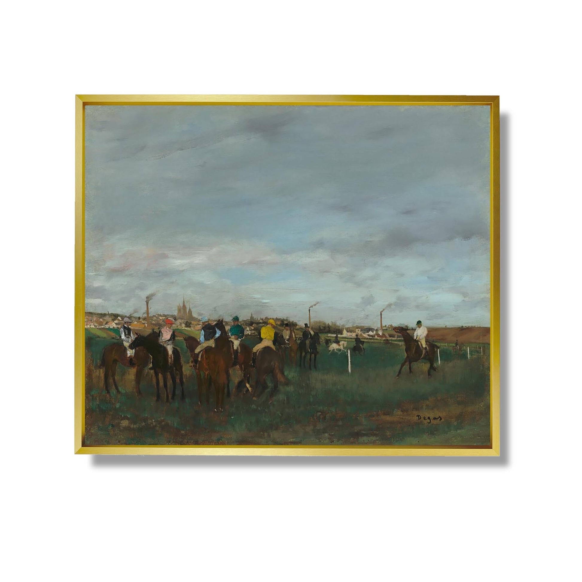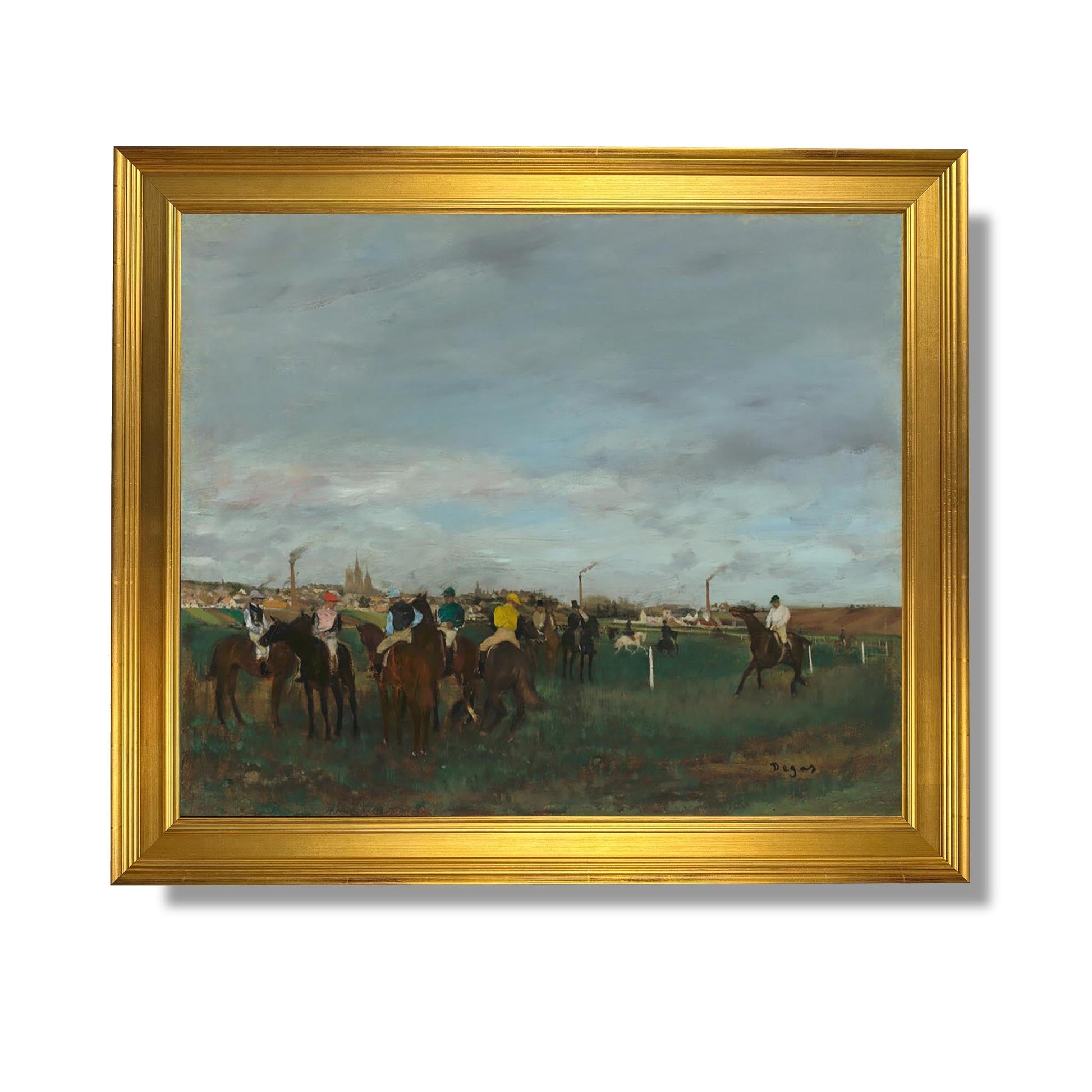 "Les Courses" d'Edgar Degas, peint en 1866, illustre la passion du peintre pour les courses de chevaux, un sujet qu'il a exploré à plusieurs reprises. Cette œuvre capture l'énergie et le mouvement des chevaux et de leurs jockeys, tout en mettant en avant l'atmosphère vibrante des courses. Degas utilise des angles de vue audacieux et des couleurs vives pour créer une dynamique visuelle saisissante. Les détails minutieux des chevaux et des spectateurs témoignent de son observation attentive de la vie moderne. Ce tableau incarne l'impressionnisme, alliant technique raffinée et émotion palpable.