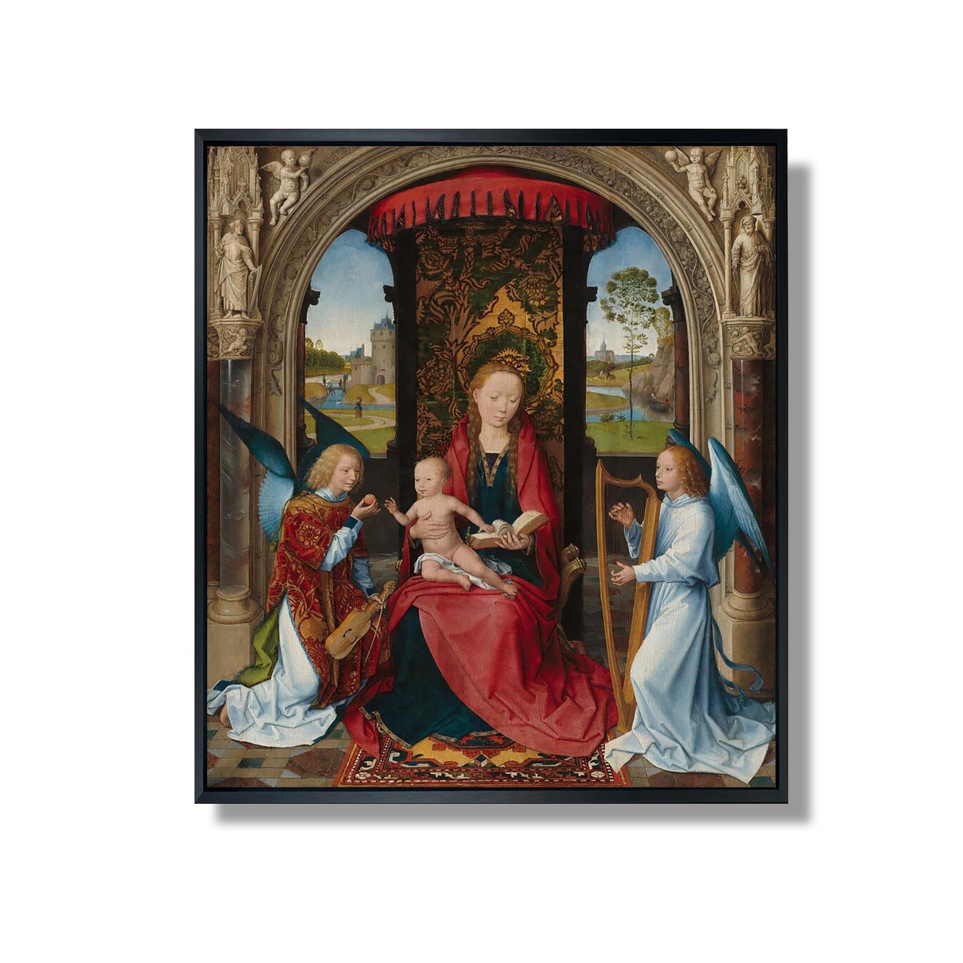 "Madonna and Child with Angels" est une œuvre emblématique de Hans Memling, un maître de la peinture flamande du XVe siècle. Réalisée vers 1480, cette huile sur panneau illustre la Vierge Marie tenant l'Enfant Jésus, entourée d'anges. La composition harmonieuse et l'utilisation subtile de la couleur témoignent du style raffiné de Memling. Les visages expressifs des personnages, empreints de sérénité, reflètent une profonde spiritualité. L'œuvre, riche en détails, invite à la contemplation et incarne la dévotion religieuse de l'époque, tout en mettant en avant la virtuosité technique de l'artiste.