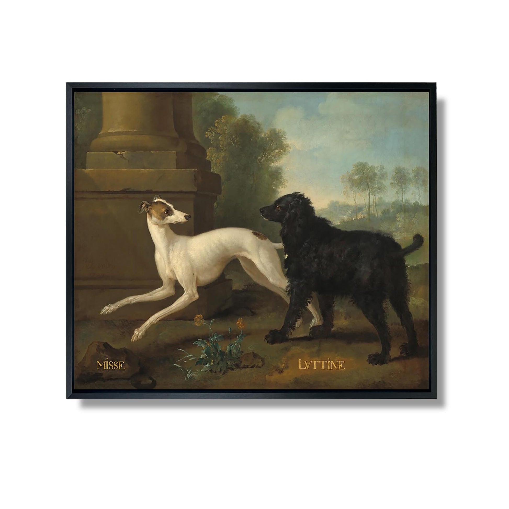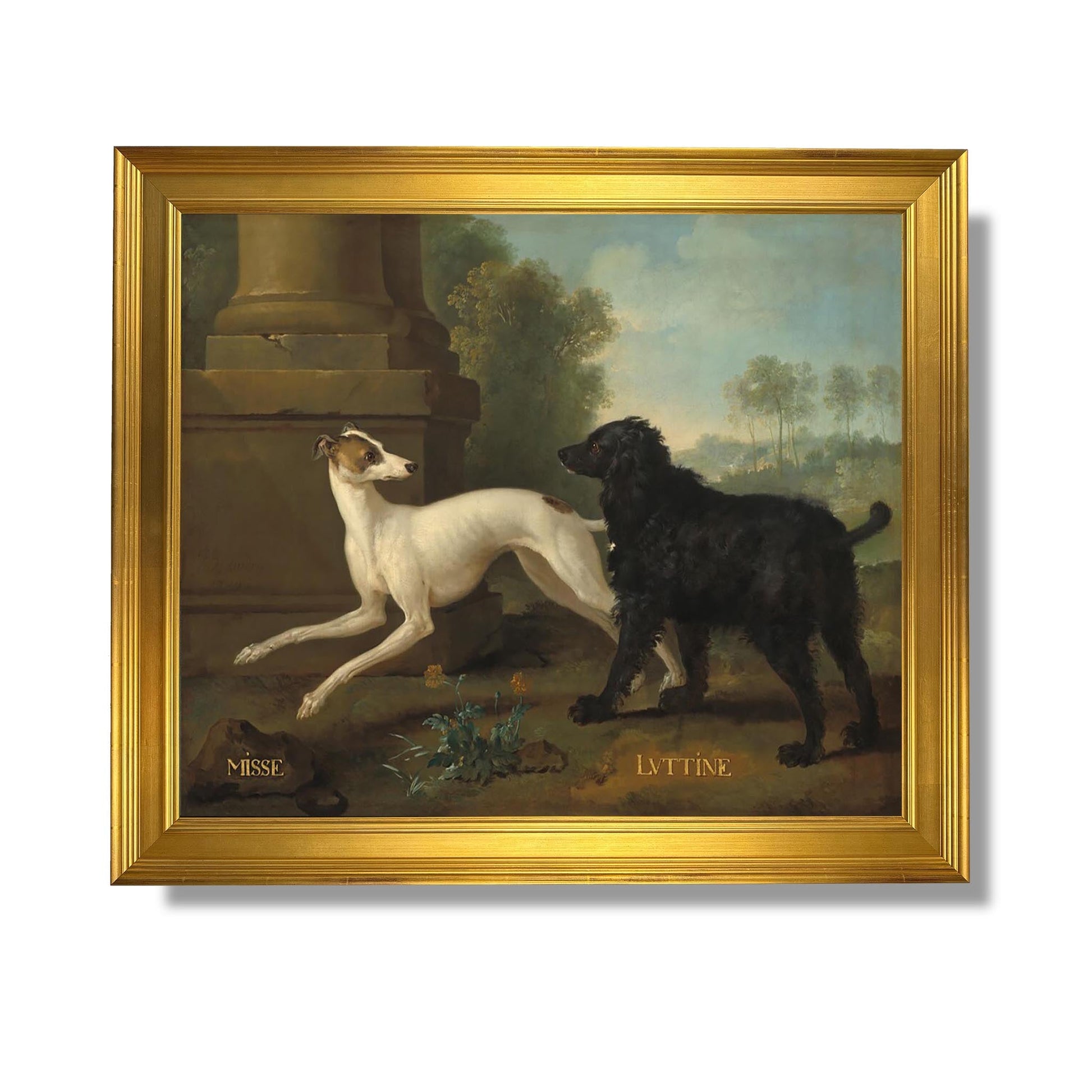 "Misse and Luttine" est une œuvre emblématique de Jean-Baptiste Oudry, un maître français du XVIIIe siècle, célèbre pour ses natures mortes et ses représentations animalières. Réalisée en 1737, cette peinture met en scène deux chiens de chasse, Misse et Luttine, dans un cadre bucolique. Oudry capture avec une précision remarquable les textures du pelage et les expressions des animaux, témoignant de son talent pour l'observation. L'œuvre illustre non seulement l'affection de l'artiste pour la faune, mais aussi son habileté à allier réalisme et esthétique, faisant de cette pièce un chef-d'œuvre du genre.