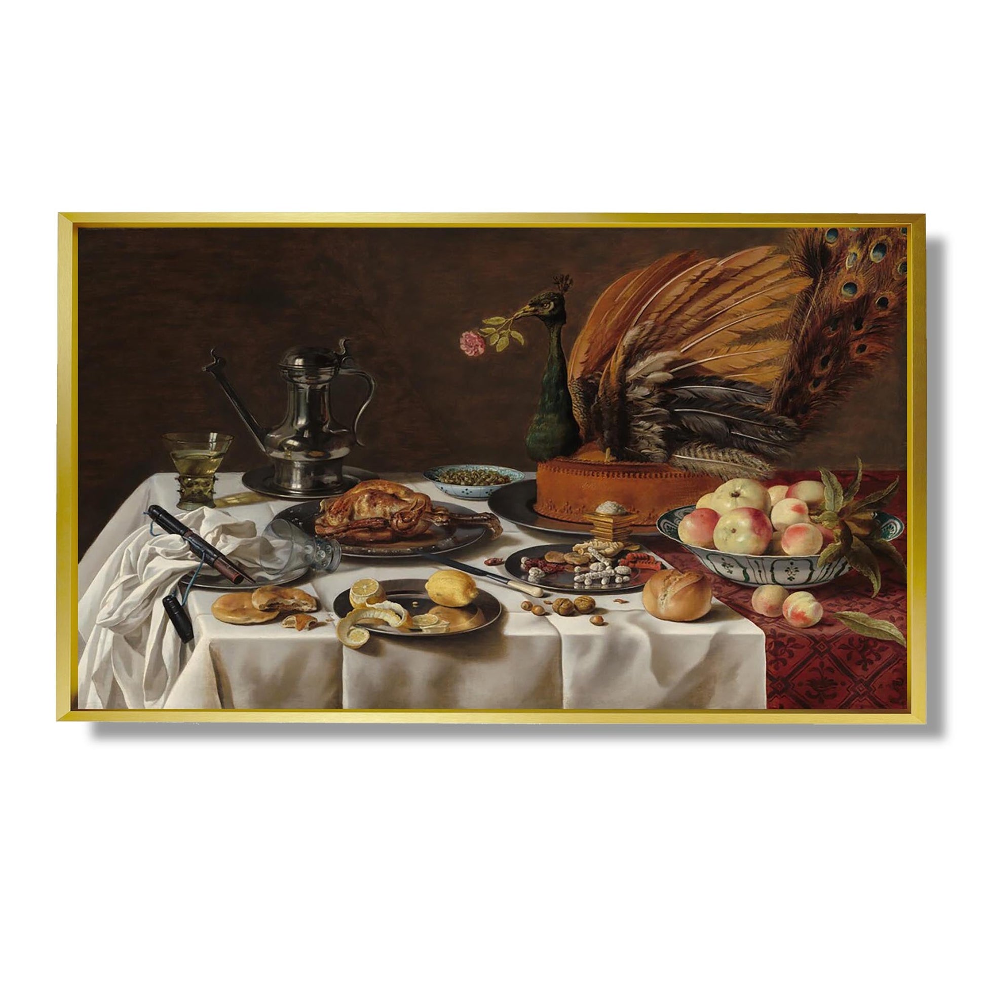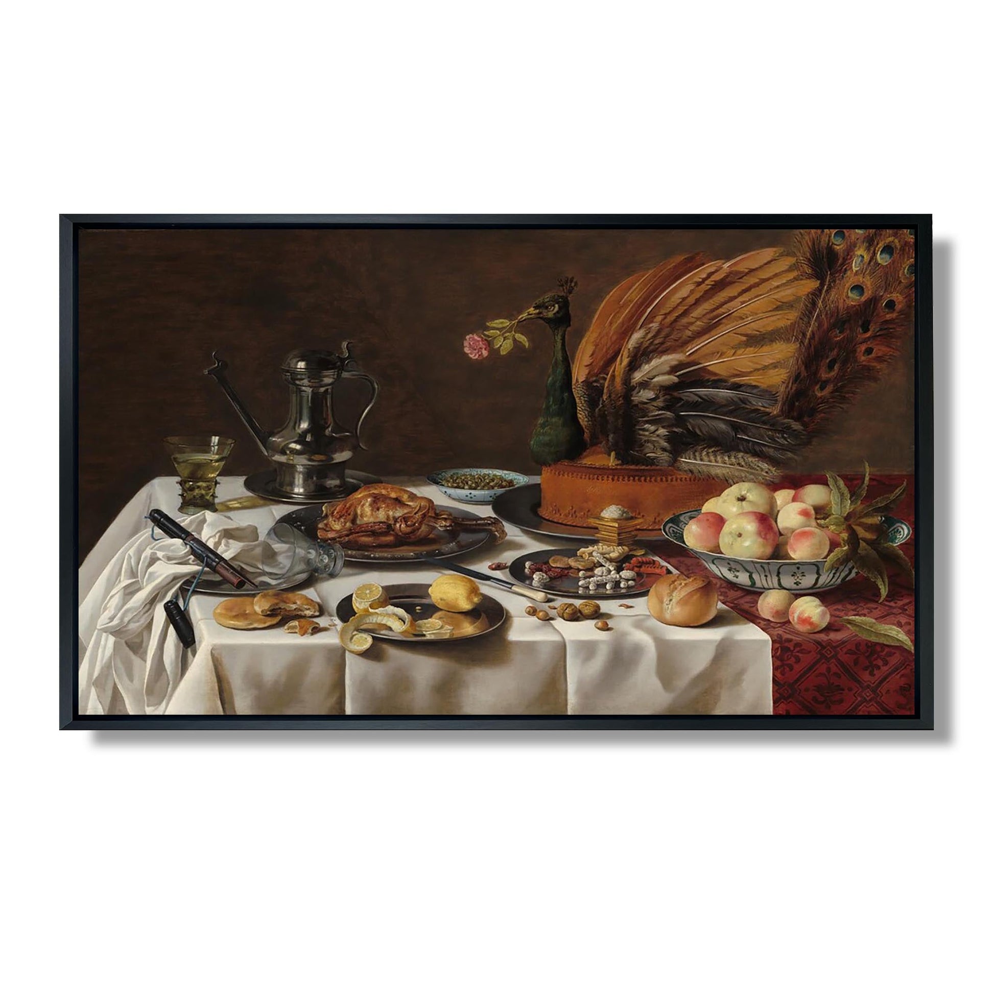 "Nature morte avec une tarte au paon" de Pieter Claesz est une œuvre emblématique du XVIIe siècle, illustrant la maîtrise du peintre néerlandais dans le genre de la nature morte. Cette composition riche et détaillée met en avant une tarte ornée d'un paon, symbole de richesse et de raffinement. Les éléments disposés avec soin, tels que des fruits, des verres et des ustensiles, témoignent de l'habileté de Claesz à jouer avec la lumière et les textures. À travers cette œuvre, l'artiste explore des thèmes de la vanité et de la transience de la vie, tout en célébrant la beauté éphémère des plaisirs matériels.