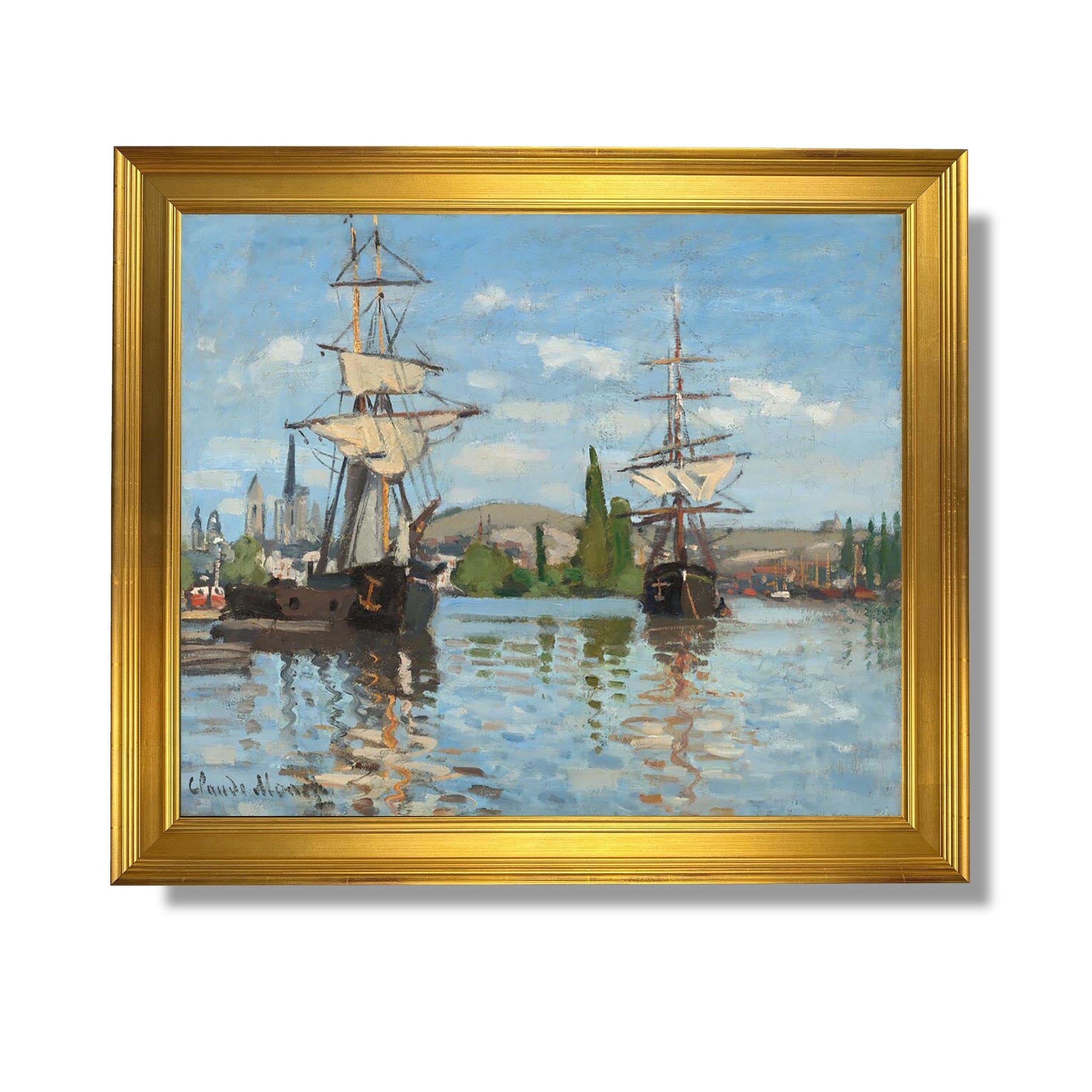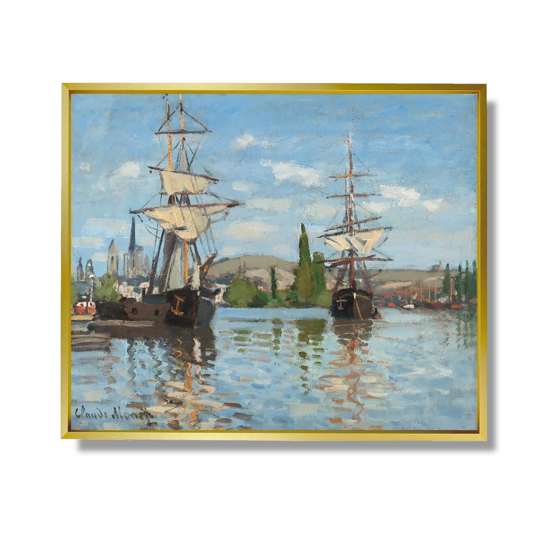 "Navires naviguant sur la Seine à Rouen" est une œuvre emblématique de Claude Monet, peinte en 1872. Ce tableau illustre la fascination de l'artiste pour la lumière et l'eau, caractéristiques du mouvement impressionniste. Monet capture une scène animée du port de Rouen, où des bateaux à voile et à vapeur se mêlent aux reflets chatoyants de la Seine. Les coups de pinceau rapides et la palette de couleurs vibrantes transmettent une atmosphère vivante et dynamique. Cette œuvre témoigne de l'importance de la nature et de l'industrialisation dans l'art de Monet, tout en célébrant la beauté éphémère des paysages urbains.