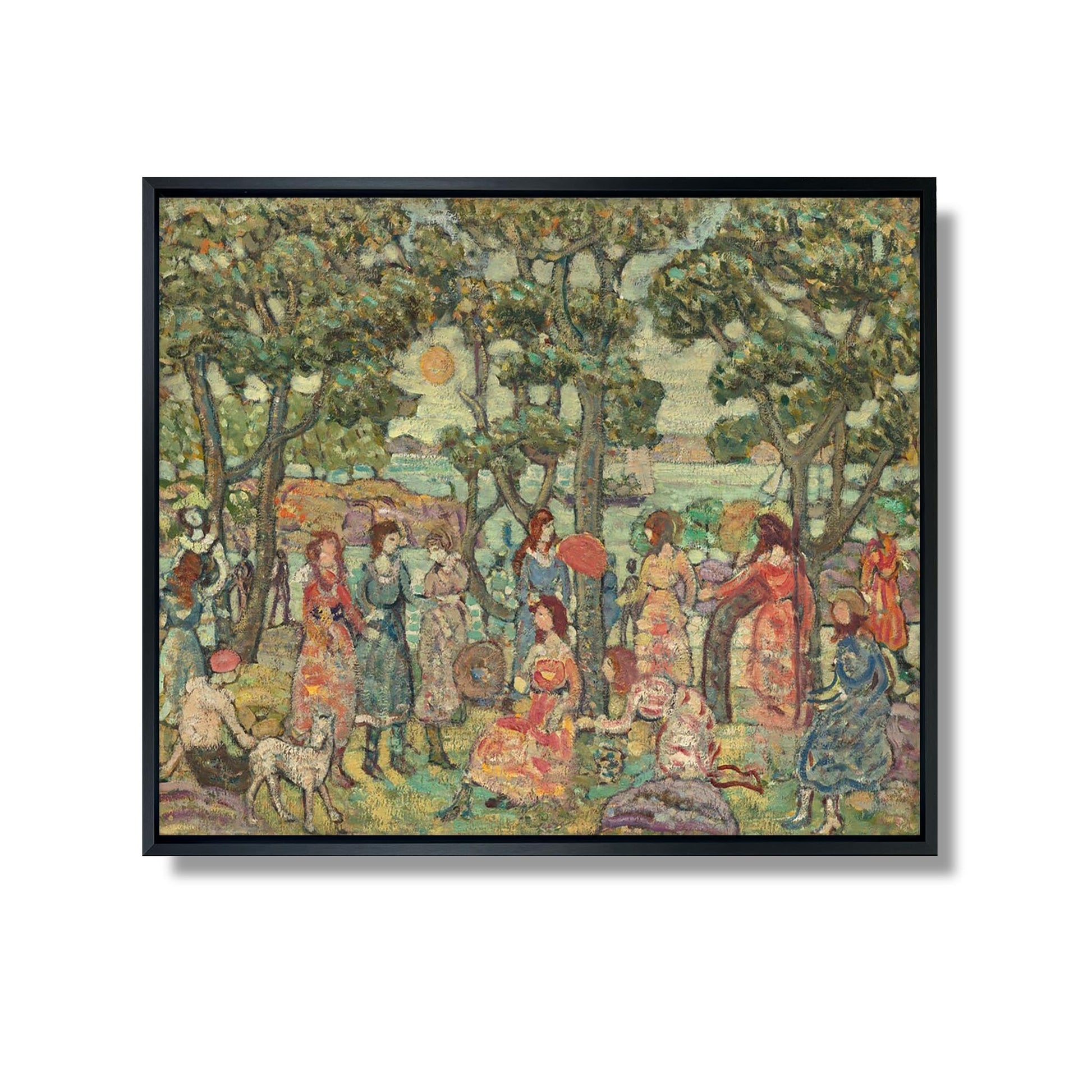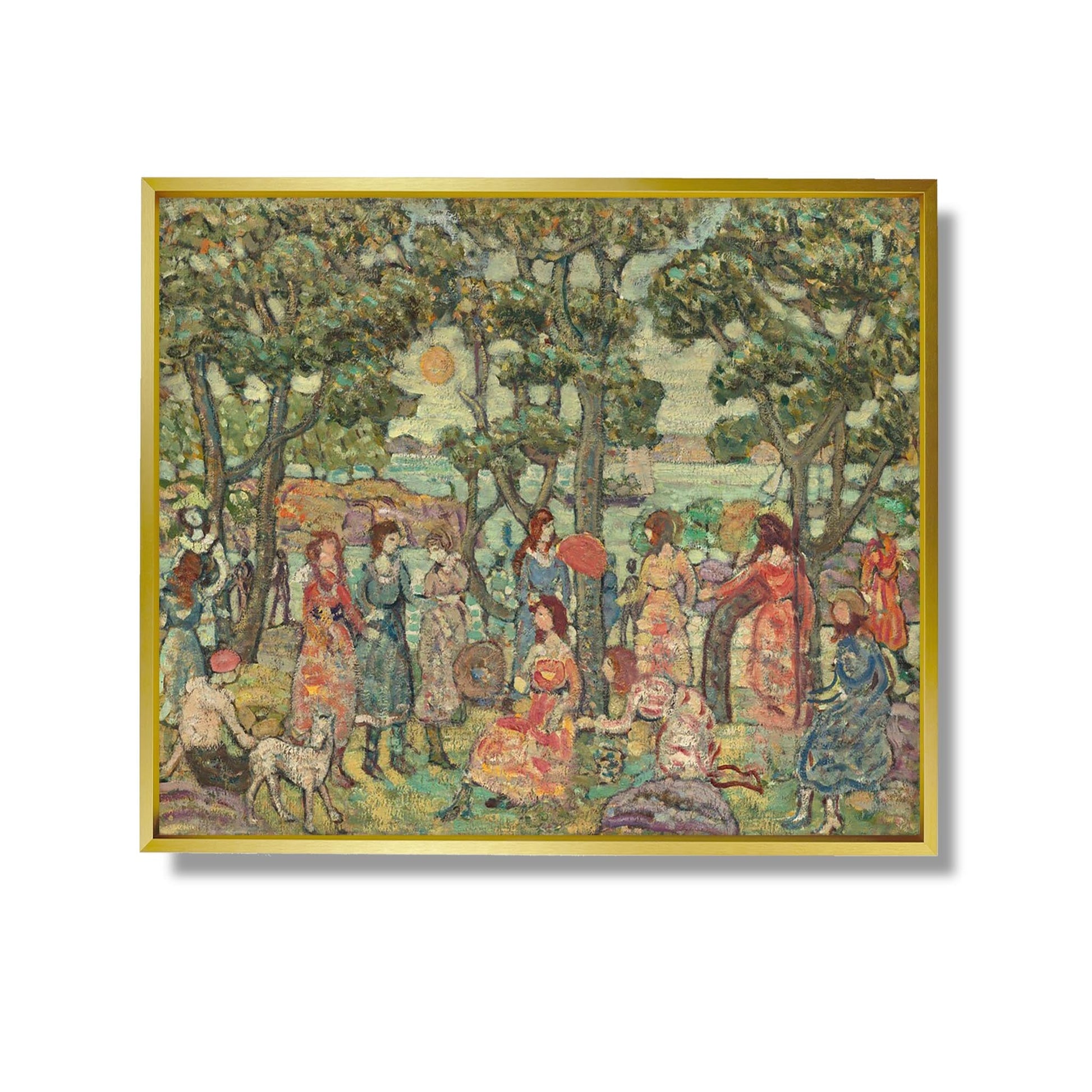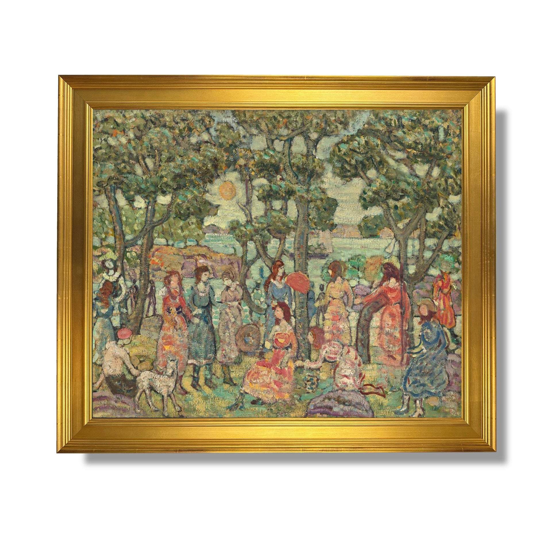 "Paysage avec personnages" de Maurice Prendergast est une œuvre emblématique du mouvement post-impressionniste, réalisée au début du XXe siècle. Ce tableau vibrant capture une scène de plein air, où des figures humaines évoluent dans un paysage coloré et enjoué. Prendergast utilise des touches de couleur audacieuses et des formes stylisées pour créer une atmosphère joyeuse et dynamique. Les personnages, souvent représentés en train de se divertir, évoquent une sensation de légèreté et de bonheur. L'œuvre illustre l'intérêt de l'artiste pour la vie quotidienne et la beauté des moments simples, tout en intégrant une approche moderne et expressive.