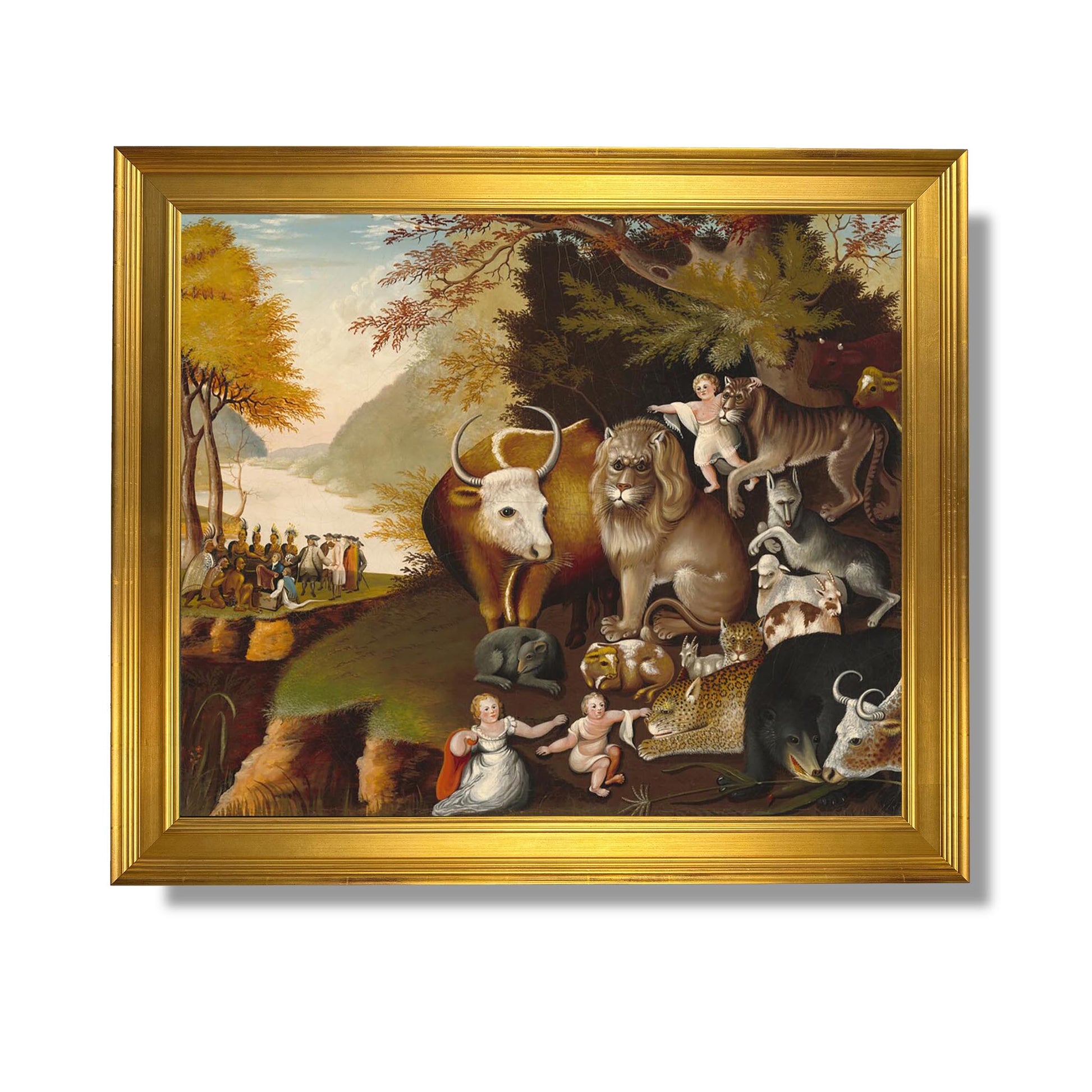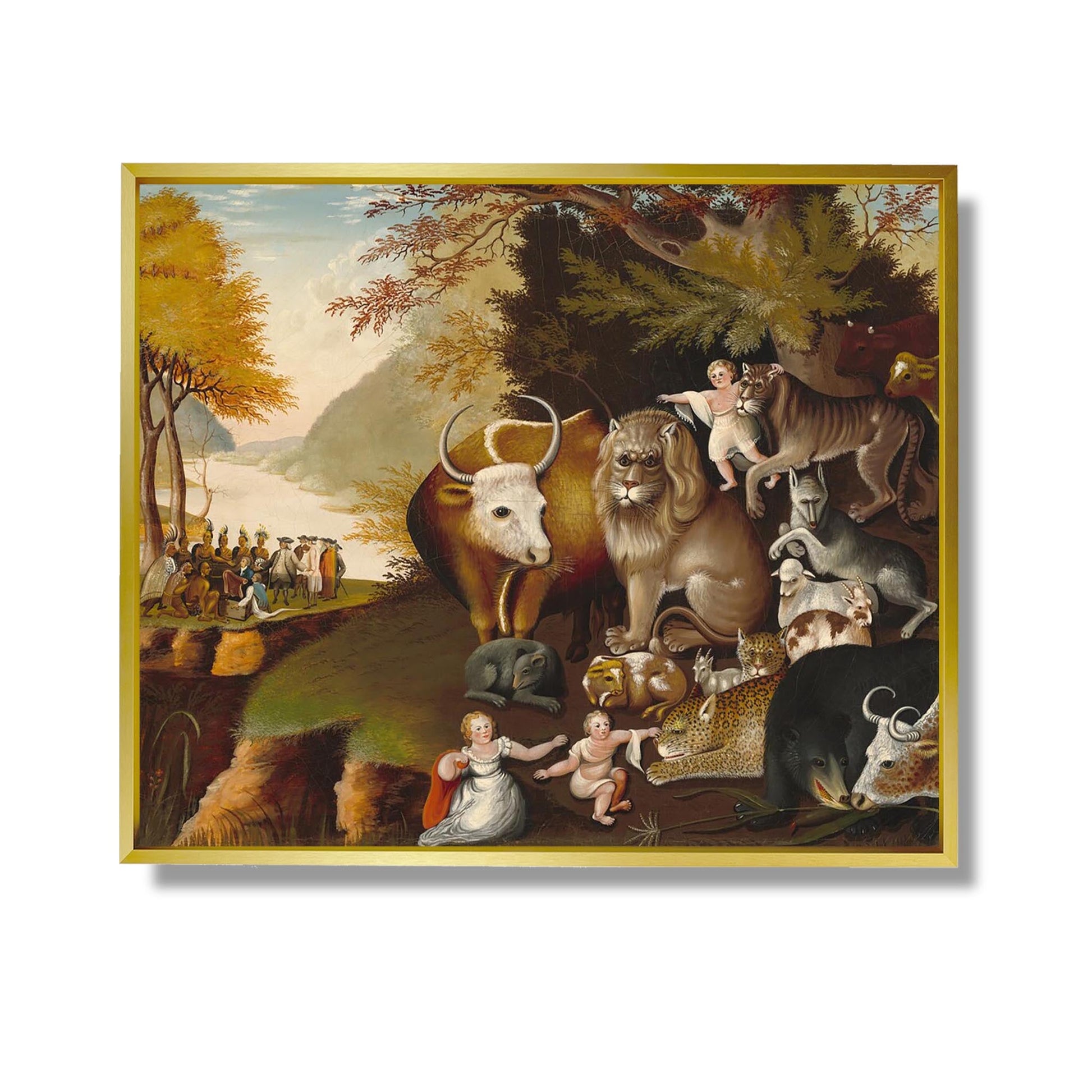 "Peaceable Kingdom" est une œuvre emblématique d'Edward Hicks, un artiste américain du XIXe siècle, connu pour ses peintures naïves et spirituelles. Réalisée vers 1834-1839, cette toile illustre une vision utopique de la paix et de l'harmonie entre les êtres humains et les animaux. Inspirée par des passages bibliques, elle représente un monde où le lion et l'agneau cohabitent paisiblement, symbolisant l'espoir d'une réconciliation universelle. À travers des couleurs douces et une composition équilibrée, Hicks transmet un message de tolérance et de sérénité, invitant le spectateur à réfléchir sur la coexistence pacifique.
