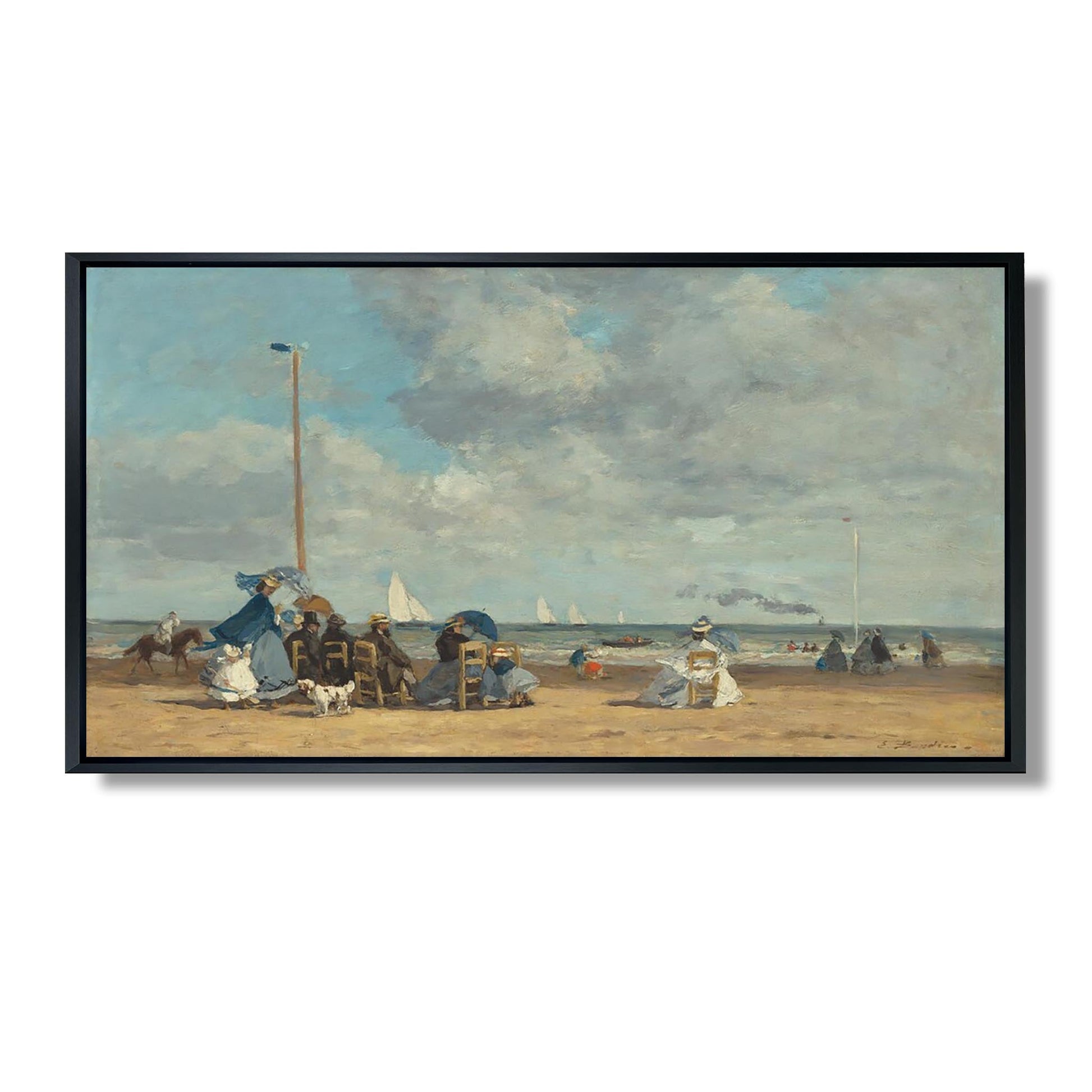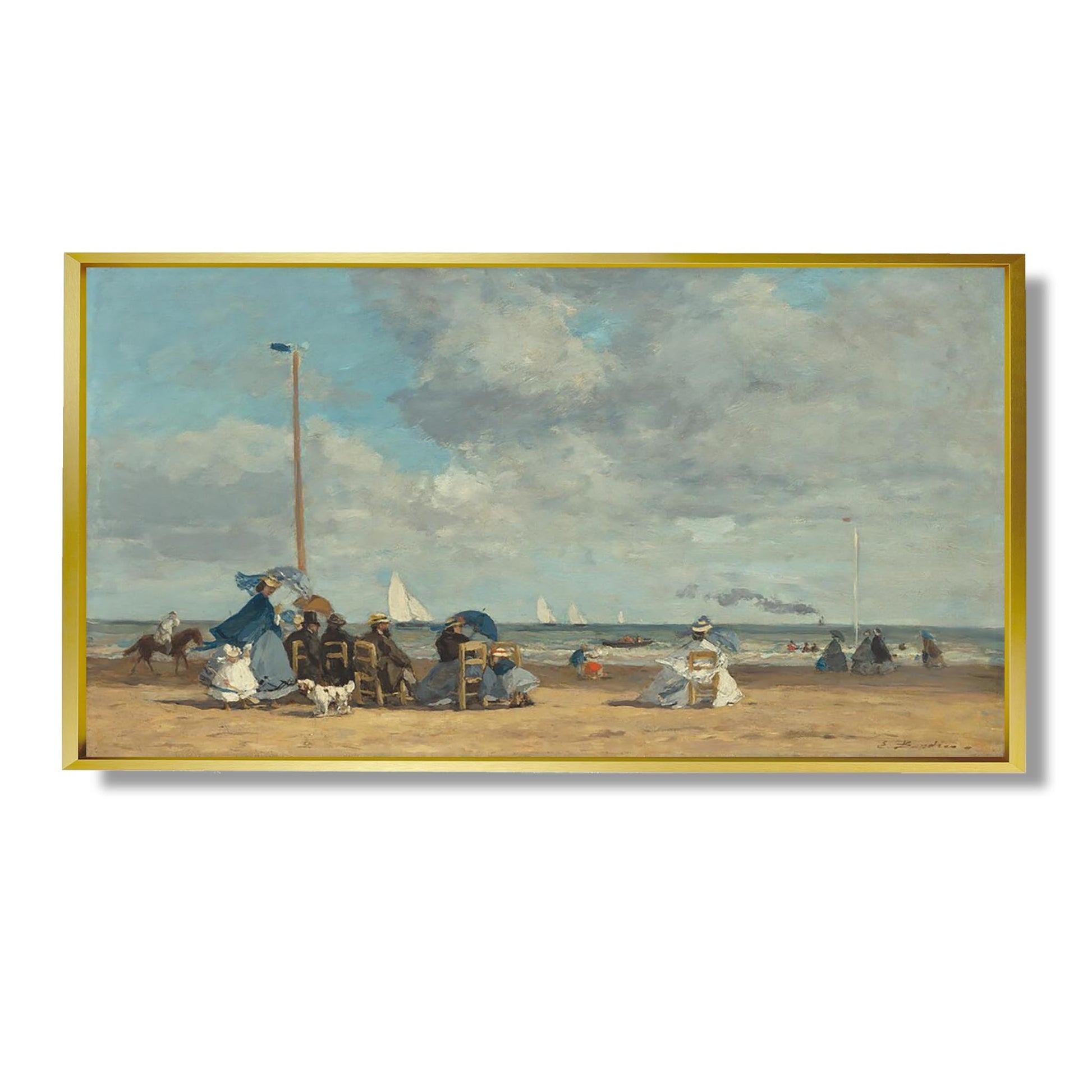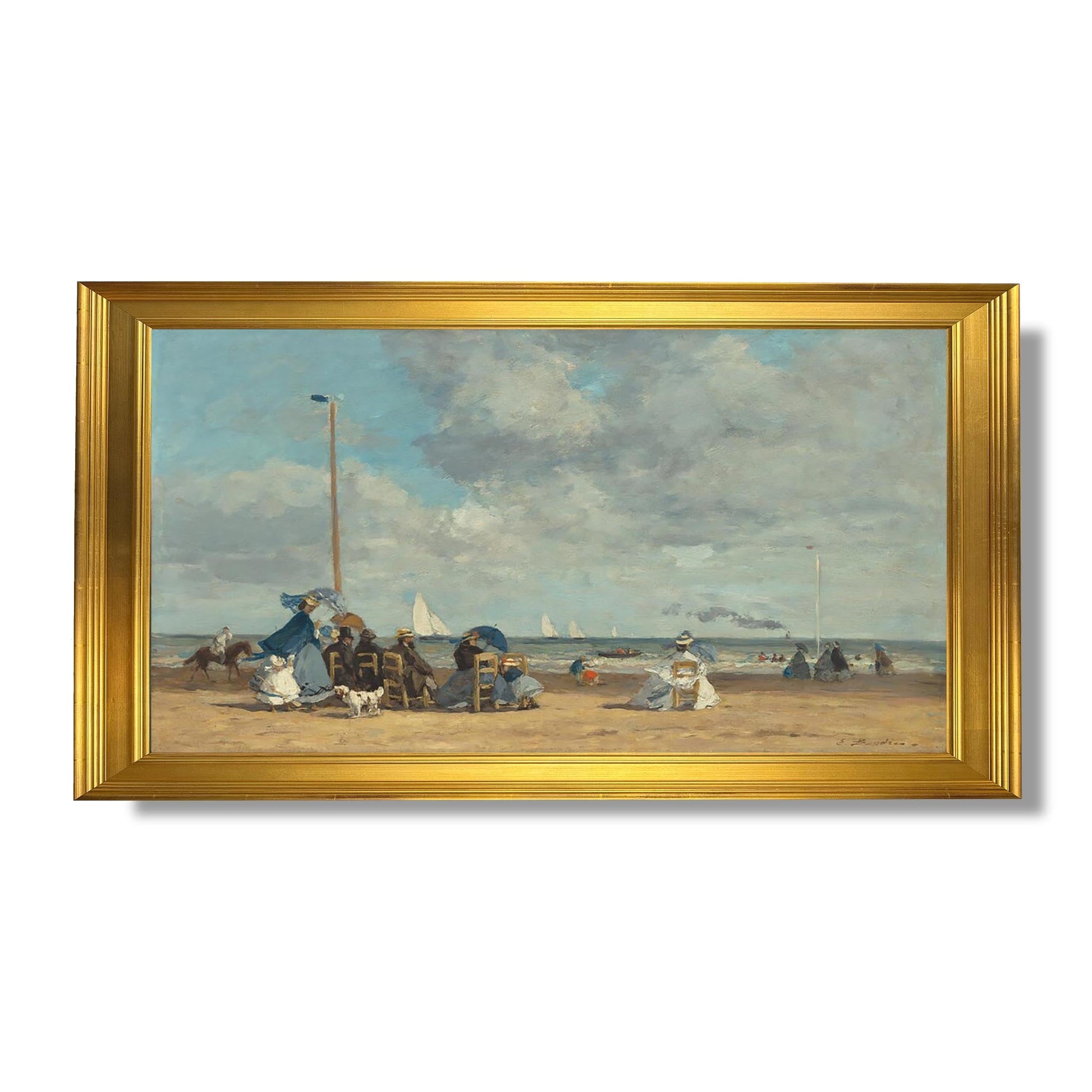 "Plage à Trouville" est une œuvre emblématique d'Eugène Boudin, un pionnier de l'impressionnisme. Peinte en 1865, cette toile capture l'effervescence d'une journée d'été sur la côte normande. Boudin, connu pour sa maîtrise de la lumière et des ciels, dépeint des baigneurs et des promeneurs sur le sable, entourés de voiles colorées. Les coups de pinceau rapides et la palette lumineuse évoquent une atmosphère vivante et joyeuse. Cette œuvre illustre l'amour de Boudin pour la nature et son talent à immortaliser des moments fugaces, préfigurant les innovations des artistes impressionnistes qui suivront.