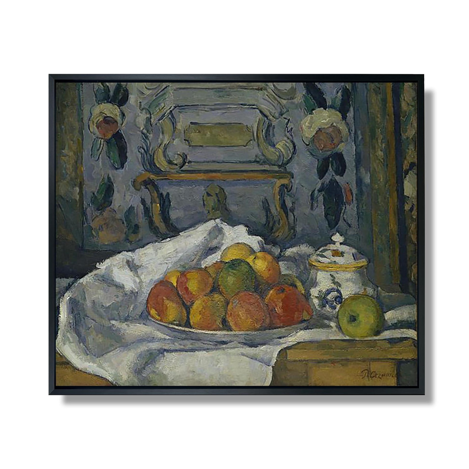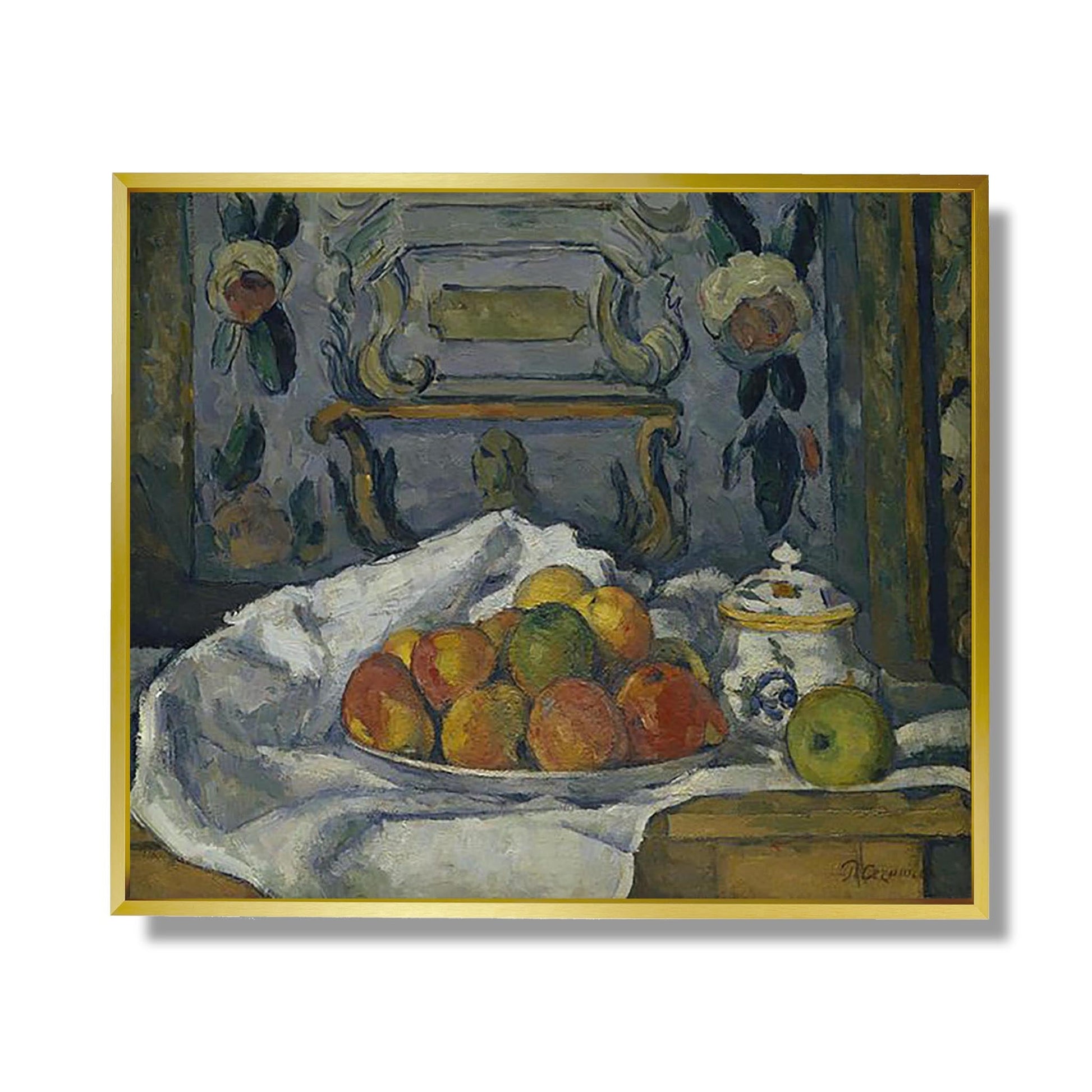 "Plat de Pommes" est une œuvre emblématique de Paul Cézanne, réalisée entre 1890 et 1894. Ce tableau illustre la maîtrise de l'artiste dans la représentation des natures mortes, où il réinvente la perception des objets. Les pommes, disposées sur une table, sont rendues avec des touches de couleur vibrantes et des formes géométriques, témoignant de son approche analytique. Cézanne joue avec la lumière et l'ombre, créant une profondeur qui transcende la simple représentation. Cette œuvre préfigure le cubisme et souligne l'importance de la structure dans l'art moderne, marquant une étape cruciale dans l'évolution de la peinture.