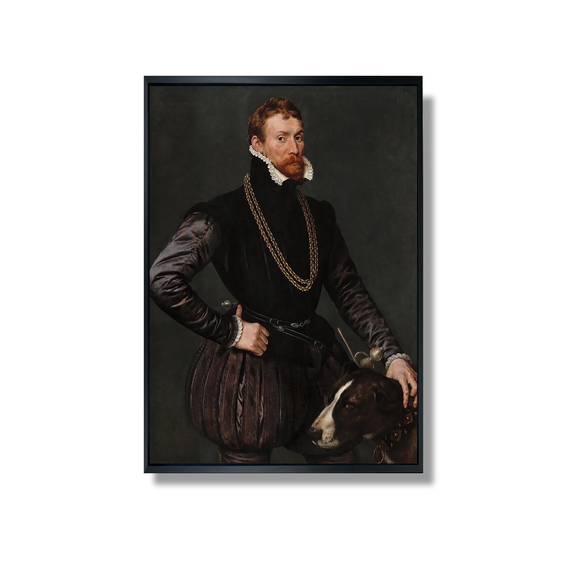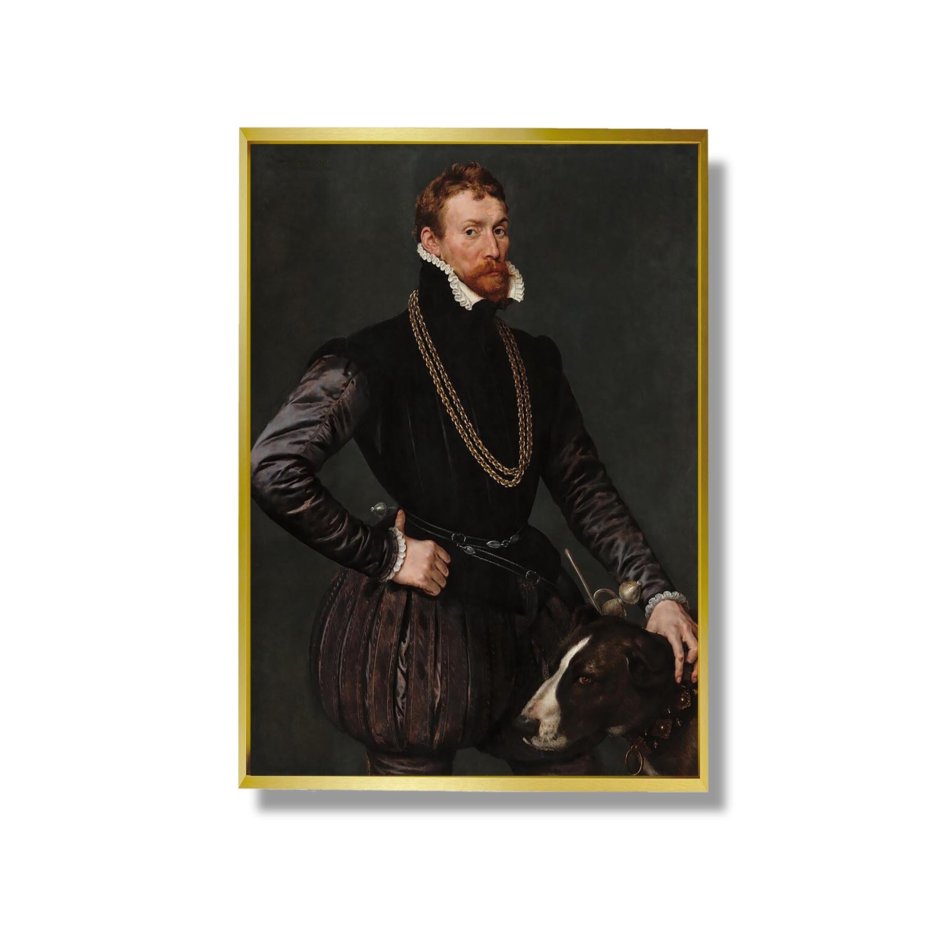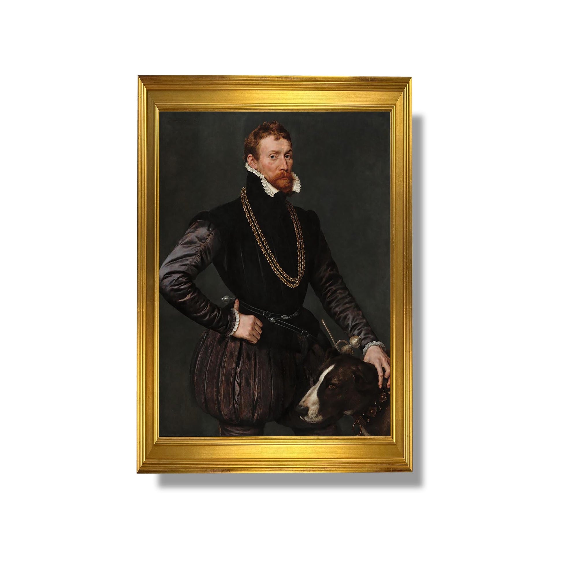 "Portrait of a Gentleman" d'Antonis Mor est une œuvre emblématique de la Renaissance, réalisée vers 1560. Ce tableau représente un homme d'une grande dignité, vêtu d'un costume richement orné, qui témoigne de son statut social élevé. Mor, maître du portrait, utilise une palette de couleurs sombres et des jeux de lumière subtils pour accentuer les traits du visage et la texture des vêtements. L'expression du gentleman, à la fois sérieuse et introspective, invite le spectateur à s'interroger sur son identité et son histoire. Cette œuvre illustre parfaitement le talent de Mor pour capturer la psychologie humaine à travers le portrait.