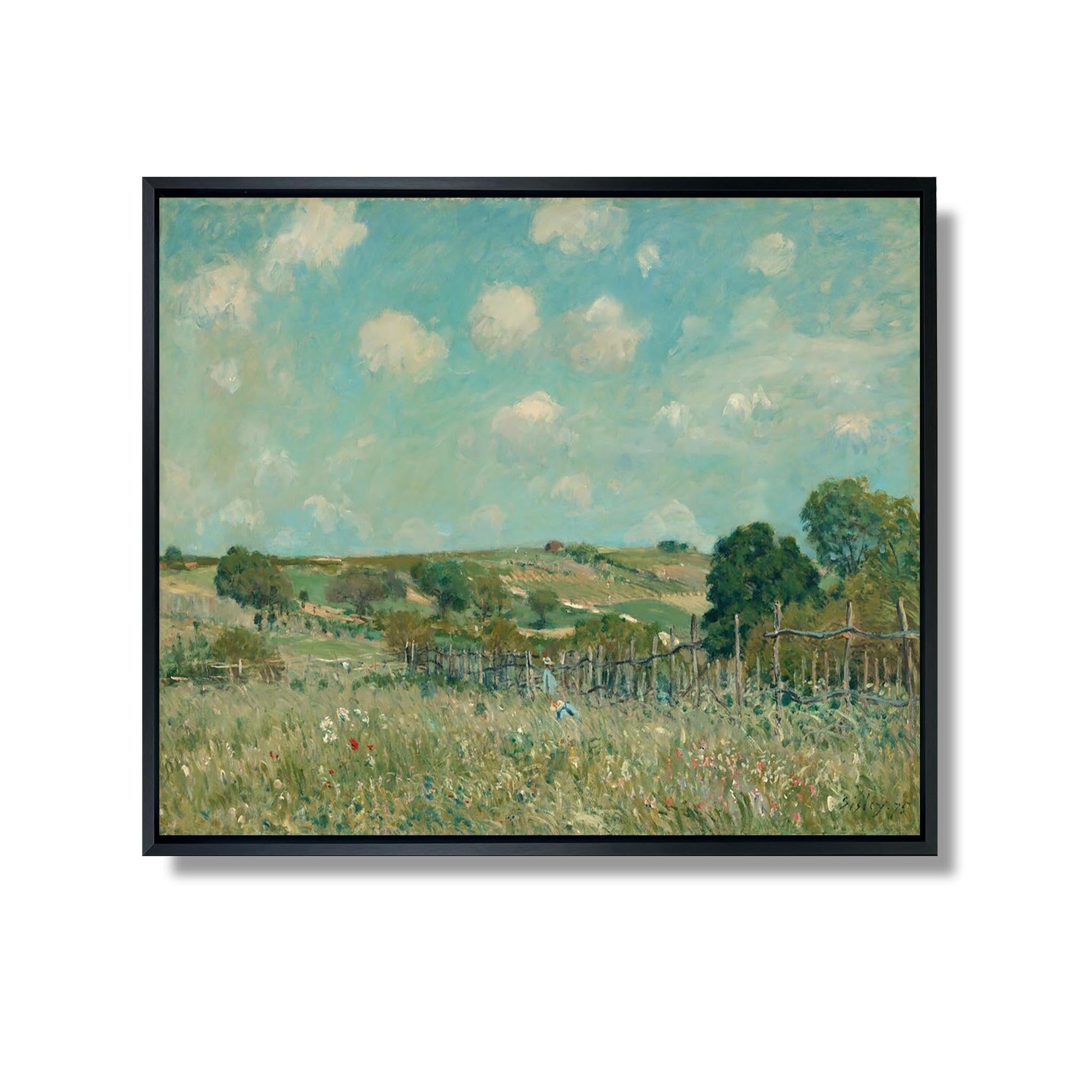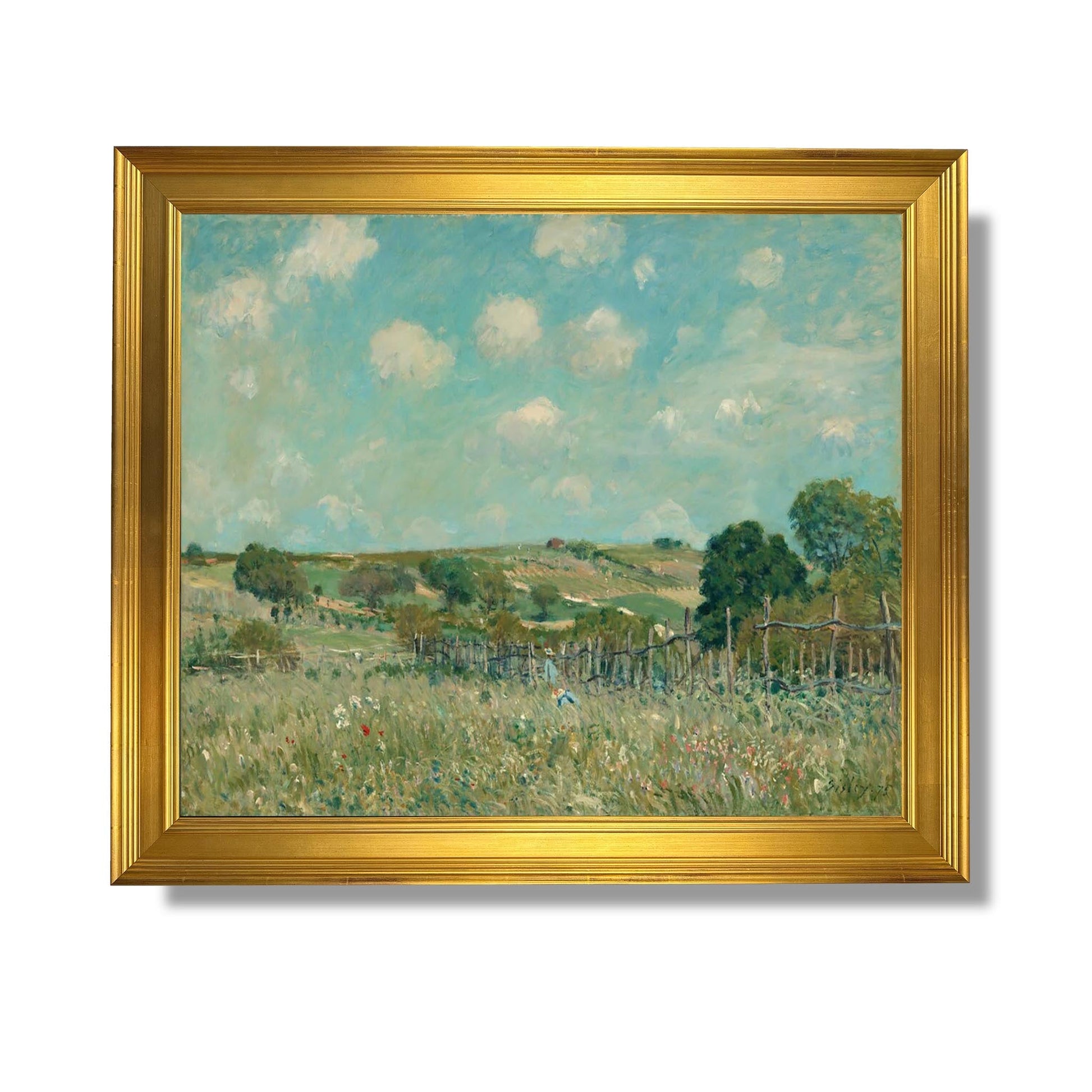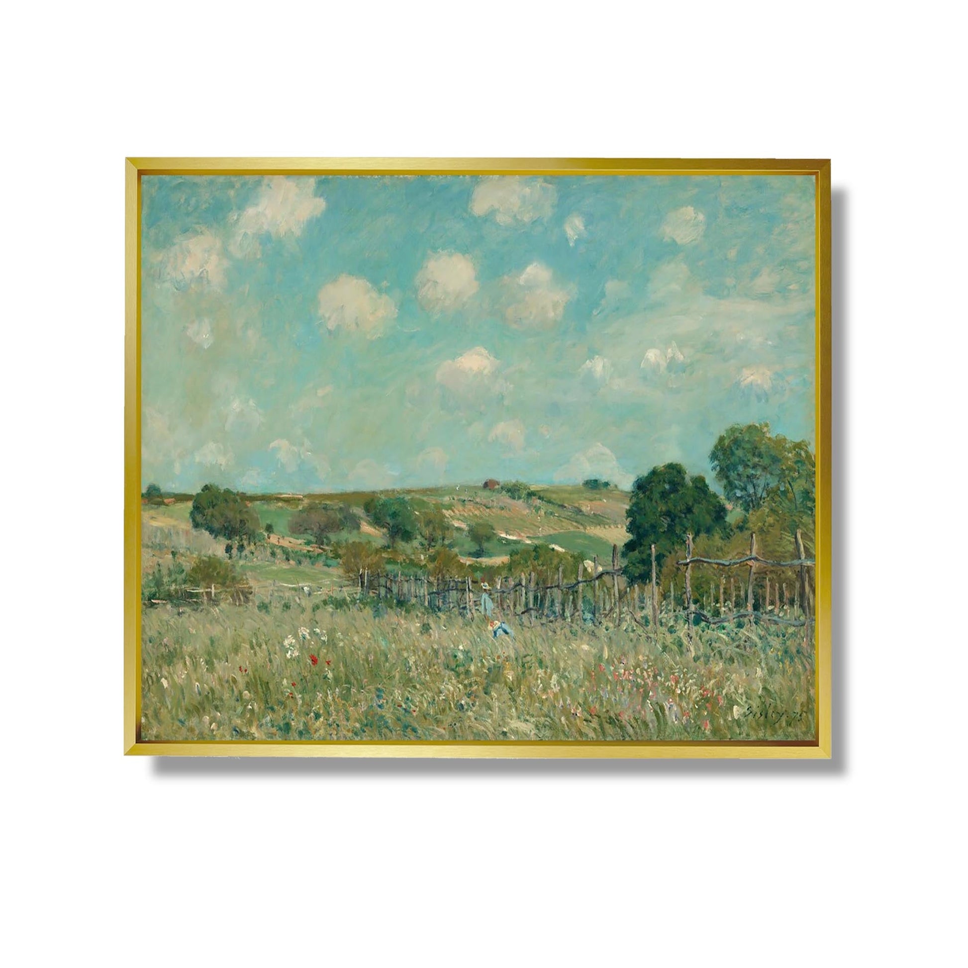 "Prairie" d'Alfred Sisley, peint en 1875, est une œuvre emblématique du mouvement impressionniste. Ce tableau représente un paysage bucolique, où la lumière naturelle joue un rôle central. Sisley, connu pour sa maîtrise des nuances de couleur et de la lumière, capture la beauté d'une prairie verdoyante, parsemée de fleurs sauvages. Les touches de pinceau délicates et les reflets du ciel sur le sol témoignent de son attention aux détails. L'œuvre évoque une atmosphère paisible et sereine, invitant le spectateur à apprécier la simplicité et l'harmonie de la nature, caractéristiques chères à l'artiste.