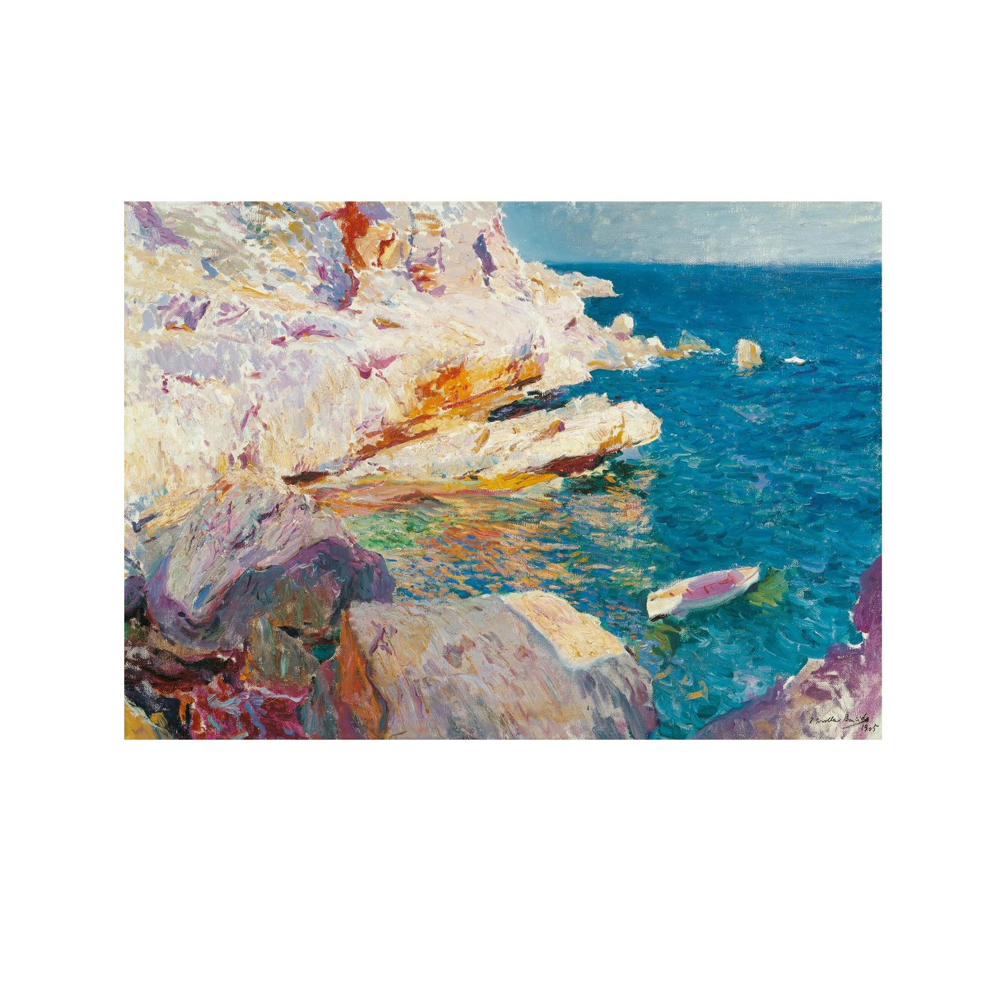 "Rocks at Jávea and the White Boat" est une œuvre emblématique de Joaquín Sorolla y Bastida, peinte en 1905. Ce tableau capture la beauté naturelle de la côte méditerranéenne, mettant en avant des rochers aux formes sculpturales baignés par des eaux turquoise. La lumière éclatante, caractéristique du style de Sorolla, illumine la scène, créant des reflets scintillants sur l'eau. Un petit bateau blanc, ancré paisiblement, ajoute une touche de vie à ce paysage serein. L'œuvre évoque une atmosphère de tranquillité et de chaleur, typique des rivages espagnols.