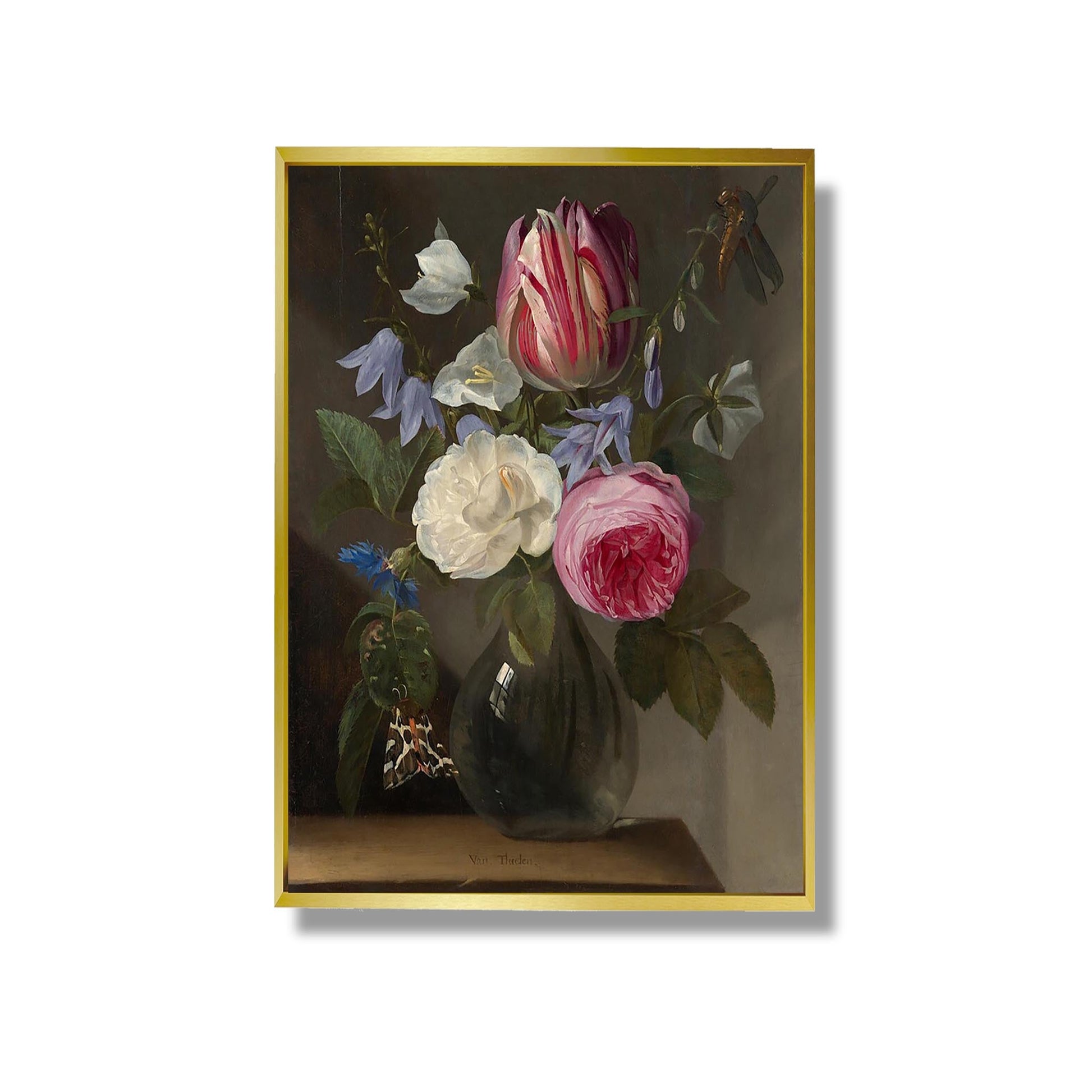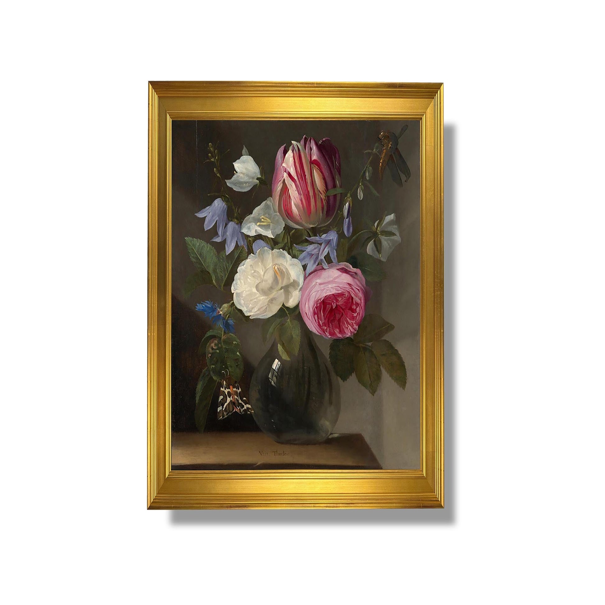"Roses and a Tulip in a Glass Vase" est une œuvre emblématique de Jan Philips van Thielen, un maître flamand du XVIIe siècle, reconnu pour ses natures mortes florales. Dans cette composition, van Thielen capture la beauté éphémère des fleurs avec une précision remarquable. Les roses, symboles d'amour et de beauté, se mêlent à une tulipe, représentant la richesse et l'exotisme. Le vase en verre, transparent et délicat, reflète la lumière, ajoutant une dimension de réalisme. Cette œuvre illustre non seulement le talent technique de l'artiste, mais aussi son habileté à évoquer des émotions à travers la nature.