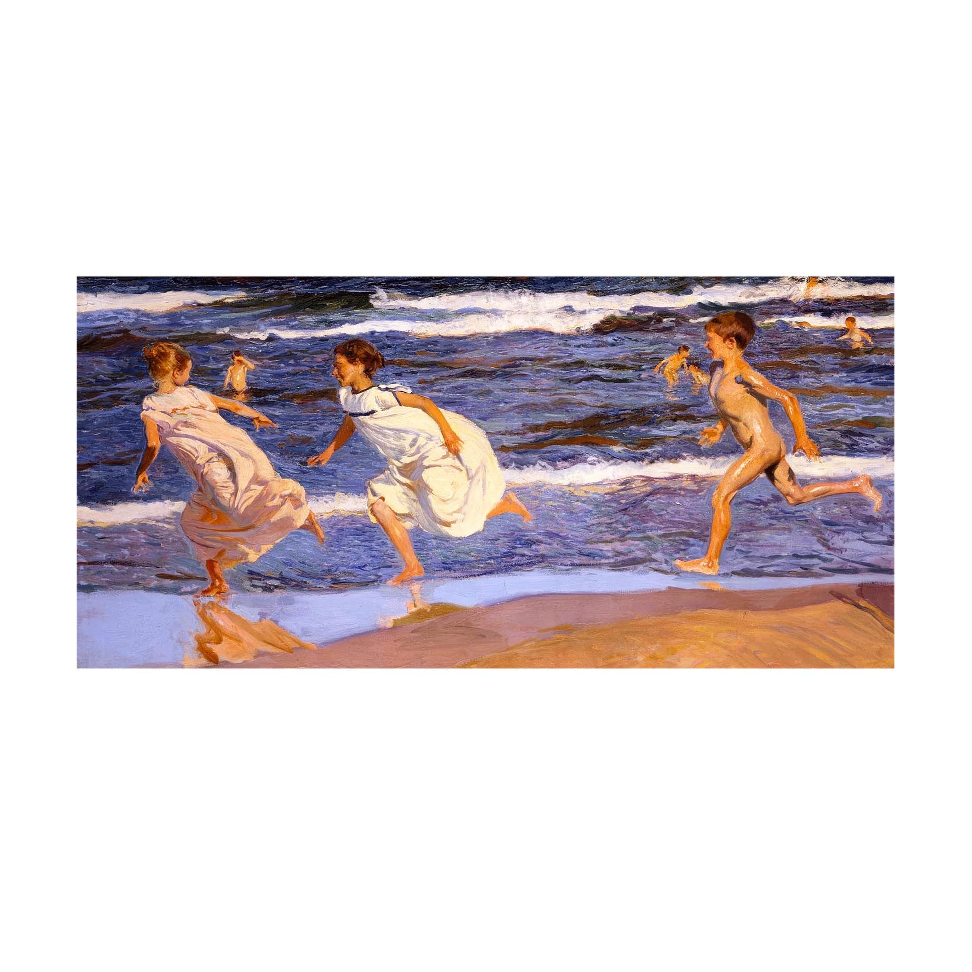 "Running along the Beach" de Joaquín Sorolla y Bastida est une œuvre vibrante qui capture l'énergie et la joie de l'enfance. Peinte en 1916, elle représente deux enfants courant sur une plage ensoleillée, leurs silhouettes se découpant sur un fond de mer azur et de ciel lumineux. La lumière joue un rôle central, illuminant les visages des enfants et créant des reflets scintillants sur l'eau. Sorolla, maître de la lumière, utilise des coups de pinceau rapides et fluides pour transmettre le mouvement et la vivacité de la scène, évoquant une sensation de liberté et de bonheur.