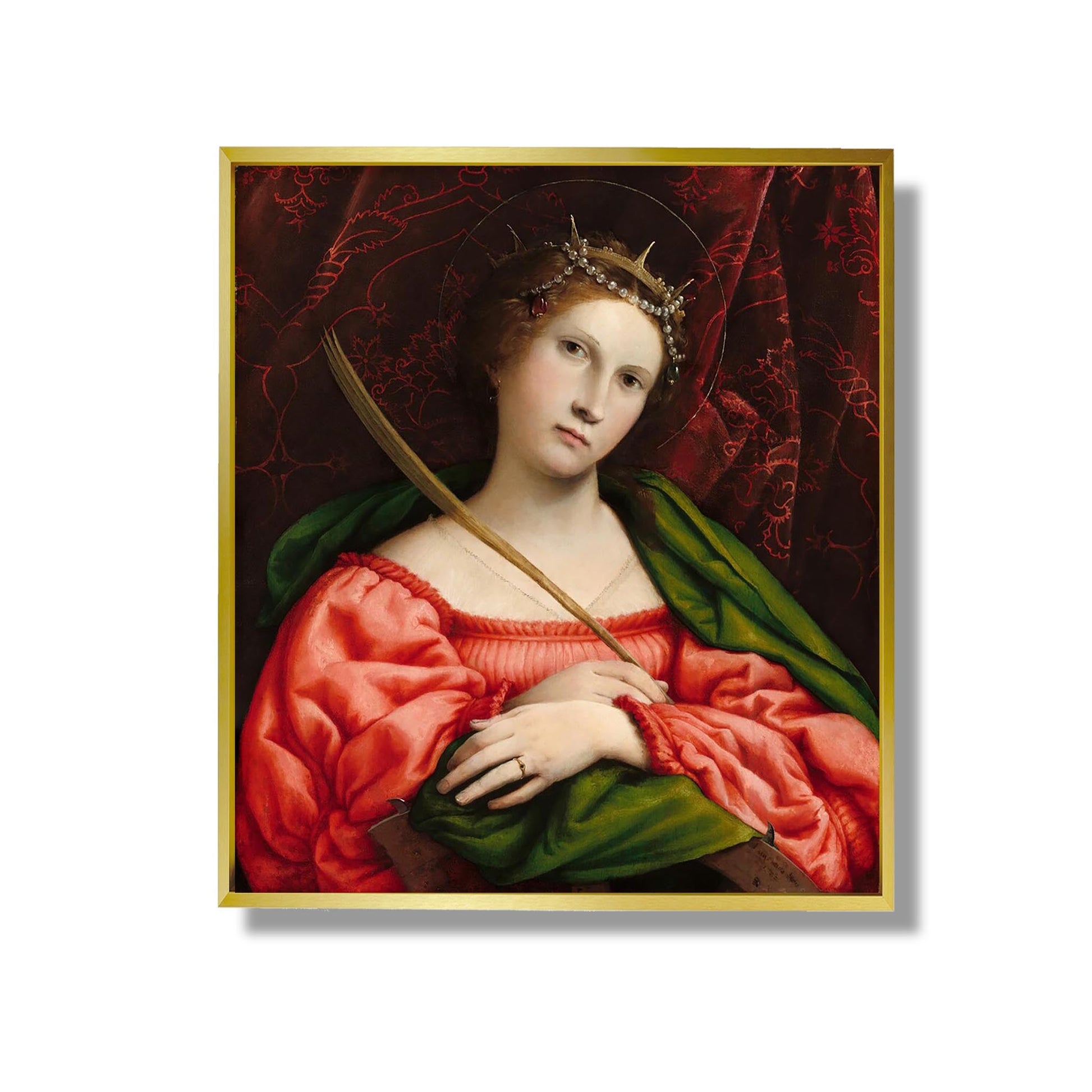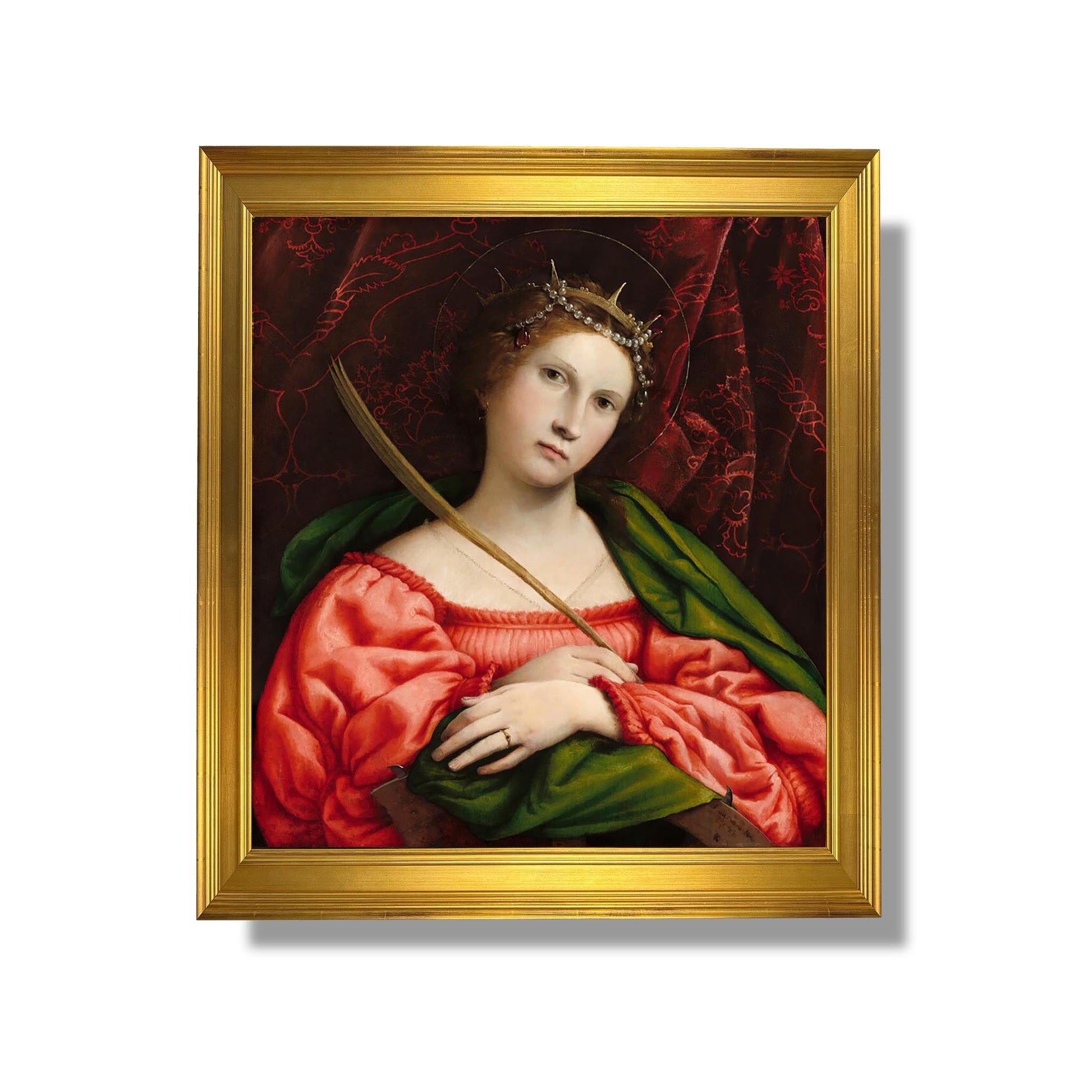L'œuvre "Saint Catherine" de Lorenzo Lotto, peinte vers 1510, illustre la profondeur spirituelle et la maîtrise technique de l'artiste. Cette toile représente Sainte Catherine d'Alexandrie, une figure emblématique du christianisme, souvent associée à la sagesse et à la foi. Lotto utilise une palette riche et des détails minutieux pour accentuer la beauté et la sérénité de la sainte. Le visage expressif de Catherine, entouré d'attributs symboliques comme la roue et le livre, évoque son martyre et son intellect. Cette œuvre témoigne de l'harmonie entre la spiritualité et l'humanité, caractéristique du style de Lotto.