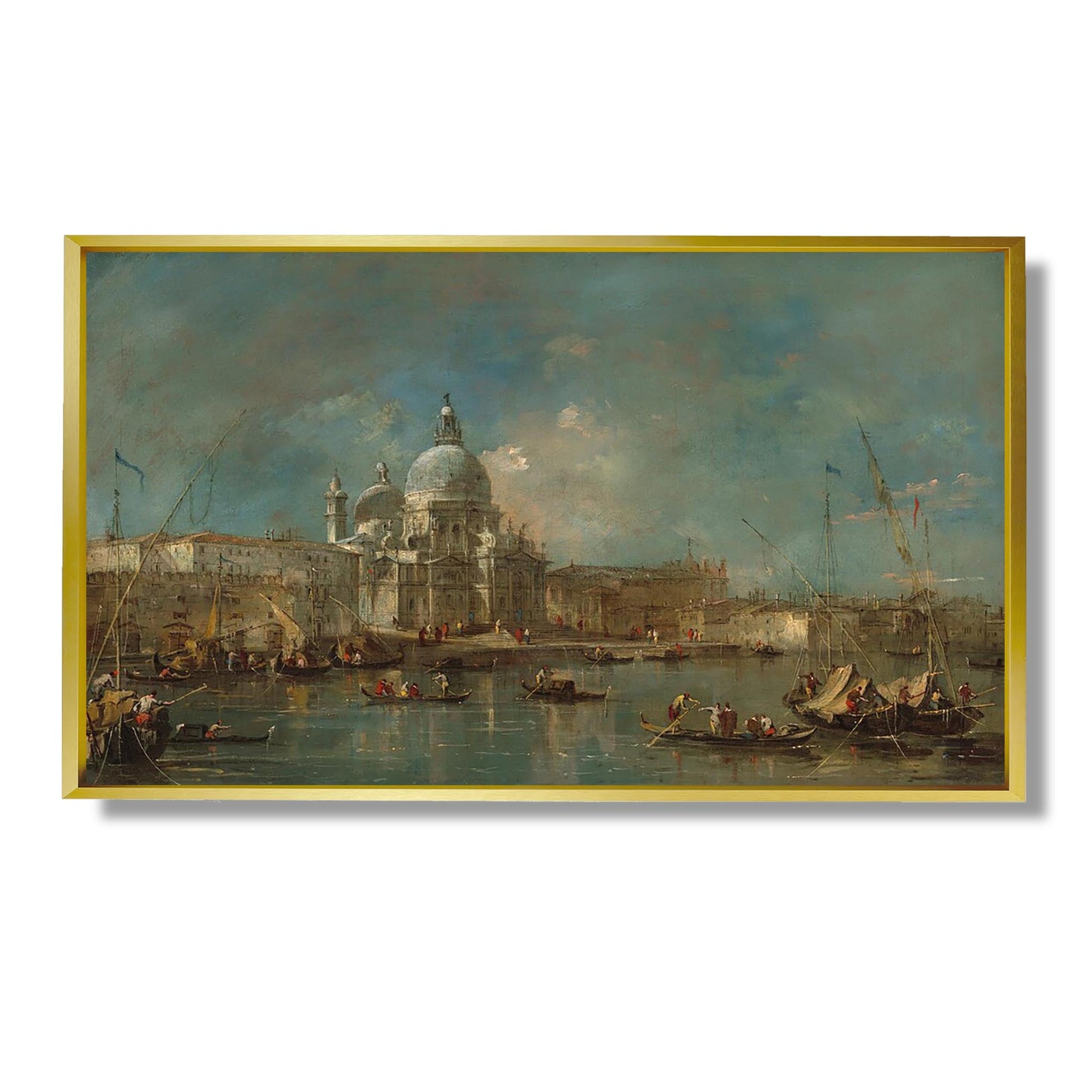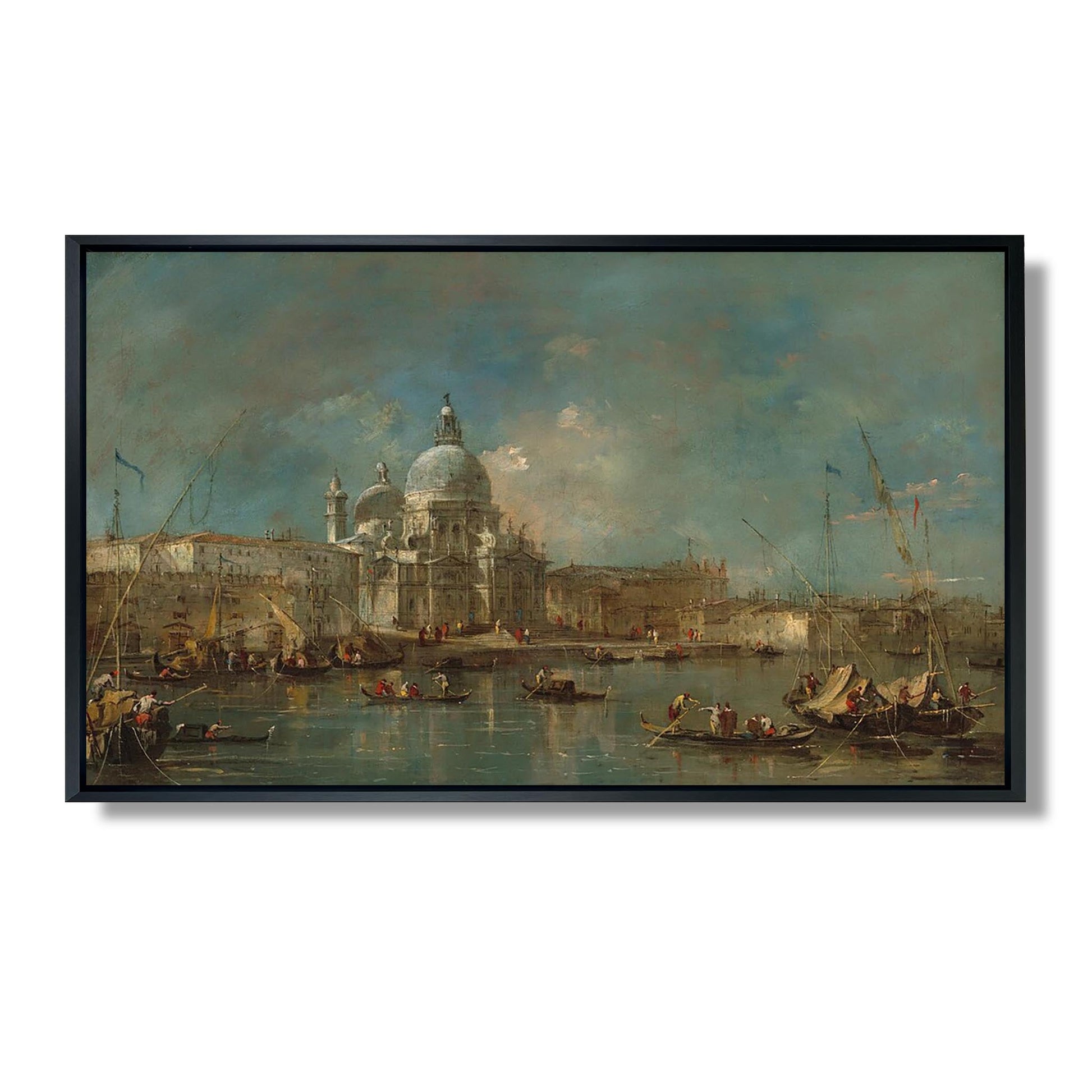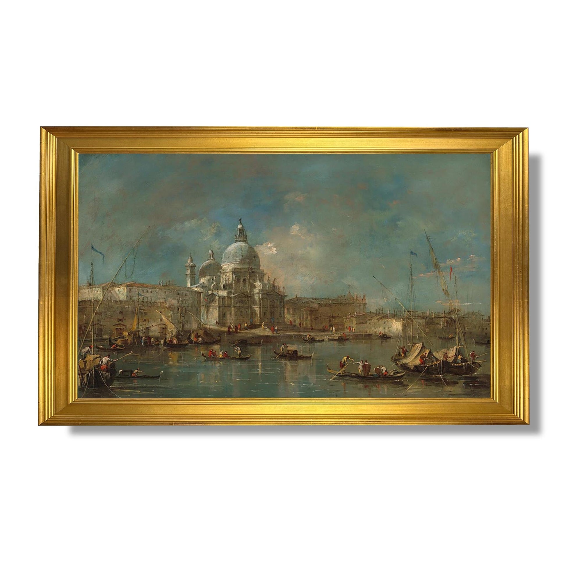 Francesco Guardi, peintre vénitien du XVIIIe siècle, est célèbre pour ses paysages et scènes de la vie quotidienne. Son œuvre "Santa Maria della Salute" illustre la majesté de cette église emblématique, érigée en remerciement pour la fin de la peste. Dans cette toile, Guardi capture la lumière vénitienne avec une palette délicate, mettant en valeur les reflets sur l'eau et l'architecture baroque. Les bateaux et les figures humaines ajoutent une dimension vivante à la scène, témoignant de l'animation de la lagune. Ce tableau incarne l'essence de Venise, alliant beauté et spiritualité.